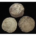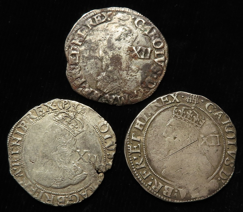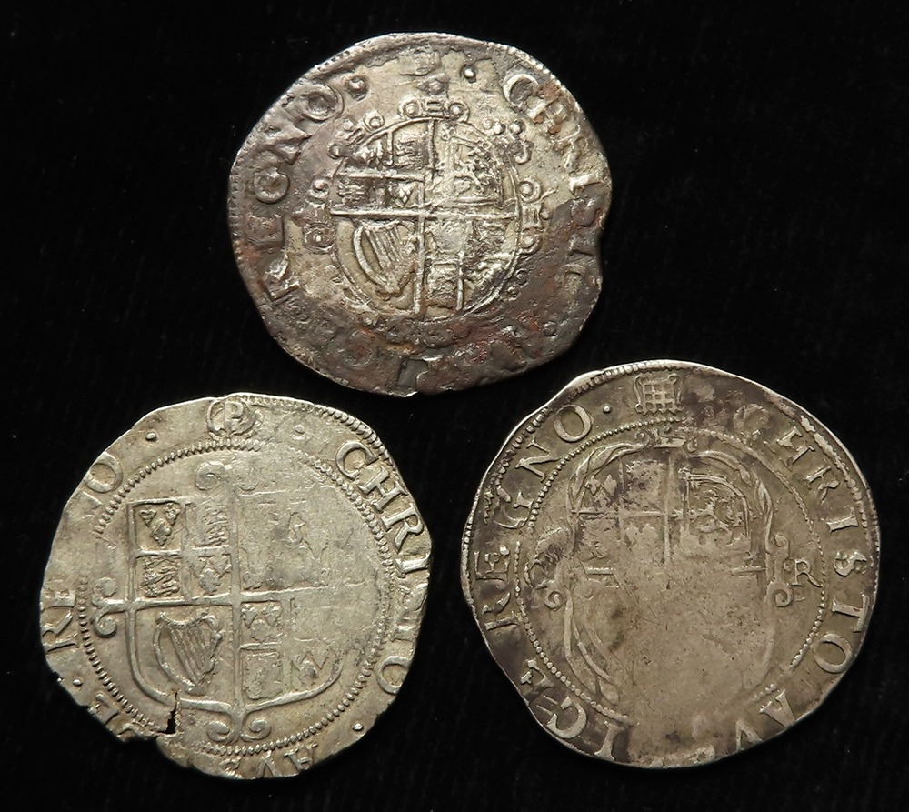 Charles I hammered silver Shillings (3): Group D, mm. portcullis, S.2789, VG scratch; mm. tun, S.2791-2, fair/VG; and Group G (under Parliament) mm. (P), S.2800, F-GF edge split.