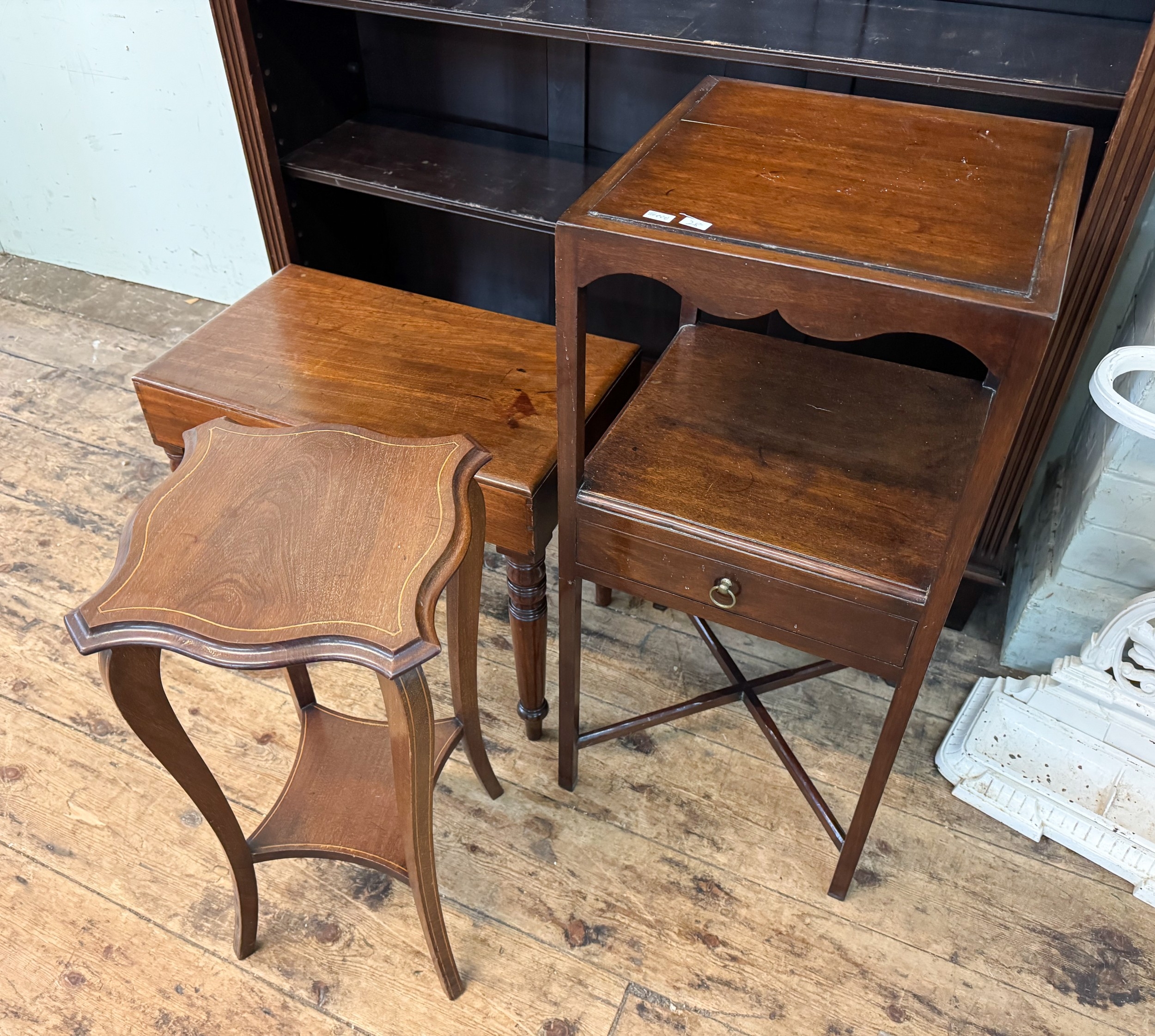 A Georgian style mahogany wash stand/plant table together with a two tier plant stand and a bidet (cabinet only)