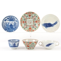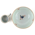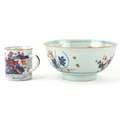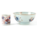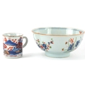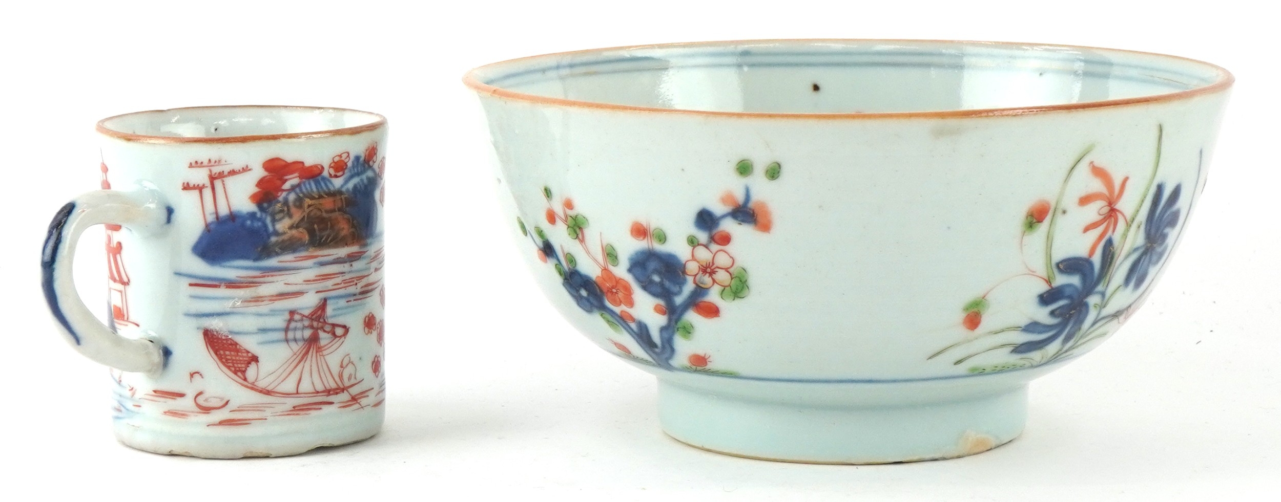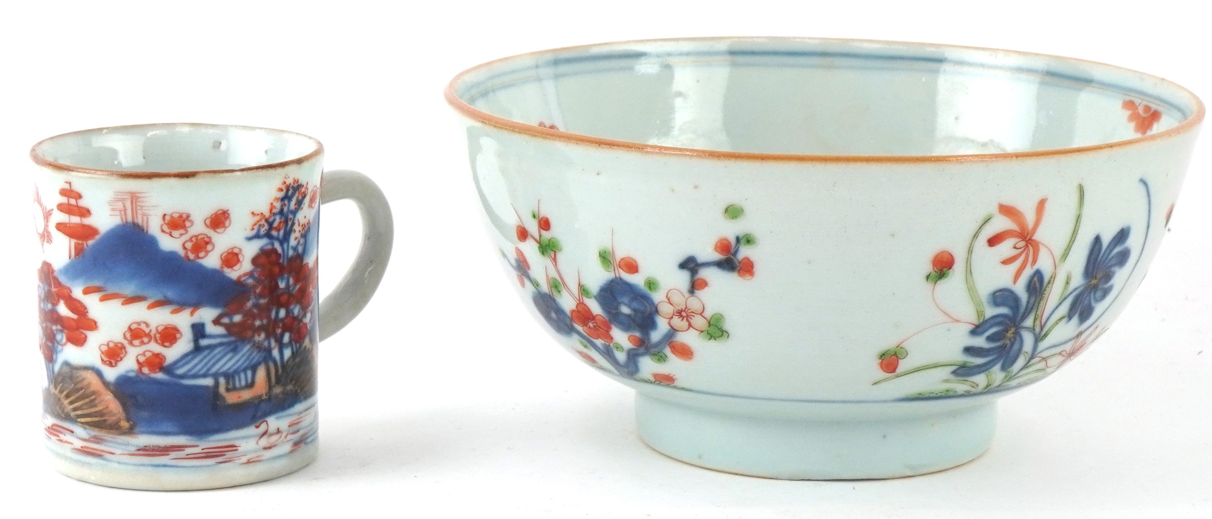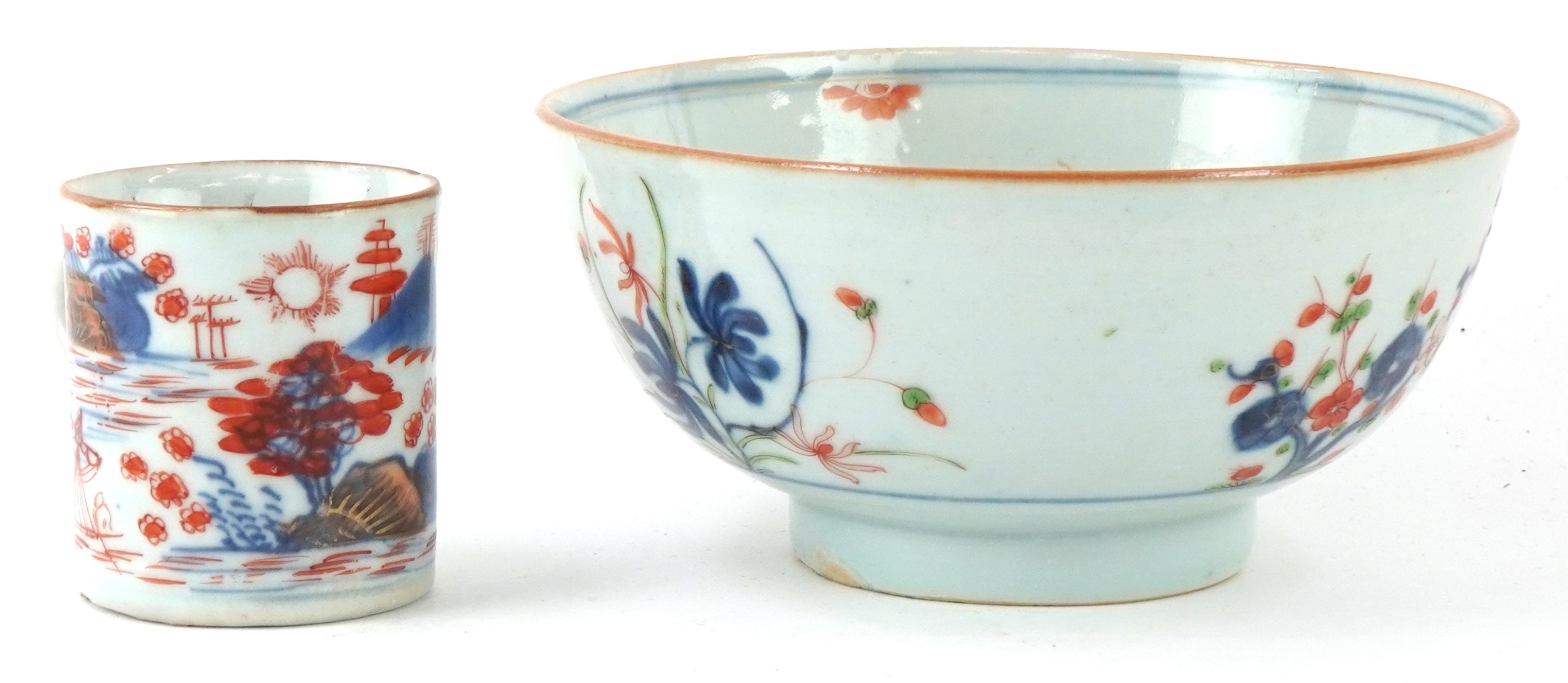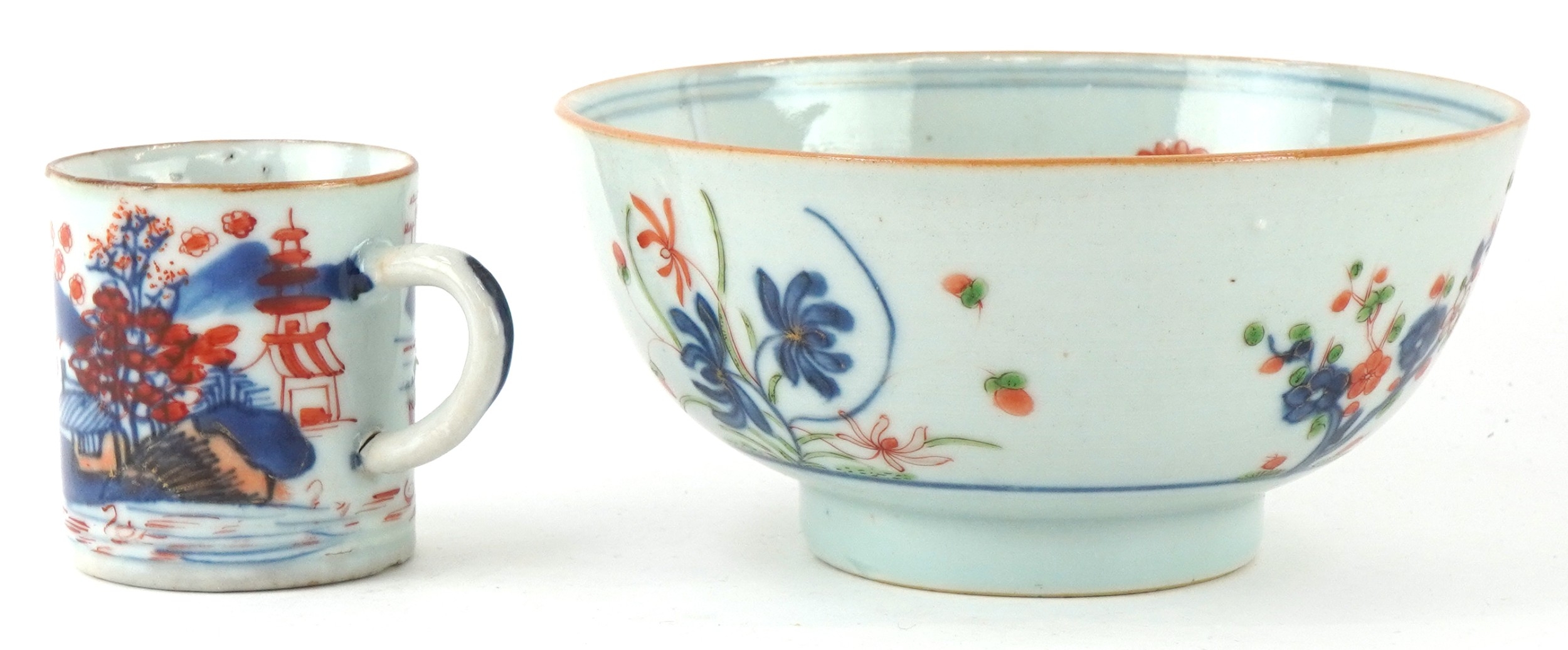 Chinese porcelain comprising a footed bowl with hand painted floral decoration and a coffee can painted with a rural landscape, the largest 7cm high x 15cm in diameter.