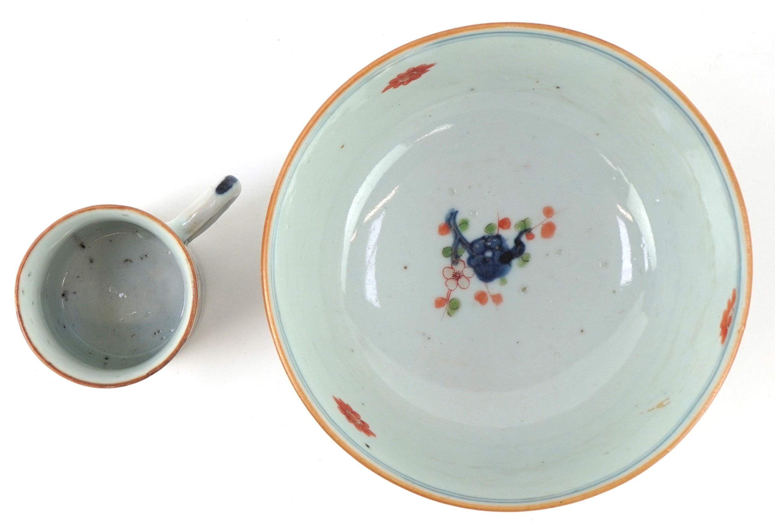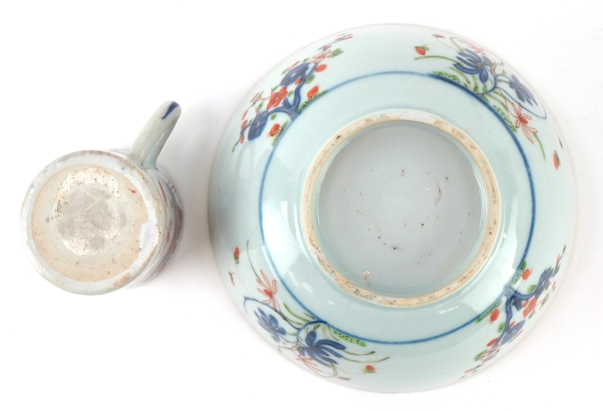 There is a stress crack to the handle of the cup. The cup and bowl have a 2cm chip to the foot rims. As per the online images