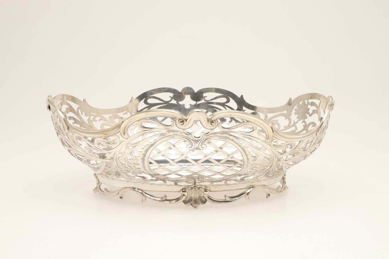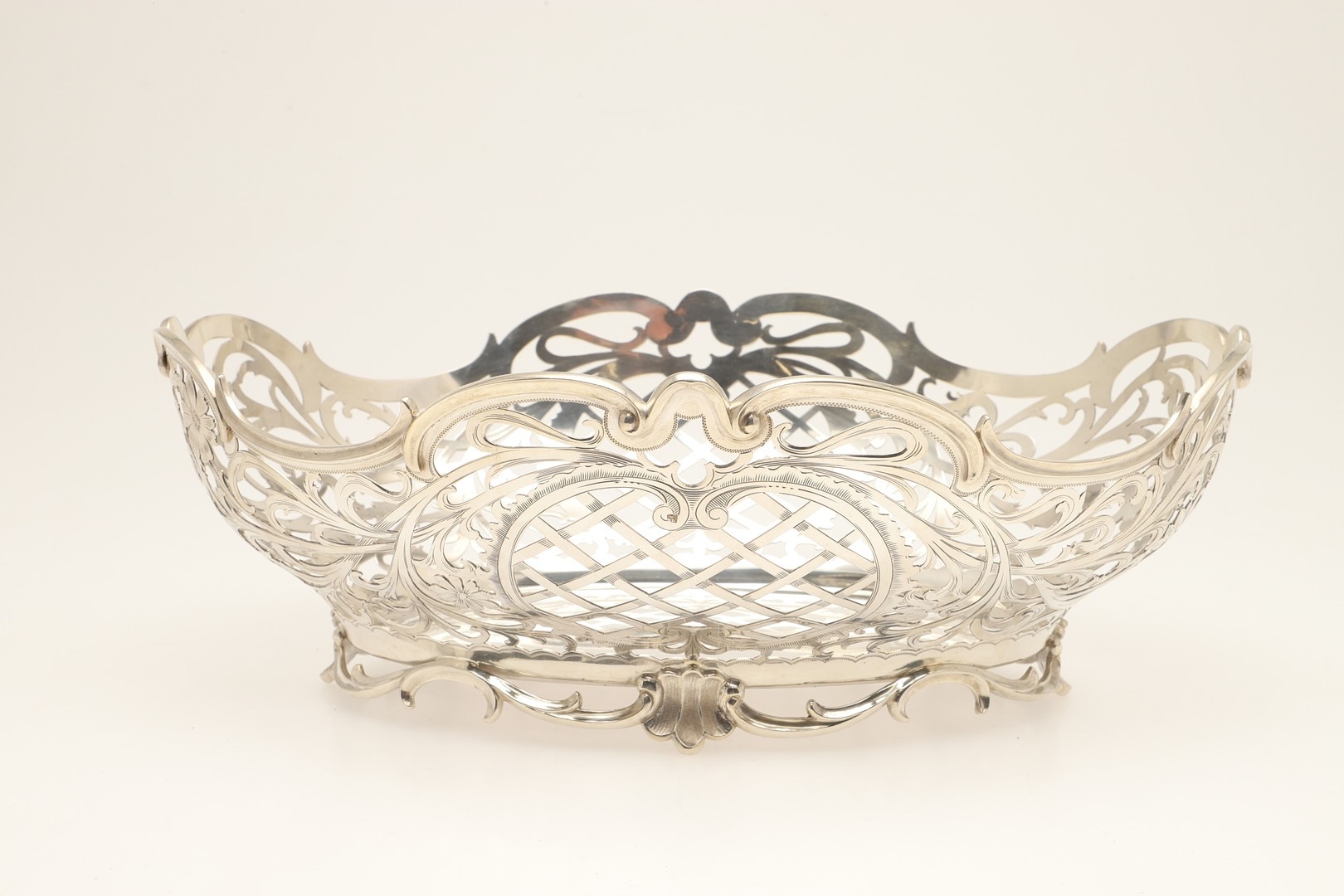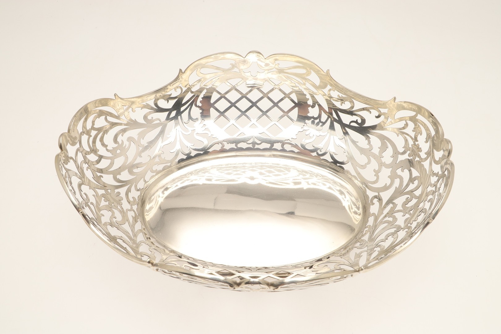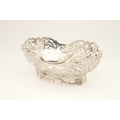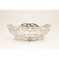 A DUTCH SILVER BREAD BASKET. Of shaped oval form, decorated with pierced foliate scrolls and lattice decoration, raised on a shaped oval foot. With Dutch Lion passant hallmark of .833 fineness. Height 12cm x Width 33.5cm x Depth 26.5cm. Weight 28.8ozt.
