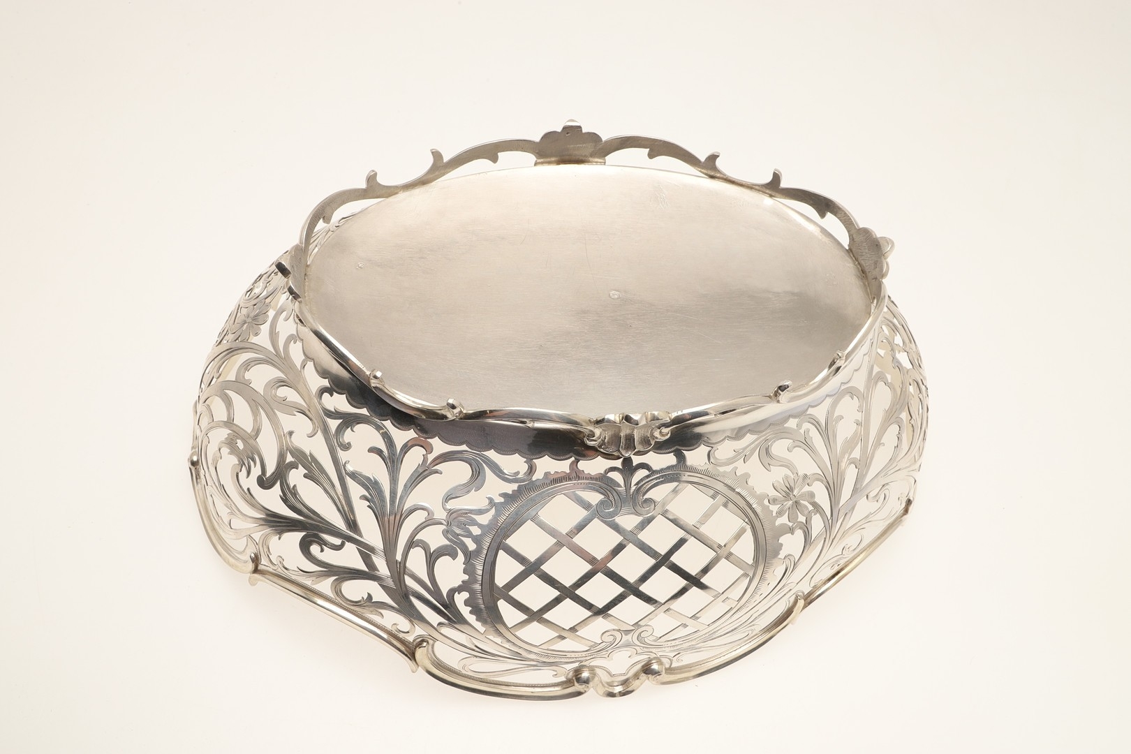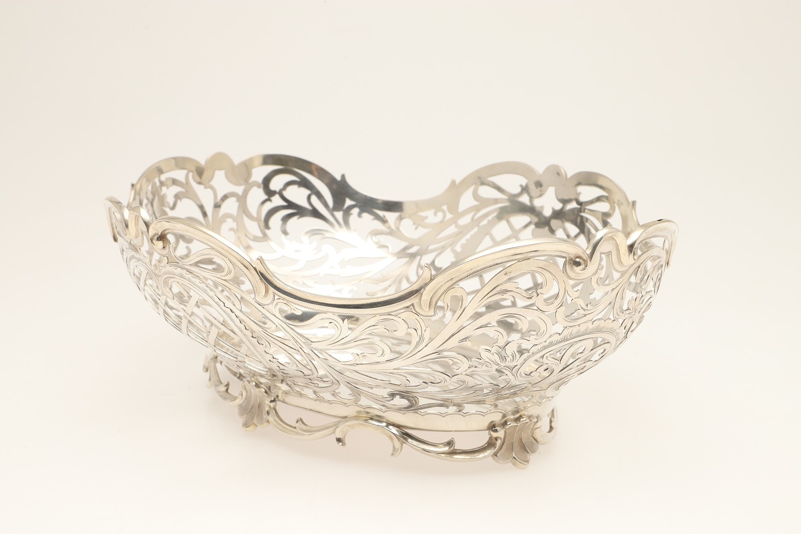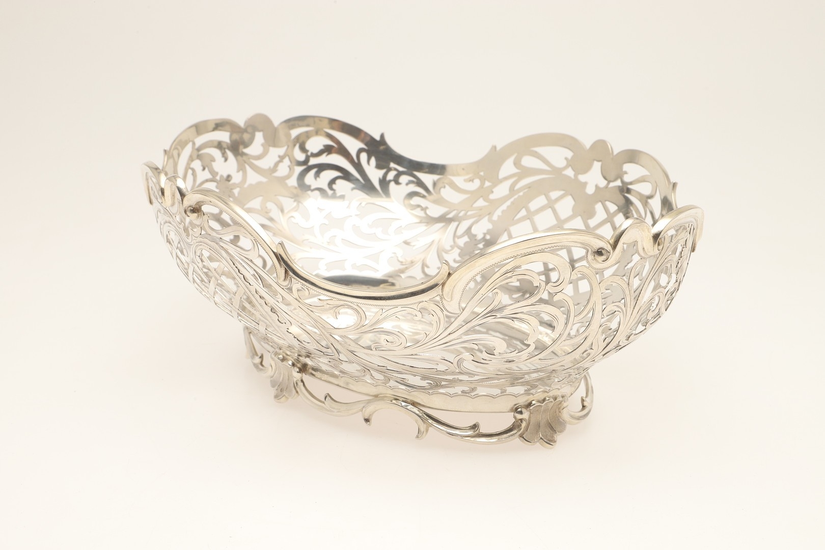 A DUTCH SILVER BREAD BASKET. Of shaped oval form, decorated with pierced foliate scrolls and lattice decoration, raised on a shaped oval foot. With Dutch Lion passant hallmark of .833 fineness. Height 12cm x Width 33.5cm x Depth 26.5cm. Weight 28.8ozt.