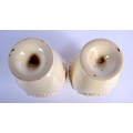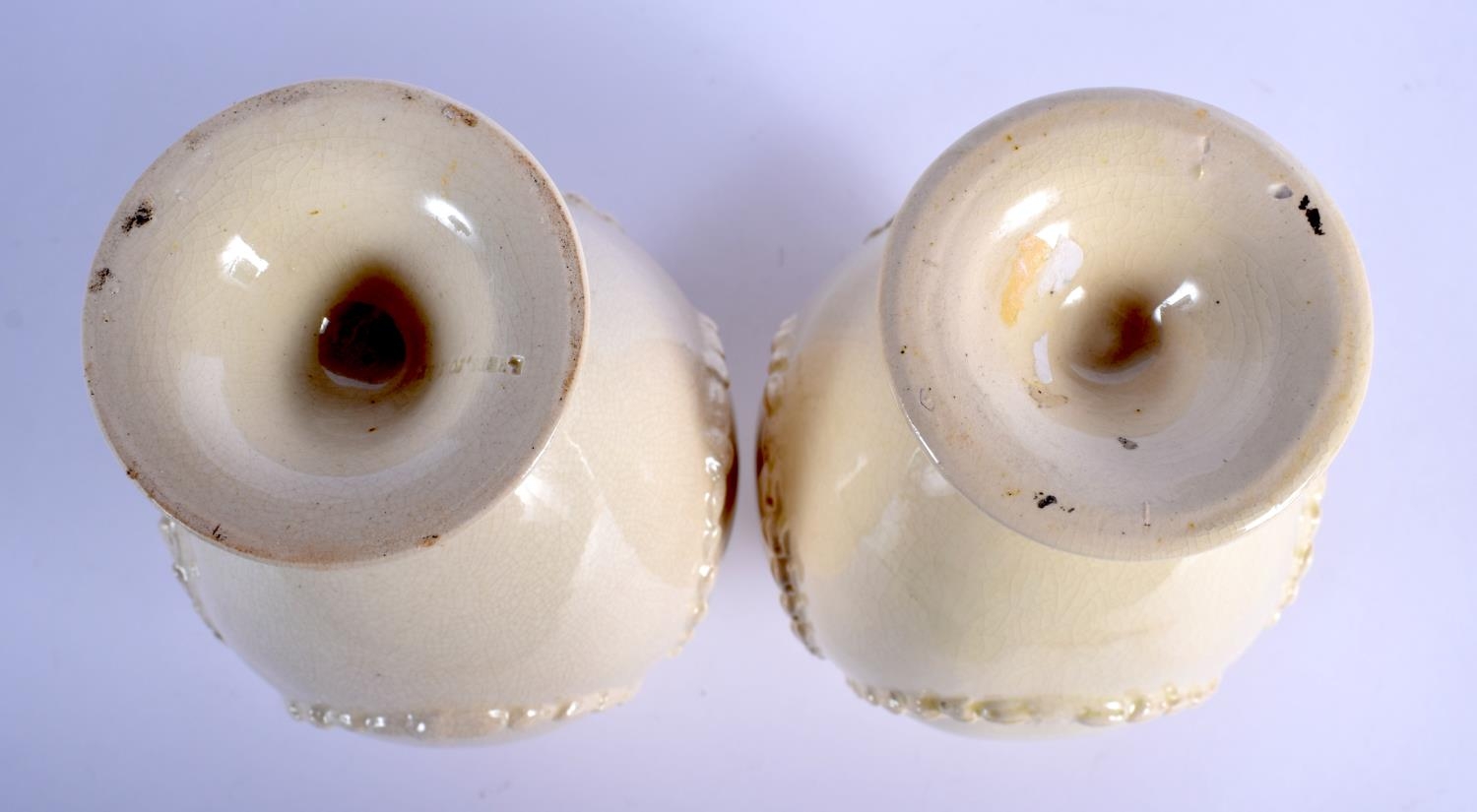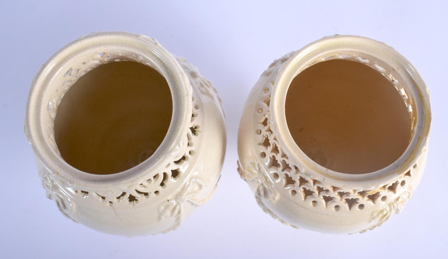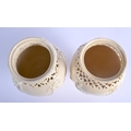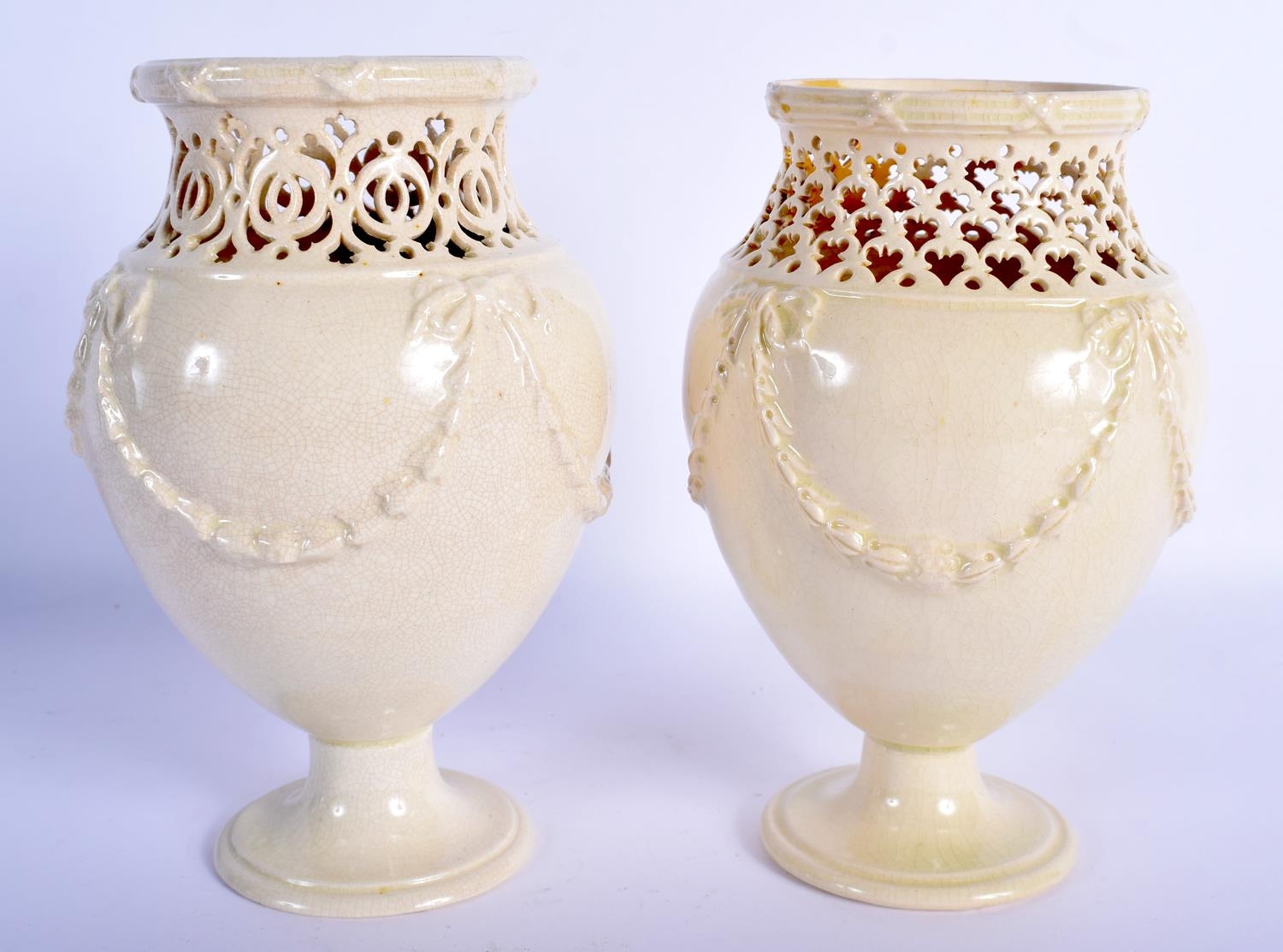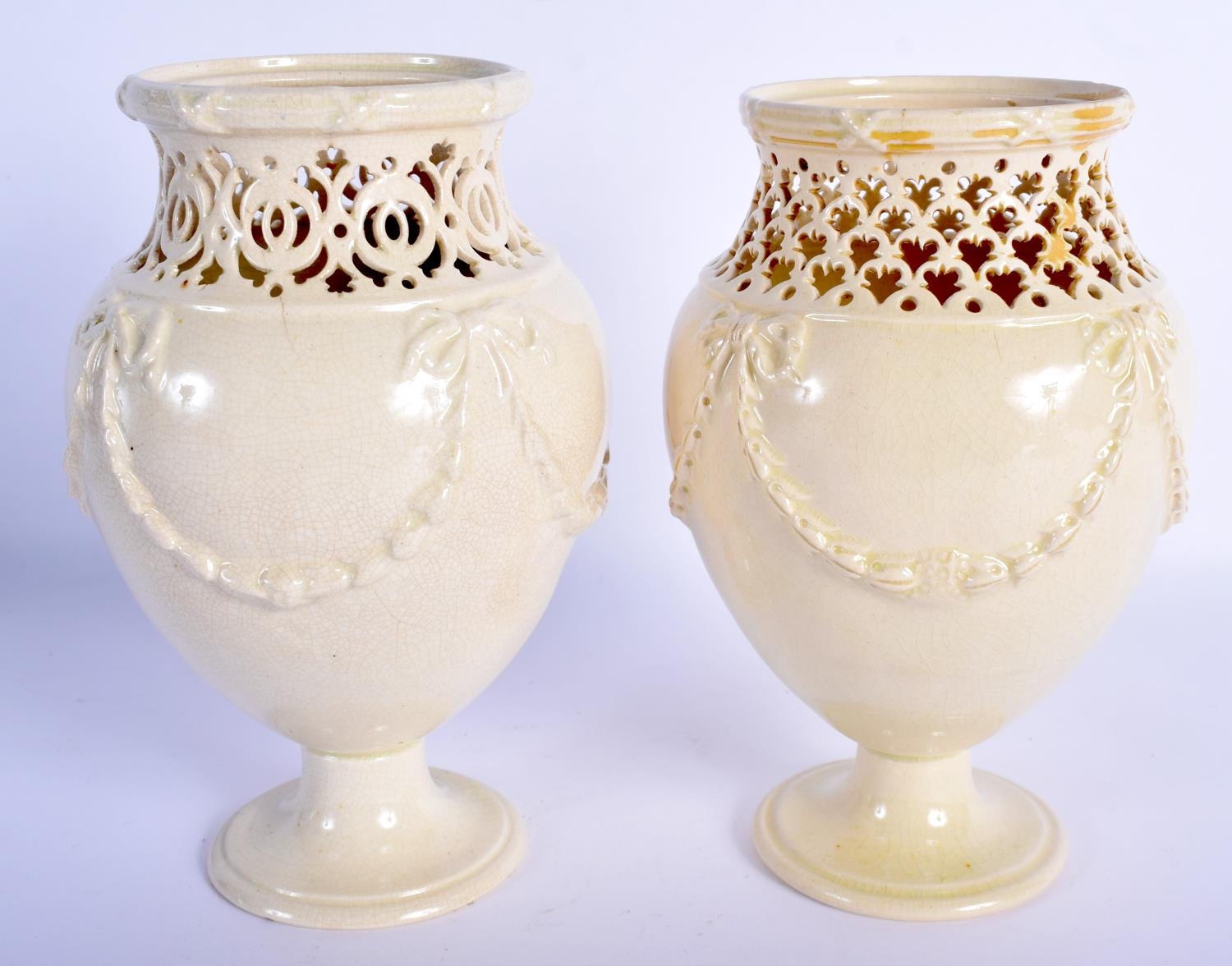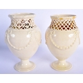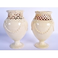 A PAIR OF LATE 18TH CENTURY LEEDS CREAMWARE RETICULATED VASES with moulded overlaid swags and vines. 17 cm high.