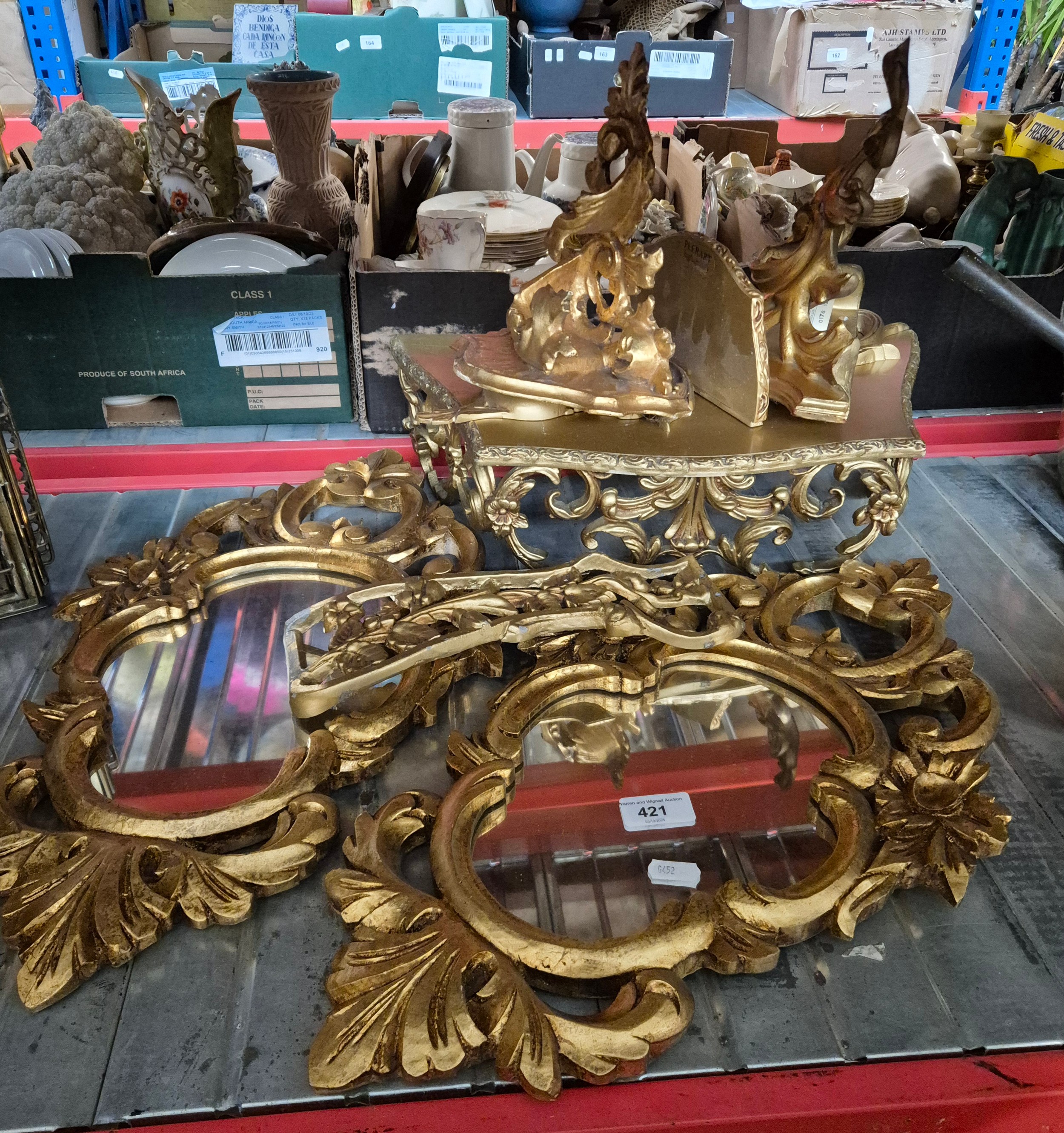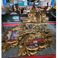 A selection of gilt painted wood framed mirrors together with wall fitments.