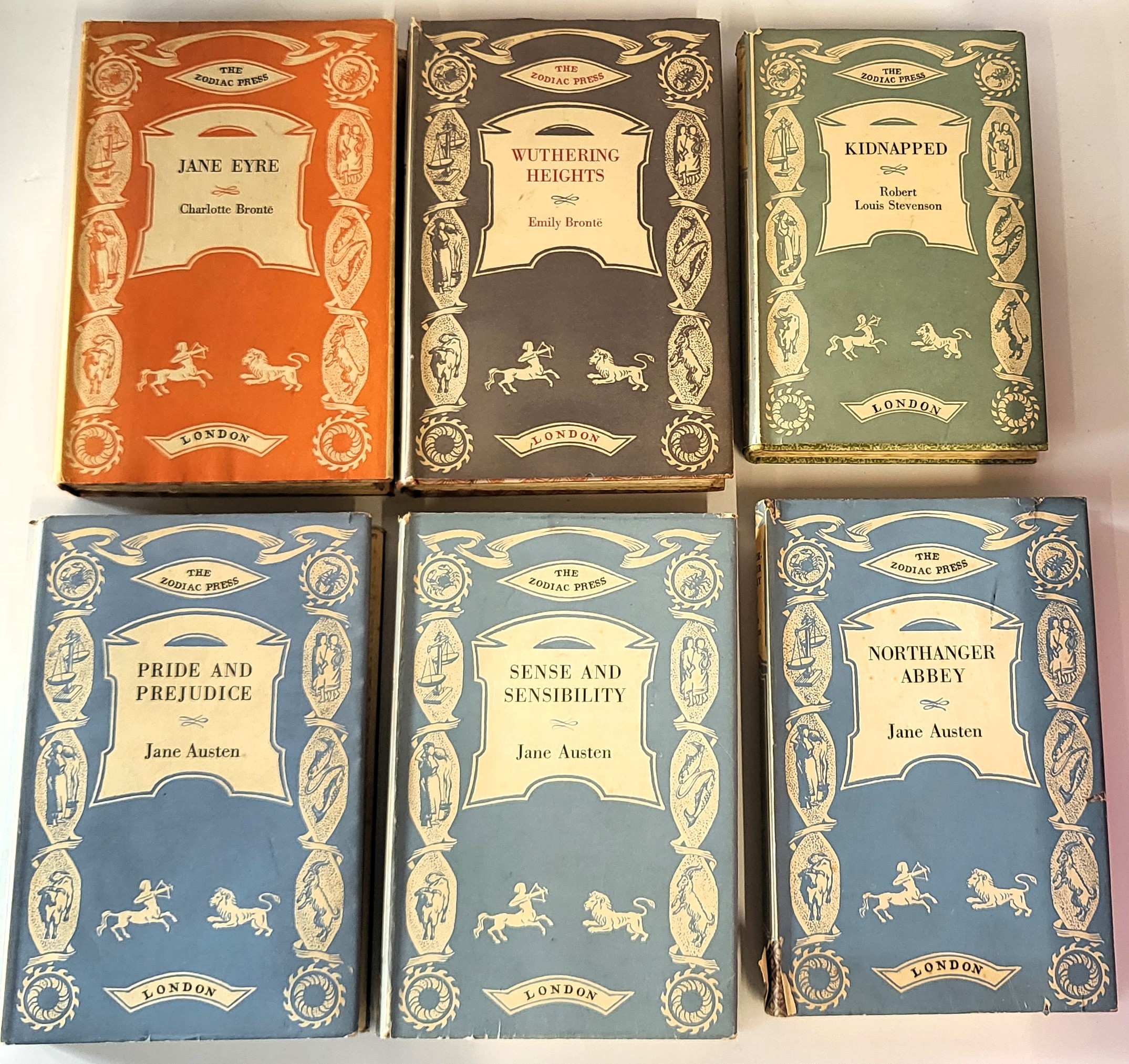 A collection of six classic novels to include Jane Austen's Pride and Prejudice, Sense and Sensibility and Northanger Abbey. Charlotte Bronte's Jane Eyre, Emily Bronte's Wuthering Heights and Robert Louis Stevenson's Kidnapped, printed by The Zodiac Press in 1946 and presented in hardback all with original dust jackets. Good condition for age.