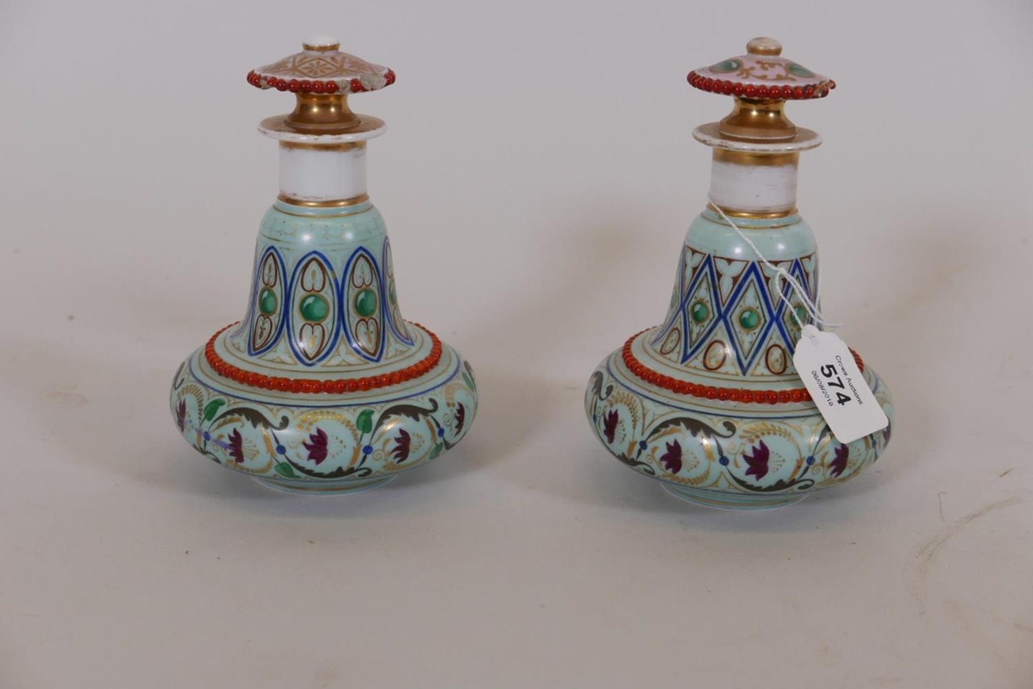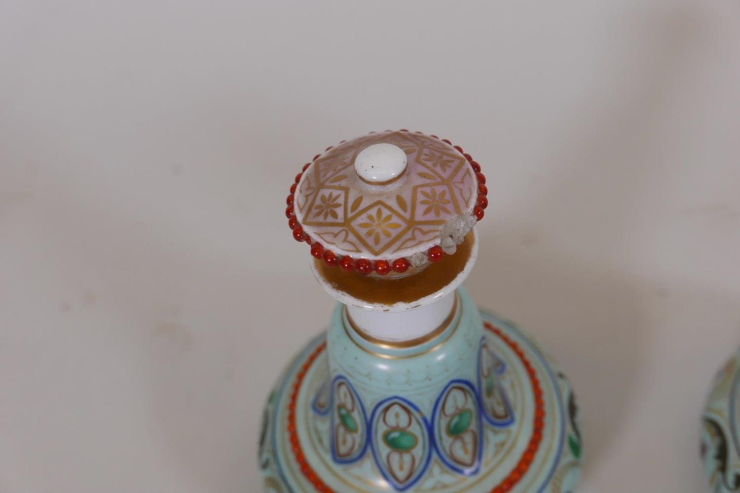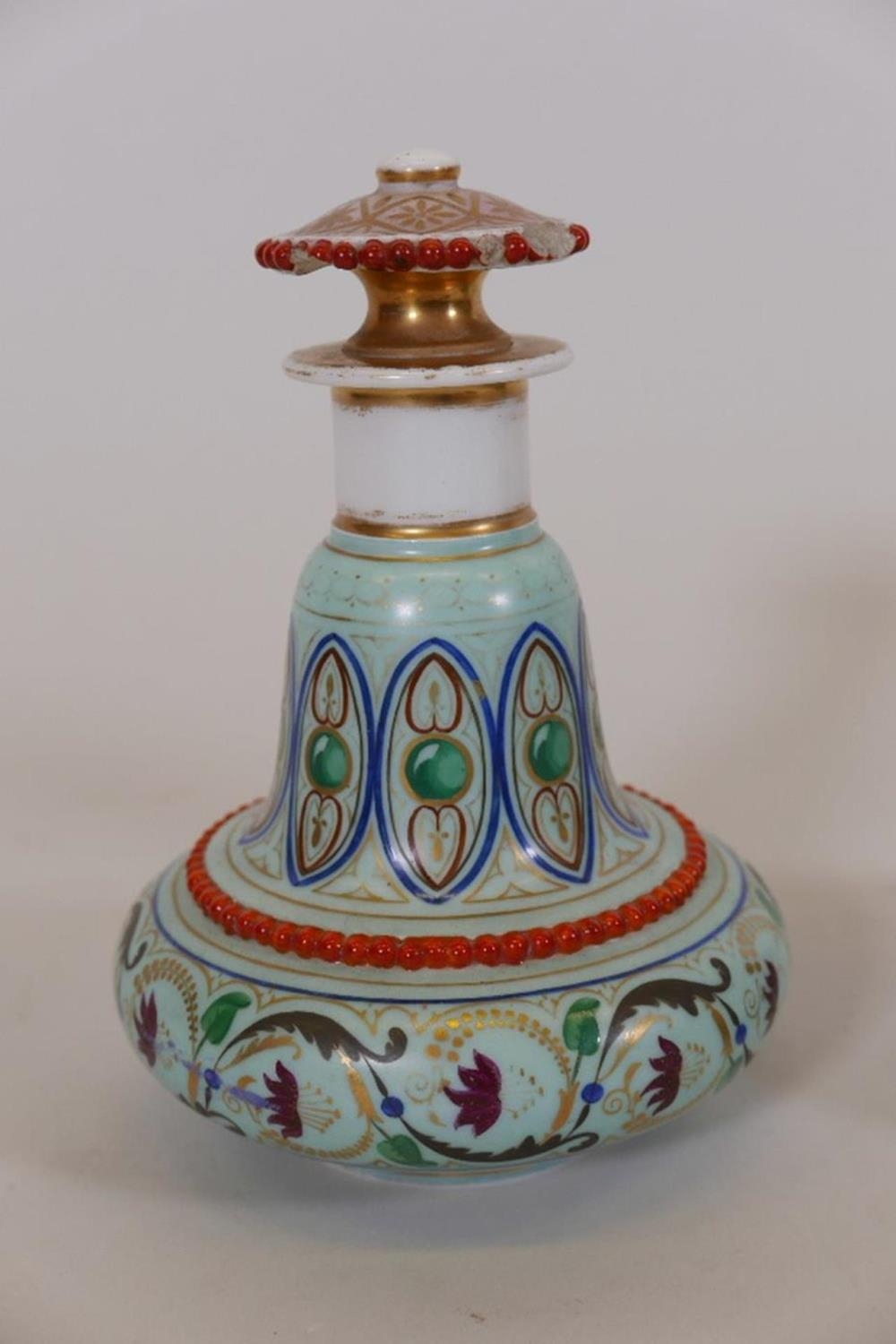 Two similar C19th Continental opaline glass bottles and stoppers, with hand painted and gilded decoration, A/F losses and repairs, 6½" high