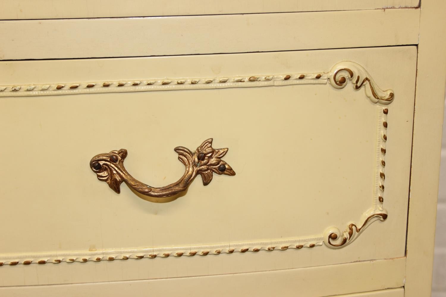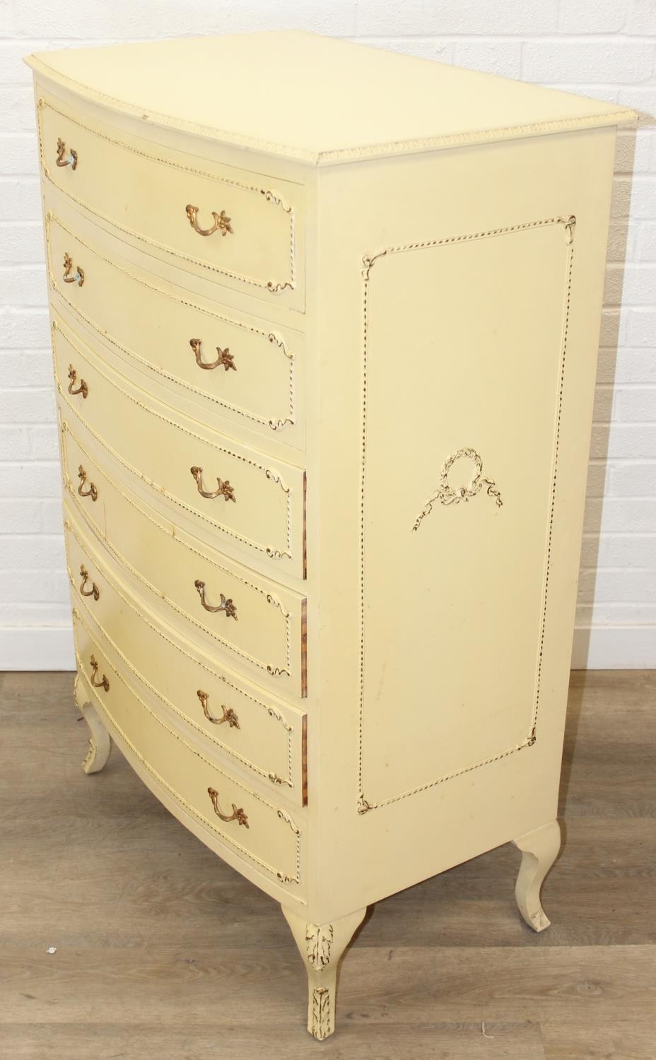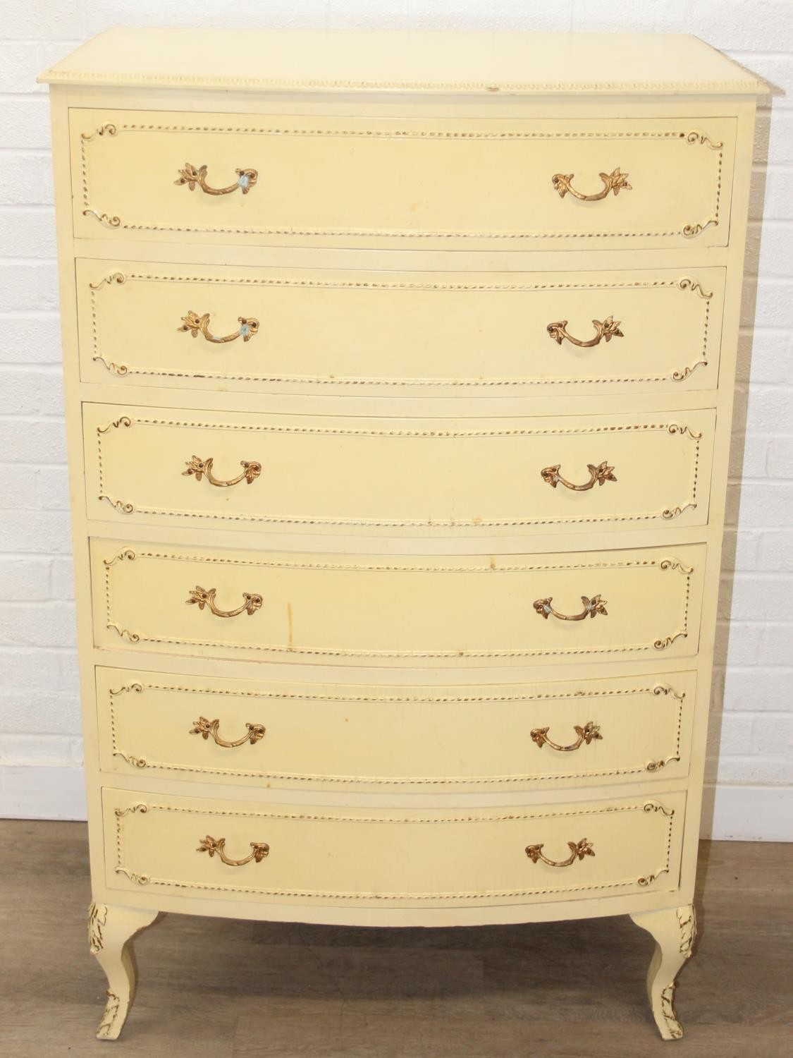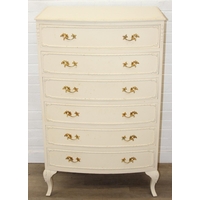 Rococo style cream finished six drawer chest with decorative gilt metal handles, 78cm x 49cm x 125cm
