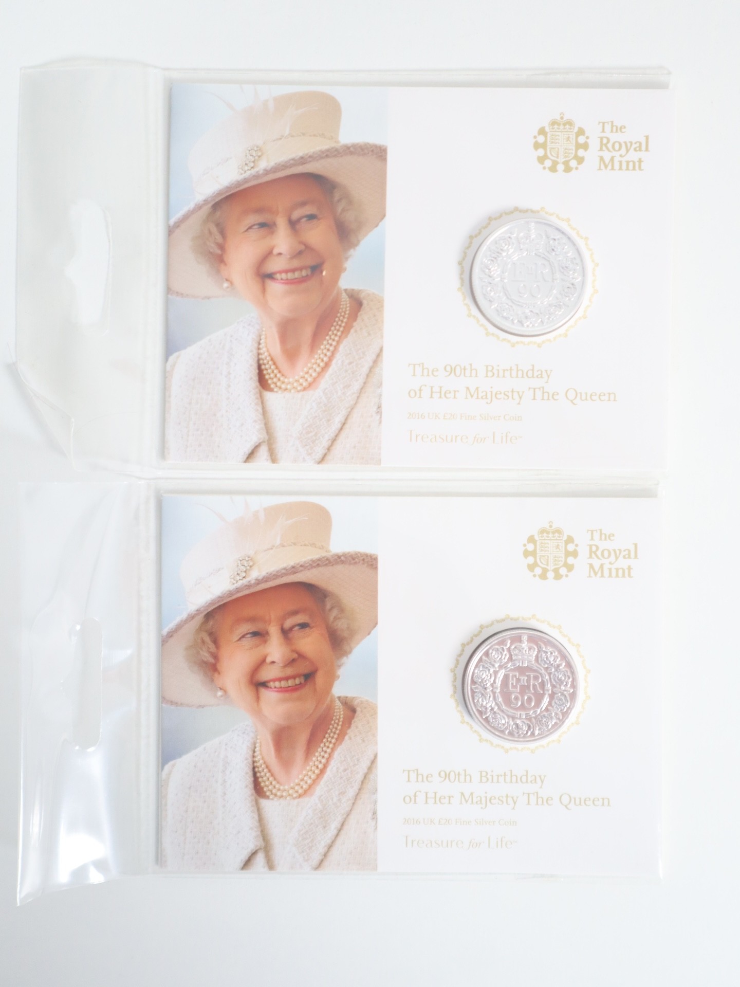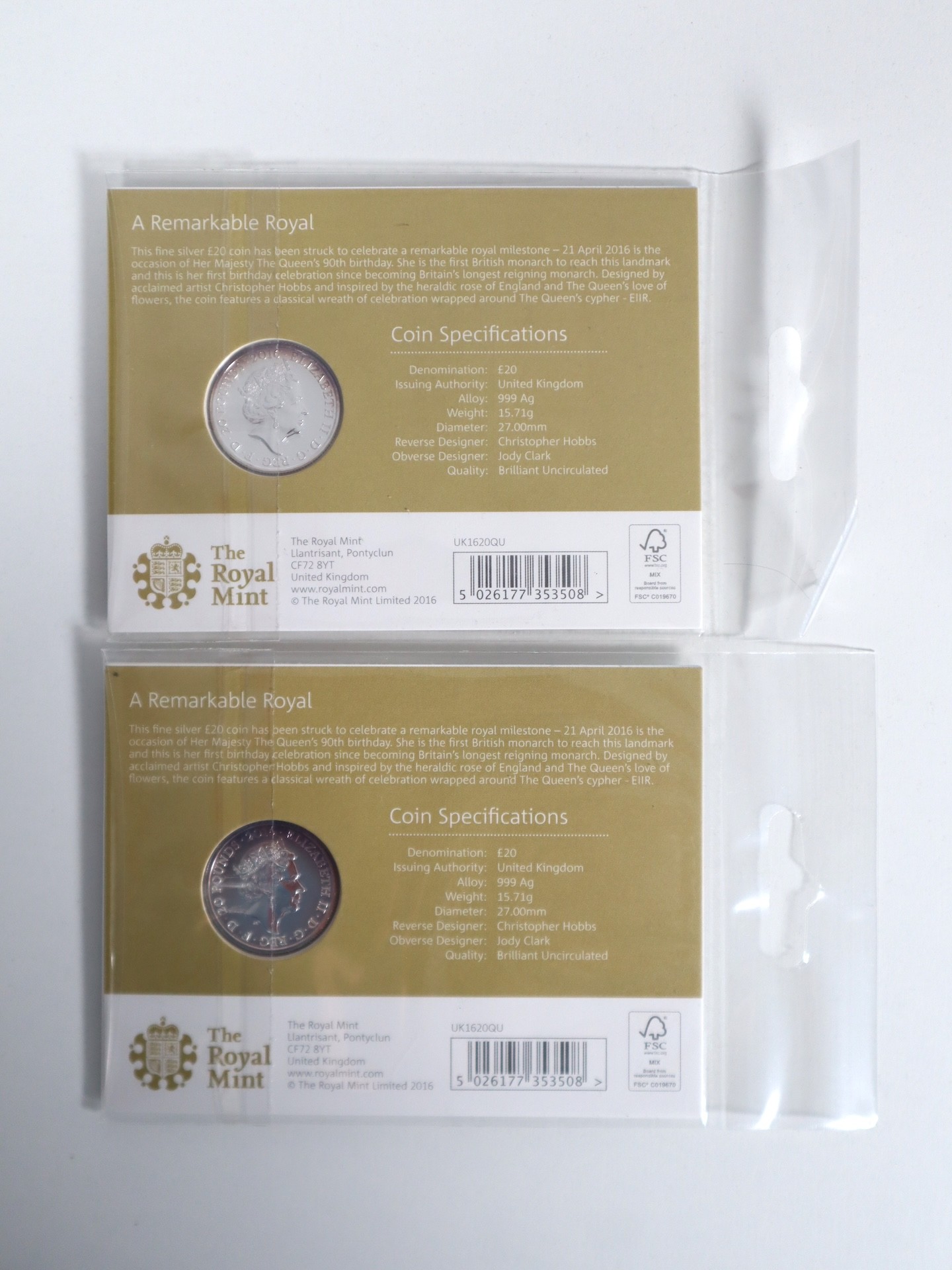 Two The 90th Birthday of Her Majesty The Queen 2016 UK £20 Fine Silver Brilliant Uncirculated Coin 999Ag 15.71g each