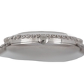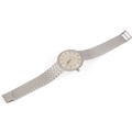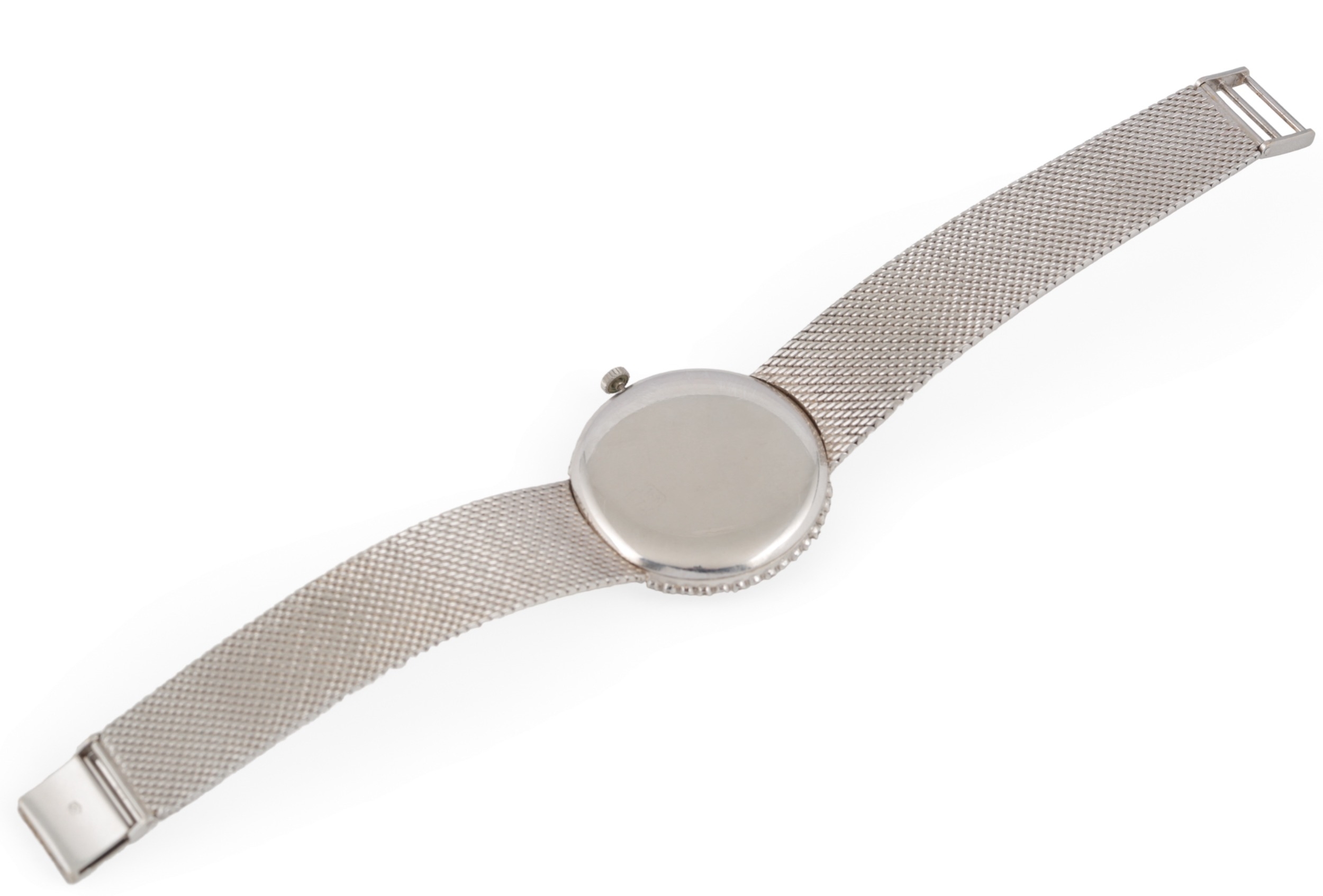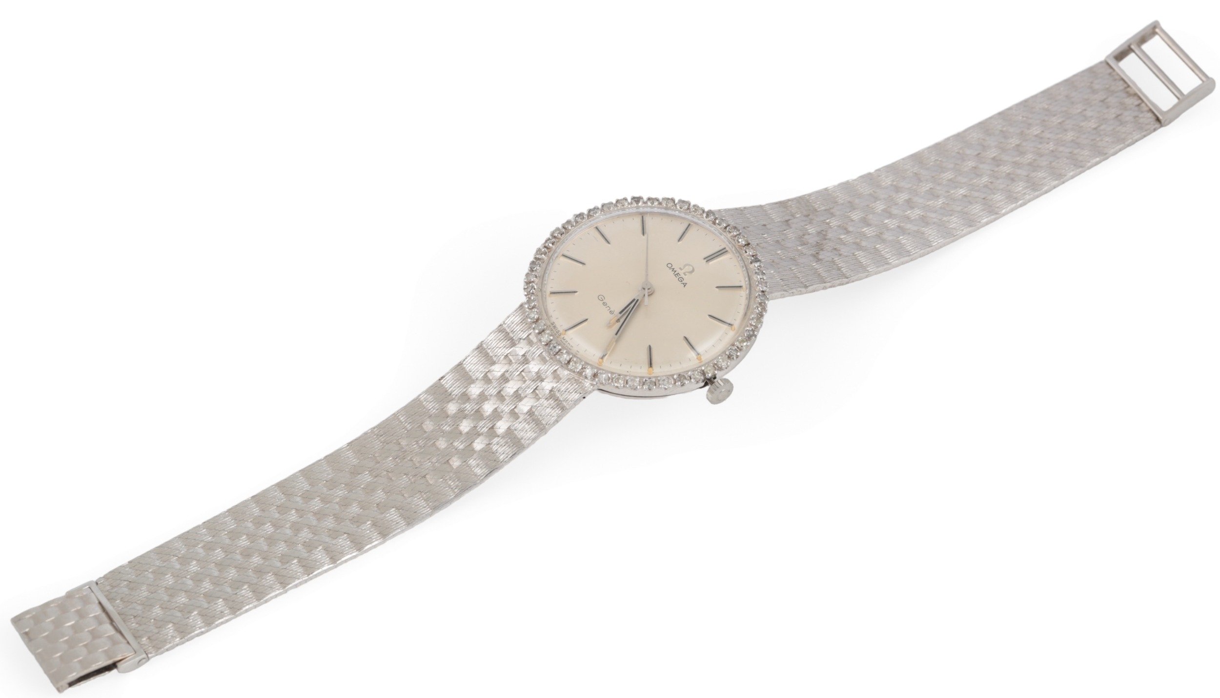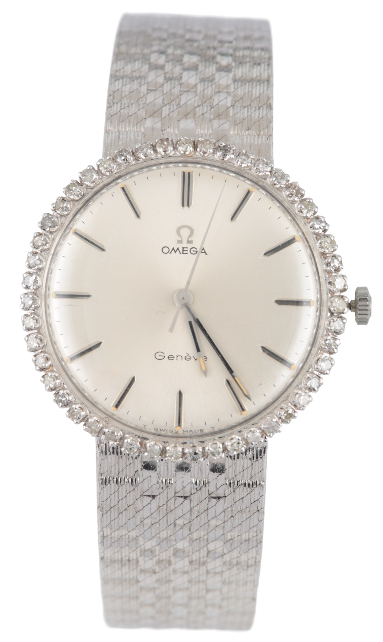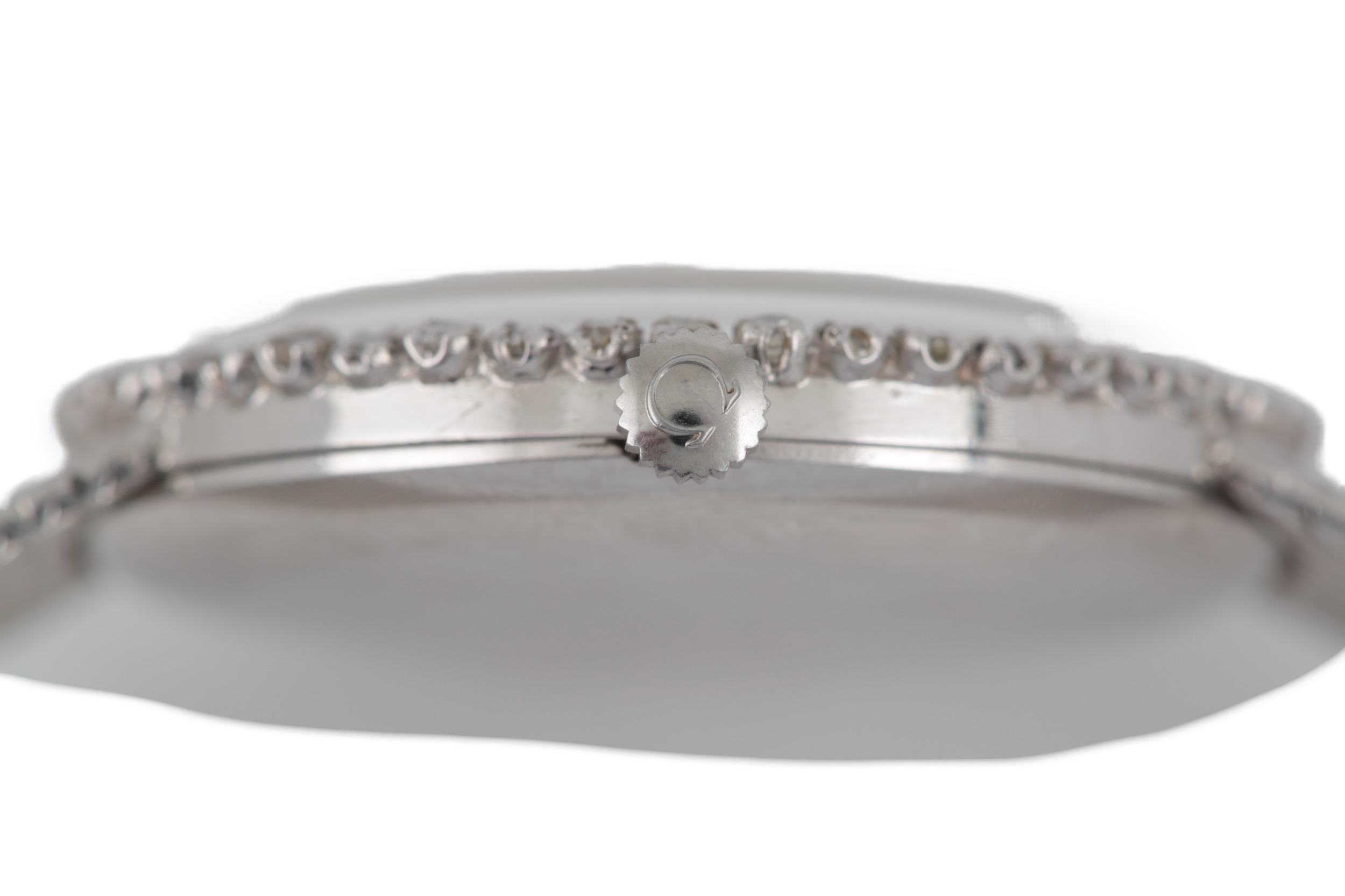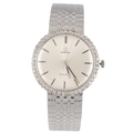 A gentleman's 18k white gold and diamond set Omega manual wind dress wrist watch, with baton numerals and bezel set with forty seven round cut diamonds, movement c.610, on an associated integral white metal bracelet stamped 750, bracelet length overall 19.8cm, gross weight 76 grams., no box or papers.