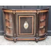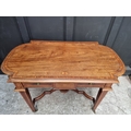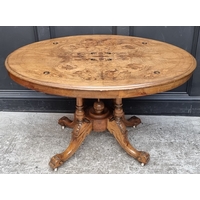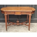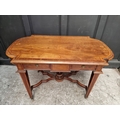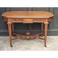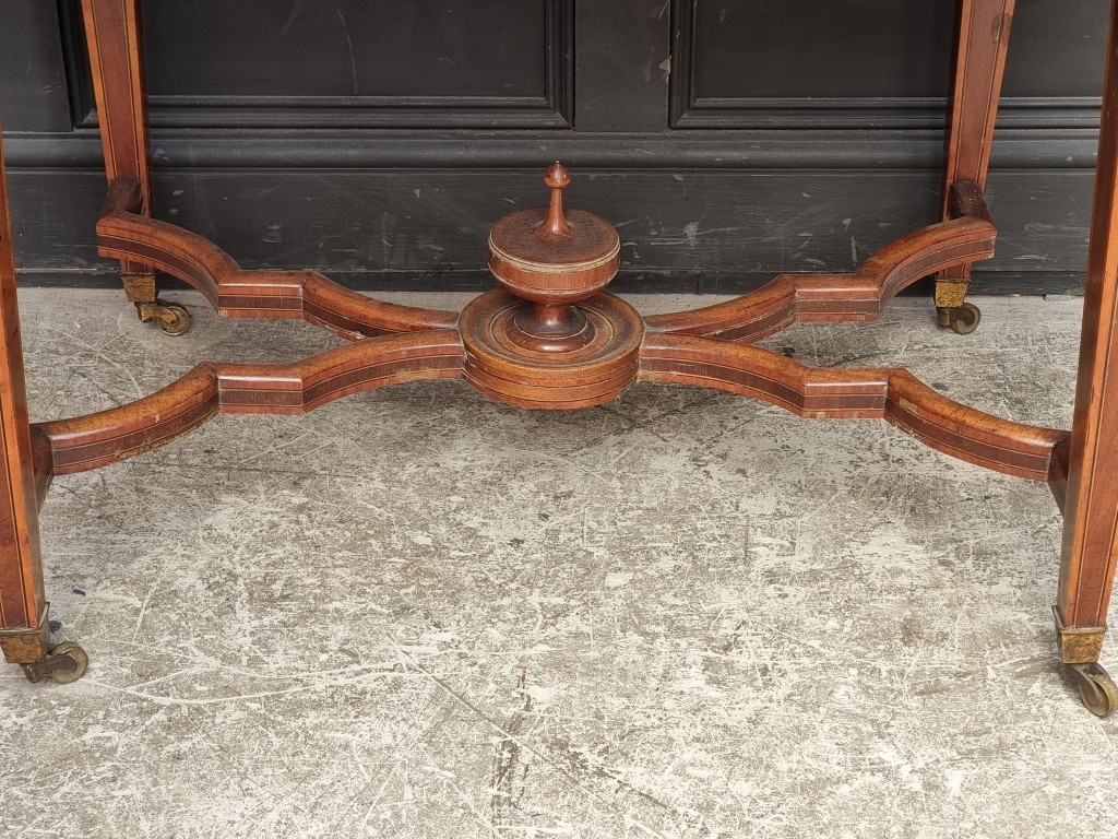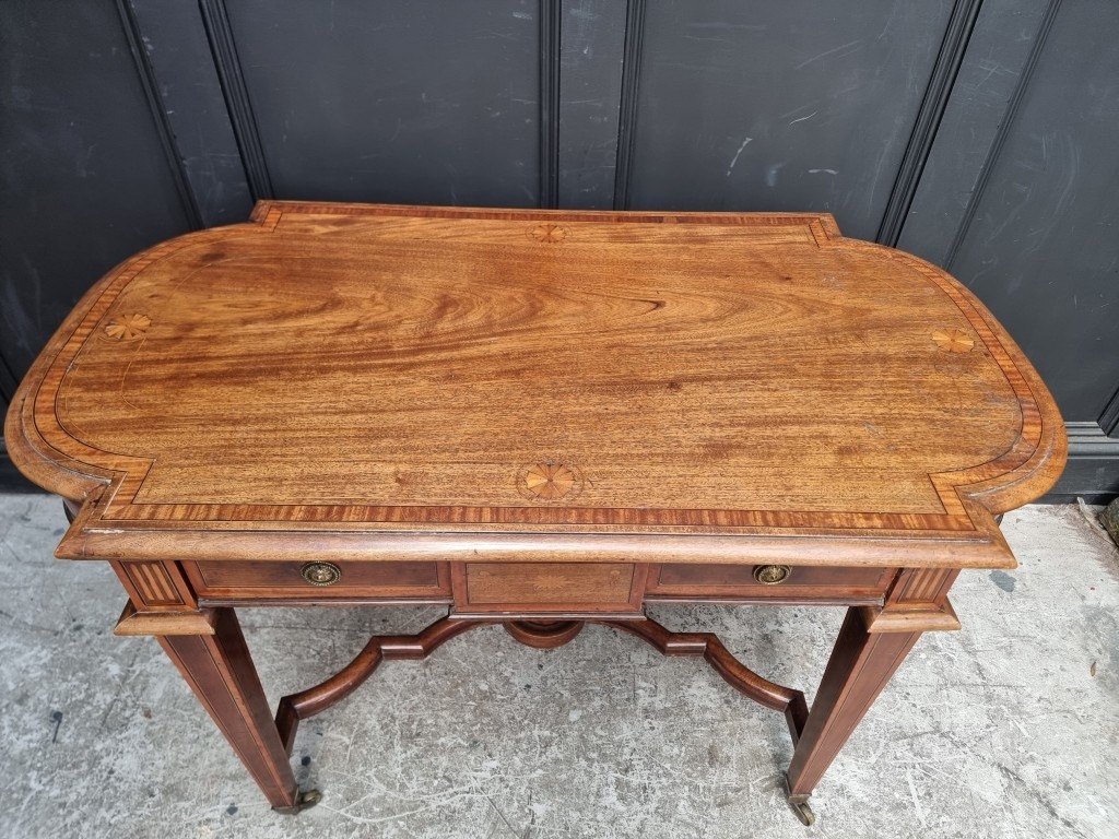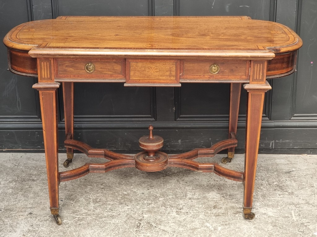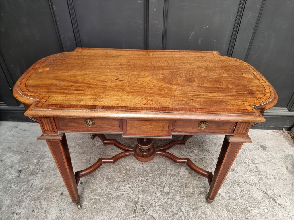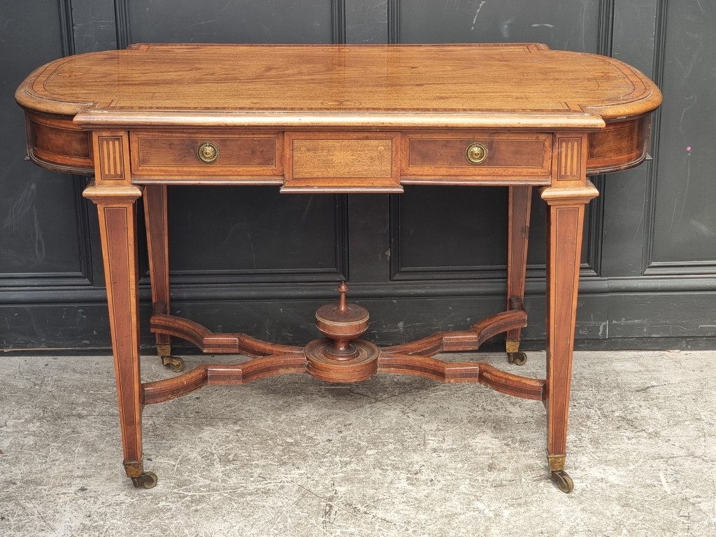 A late Victorian mahogany, satinwood crossbanded and inlaid centre table, with a frieze drawer and opposing dummy drawer, 121.5cm wide.