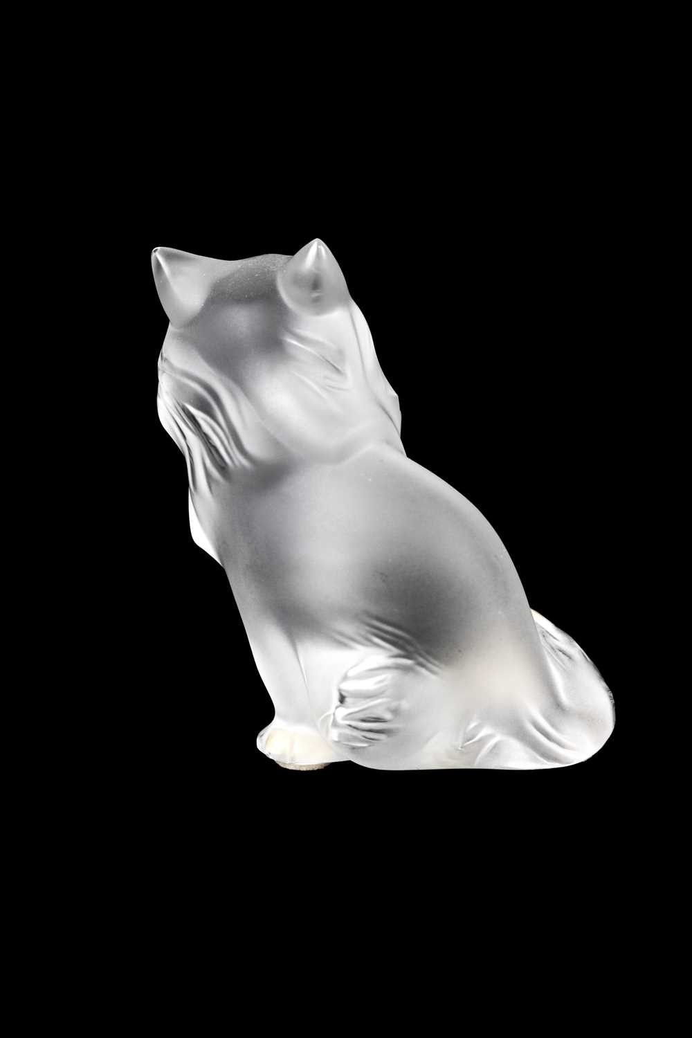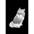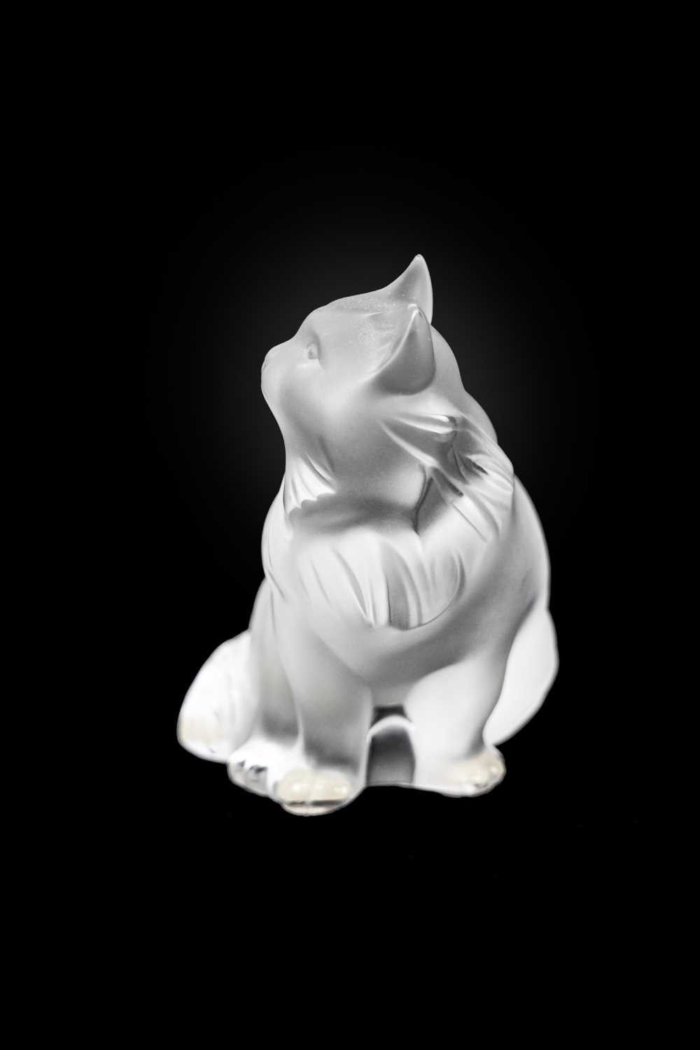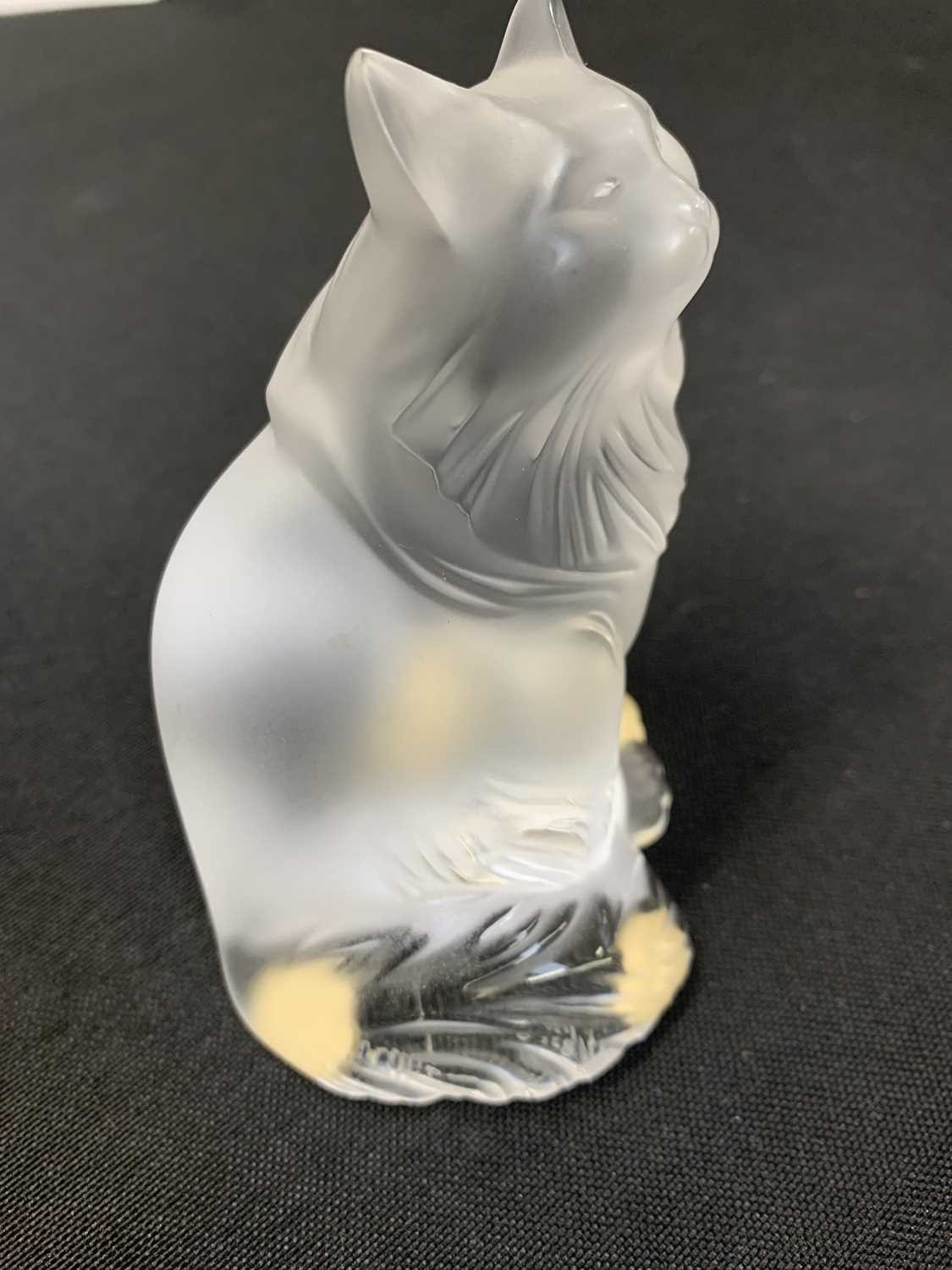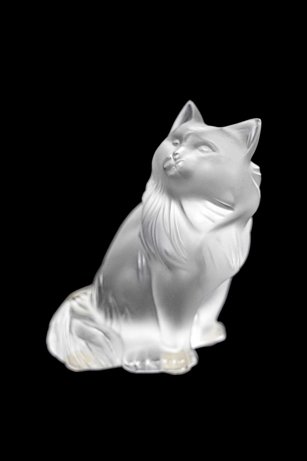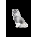 A Lalique crystal 'Heggie' cat figure. Frosted design of a seated cat, etched signature to the base 'Lalique France', with four protective pads to the base, height 9cm. No obvious issues on Heggie, other than a few light marks to the front, photographs have been added to try and show these.