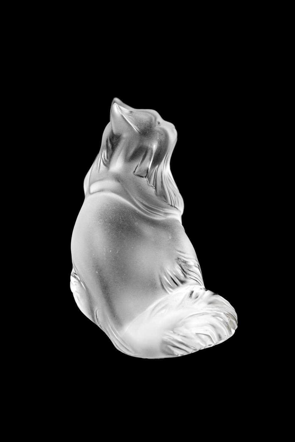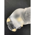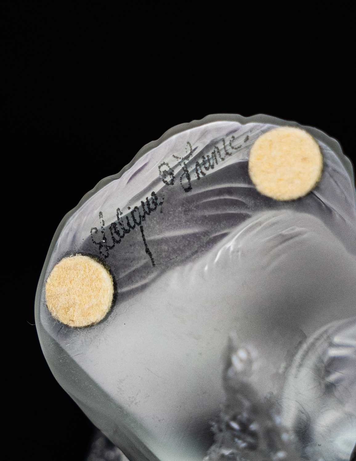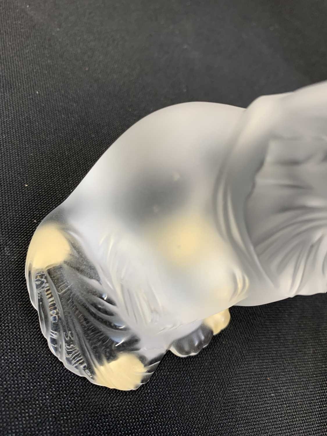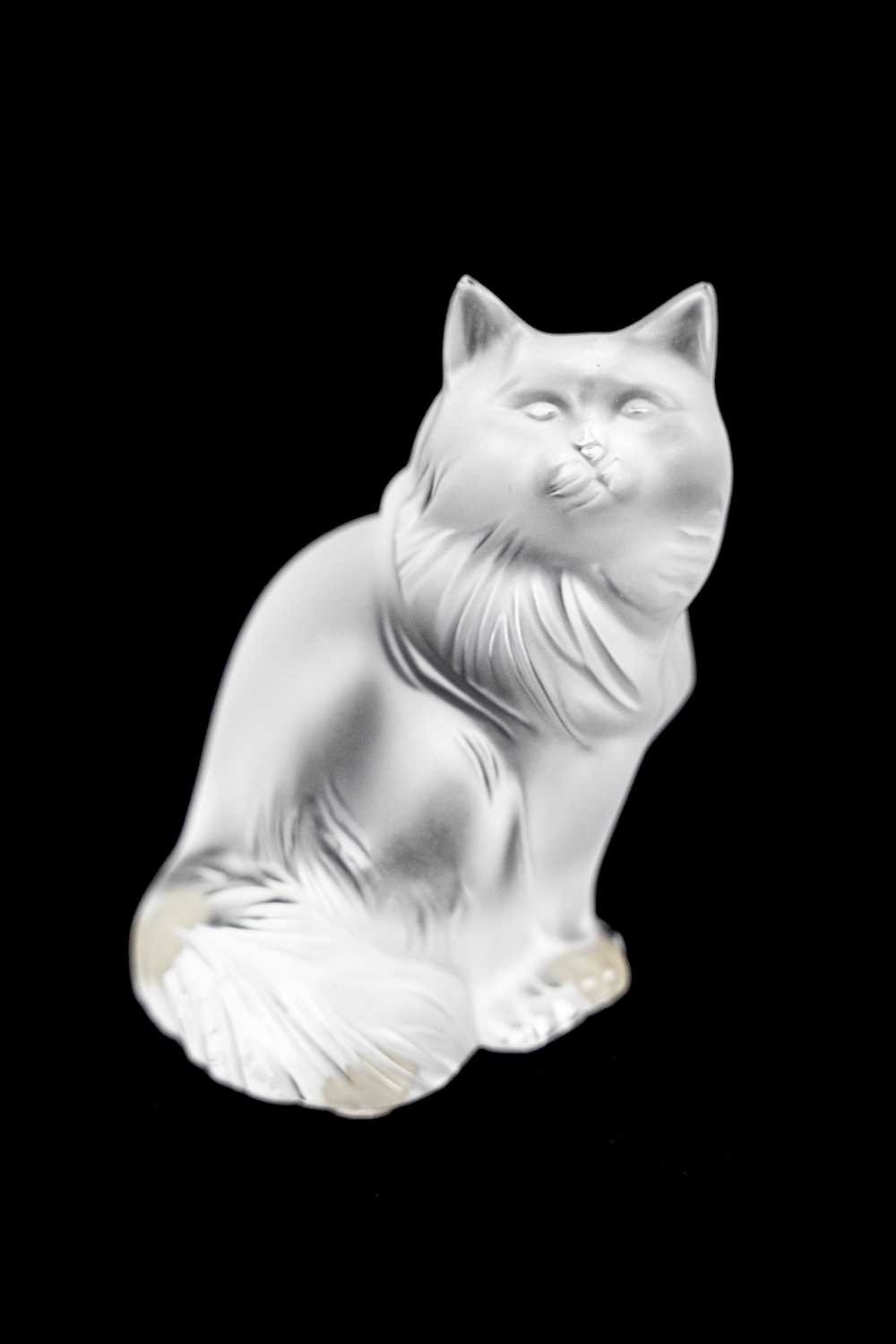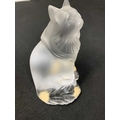 A Lalique crystal 'Heggie' cat figure. Frosted design of a seated cat, etched signature to the base 'Lalique France', with four protective pads to the base, height 9cm. No obvious issues on Heggie, other than a few light marks to the front, photographs have been added to try and show these.