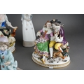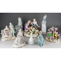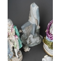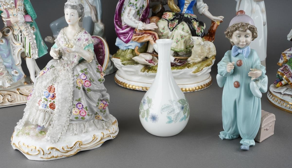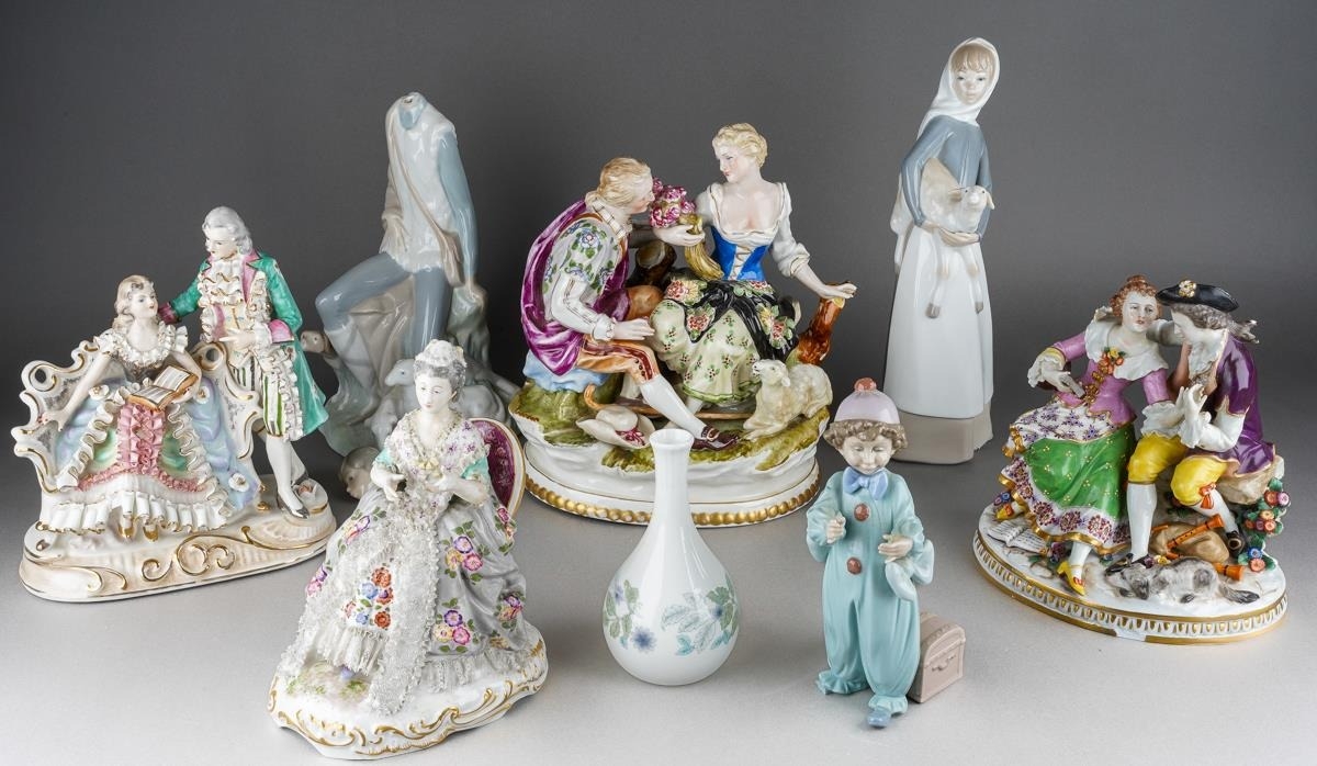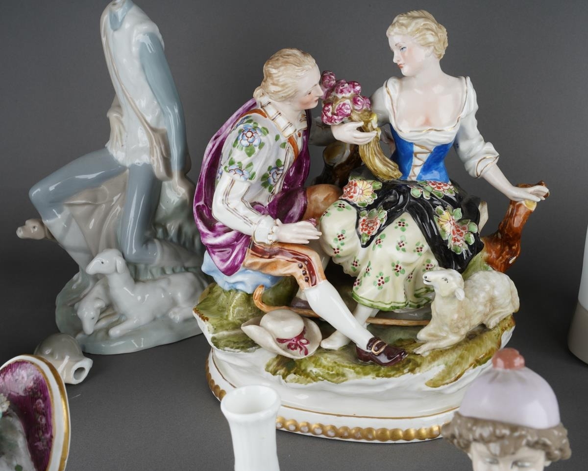Collection of porcelain figures and figure groups to include Ladro and various Continental, German ones, some with lace detail, courting couples etc. ( 1 box) Some losses