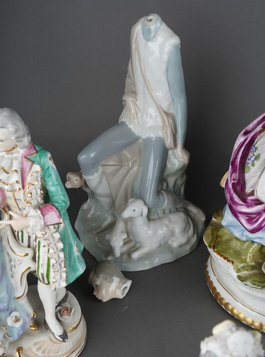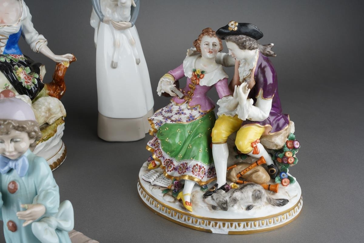 Nao shepherd has a break at the neck, head is loose. Lladro clown child has a missing item from hand and a broken & missing shoe. Figure group with lady holding book has a few chips of varying sizes to frills on dress & man's sleeve cuff. Figure of seated lady has missing finger, glued arm on same side, lots of losses to lace throughout. Sitzendorf figure group - gent's head glued back on. Mandolin broken & glued by hand. Gent's hand has missing fingers & glued repairs , also chipped ponytail. Hispania figure group has chipped fingers to lady's hand by tree stump. Otherwise OK. Any items not mentioned in this condition report are in good condition.