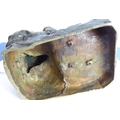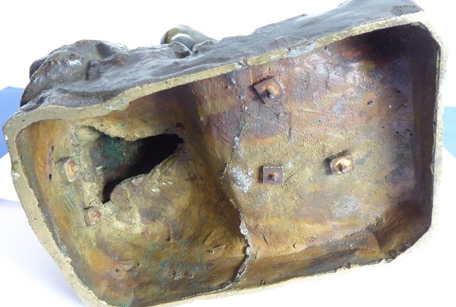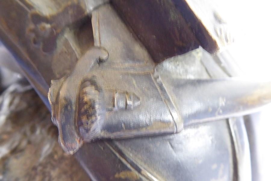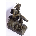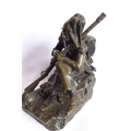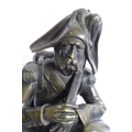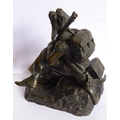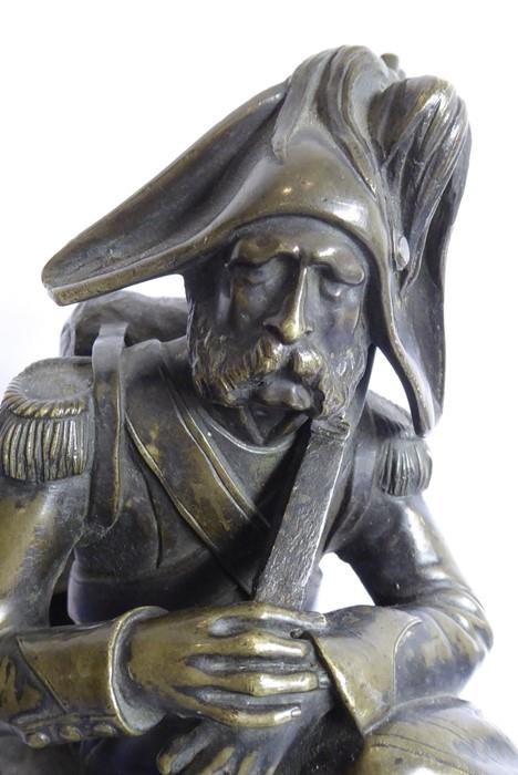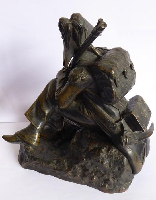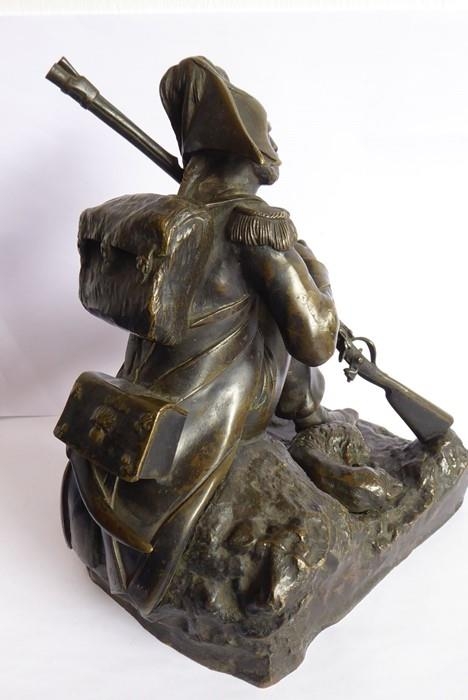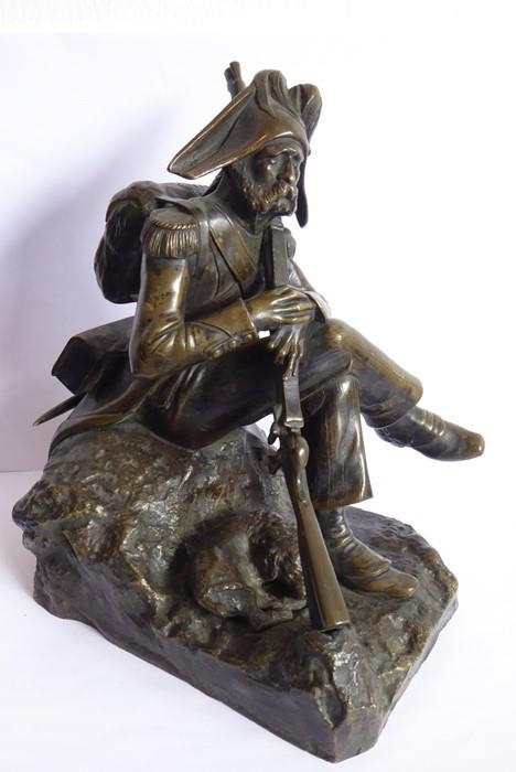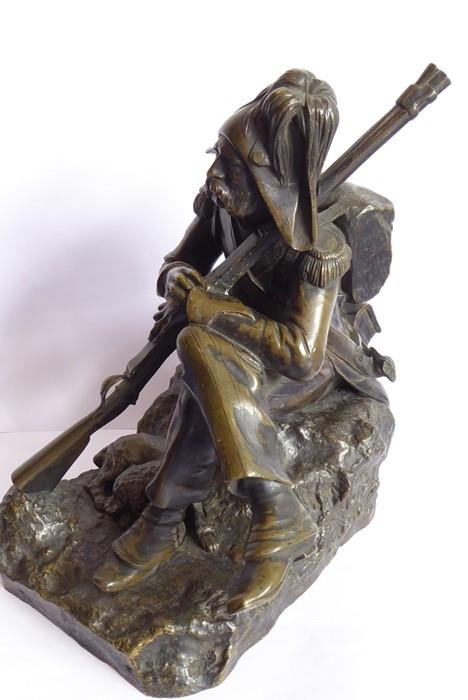 A good and heavy 19th century patinated bronze sculpture of a Napoleon Grenadier with his dog and gun; the soldier is seated cross legged and carries a large satchel and one further bag emblazoned with military badges and a sword scabbard (the handle now broken and away although hardly visible) (16.5cm long x 20cm highest point to gun tip)