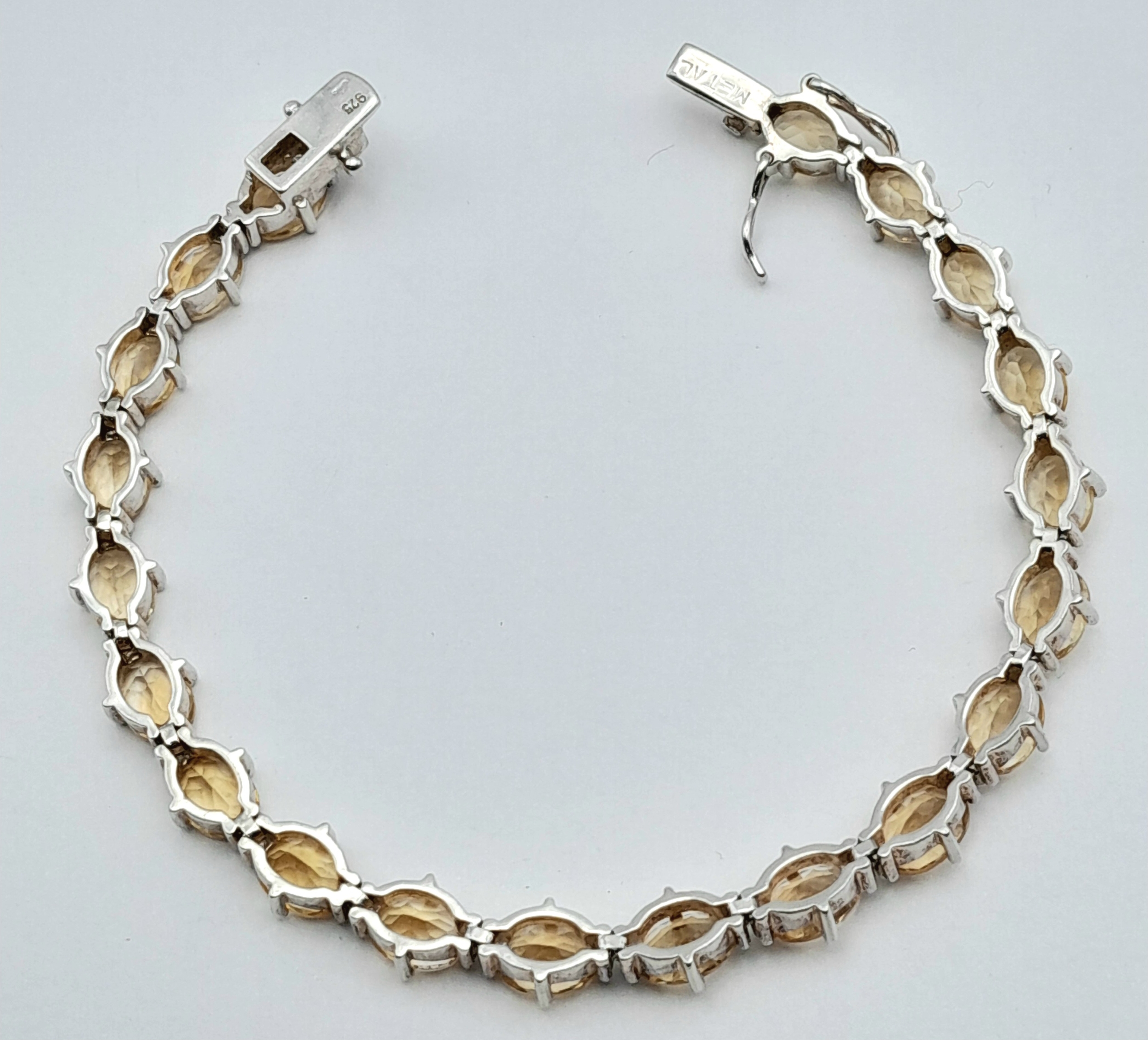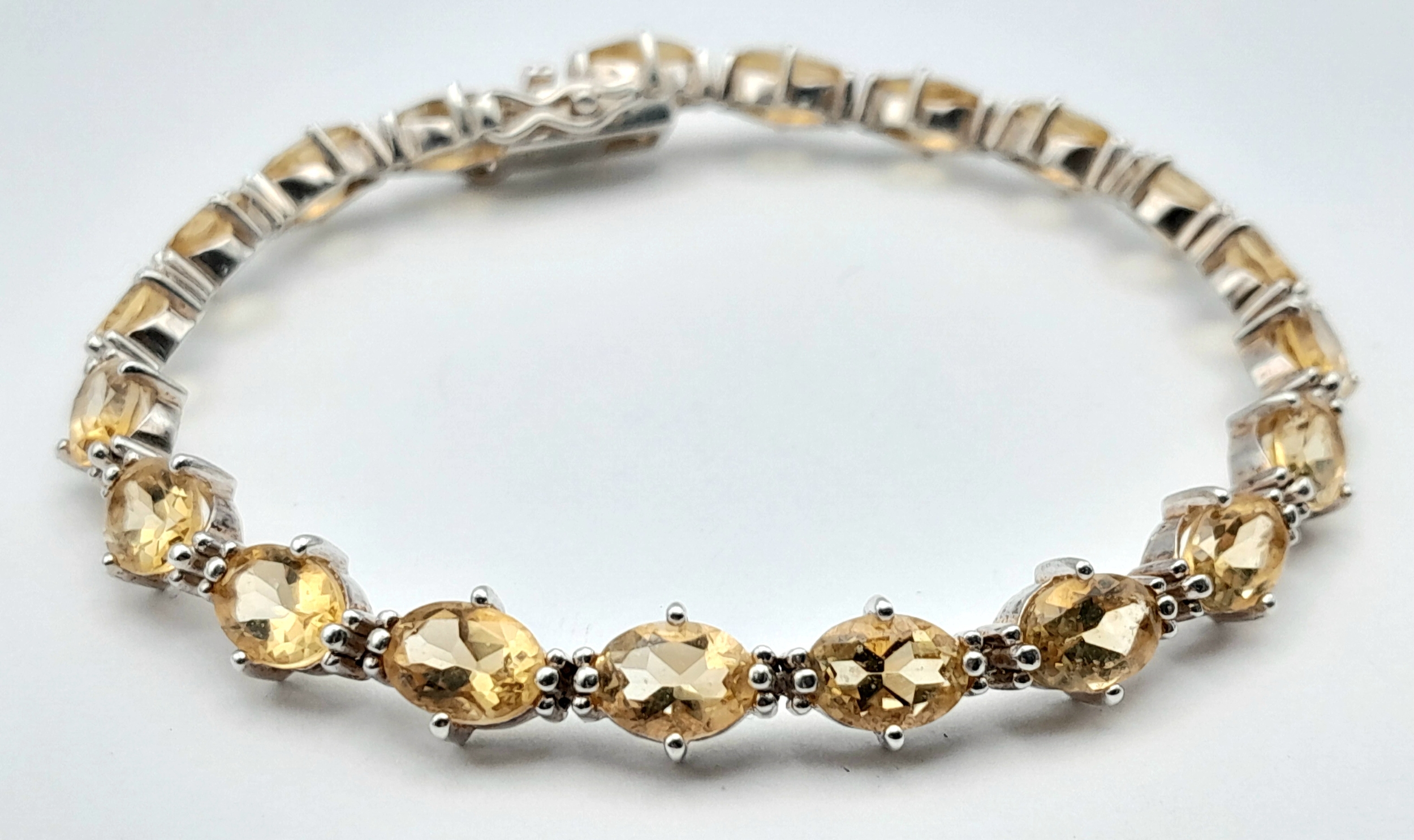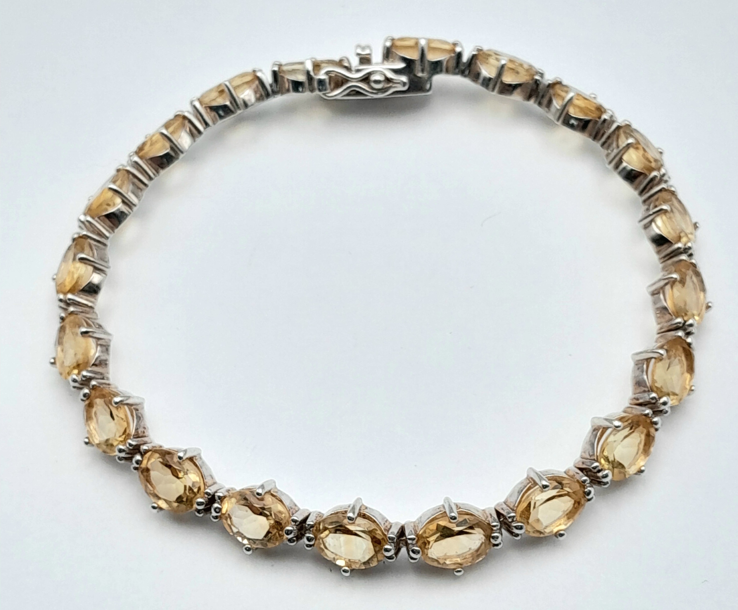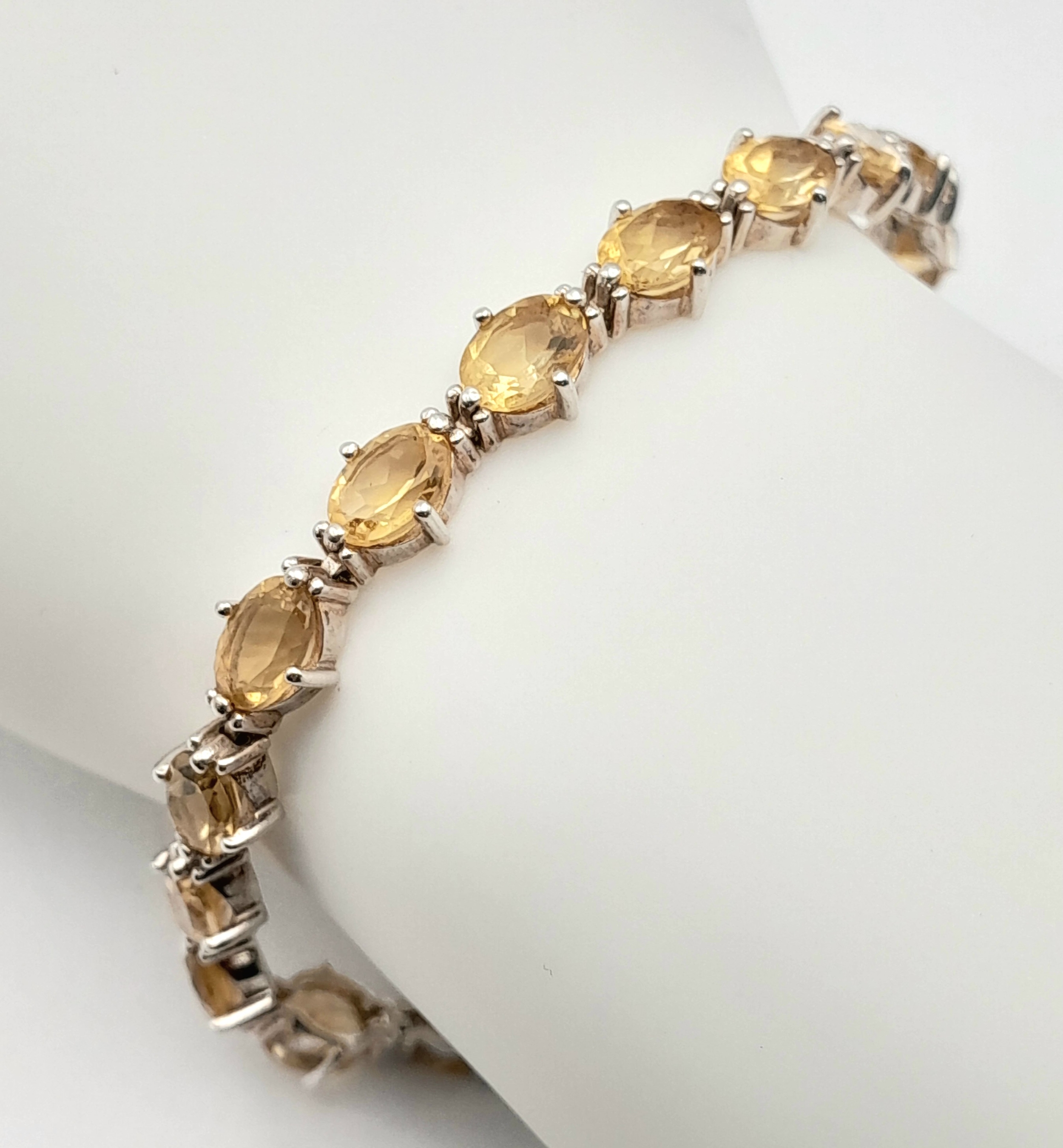 An Elegant Sterling Silver and Citrine Set Tennis Bracelet-18.5cm Length. Set with Twenty 6 x 5mm Oval Cut Citrine, approximately 10 Carat Total. Gross weight 12.96 Grams
