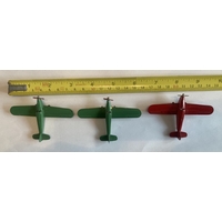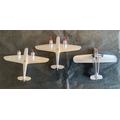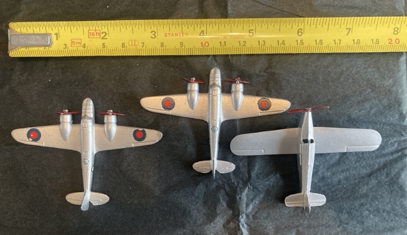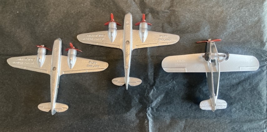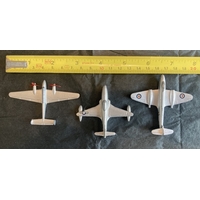 Three early Dinky Meccano airplanes. Two Blenheim medium bombers circa 1938 & Light Tourer & Meteor. Unboxed, condition as photographed