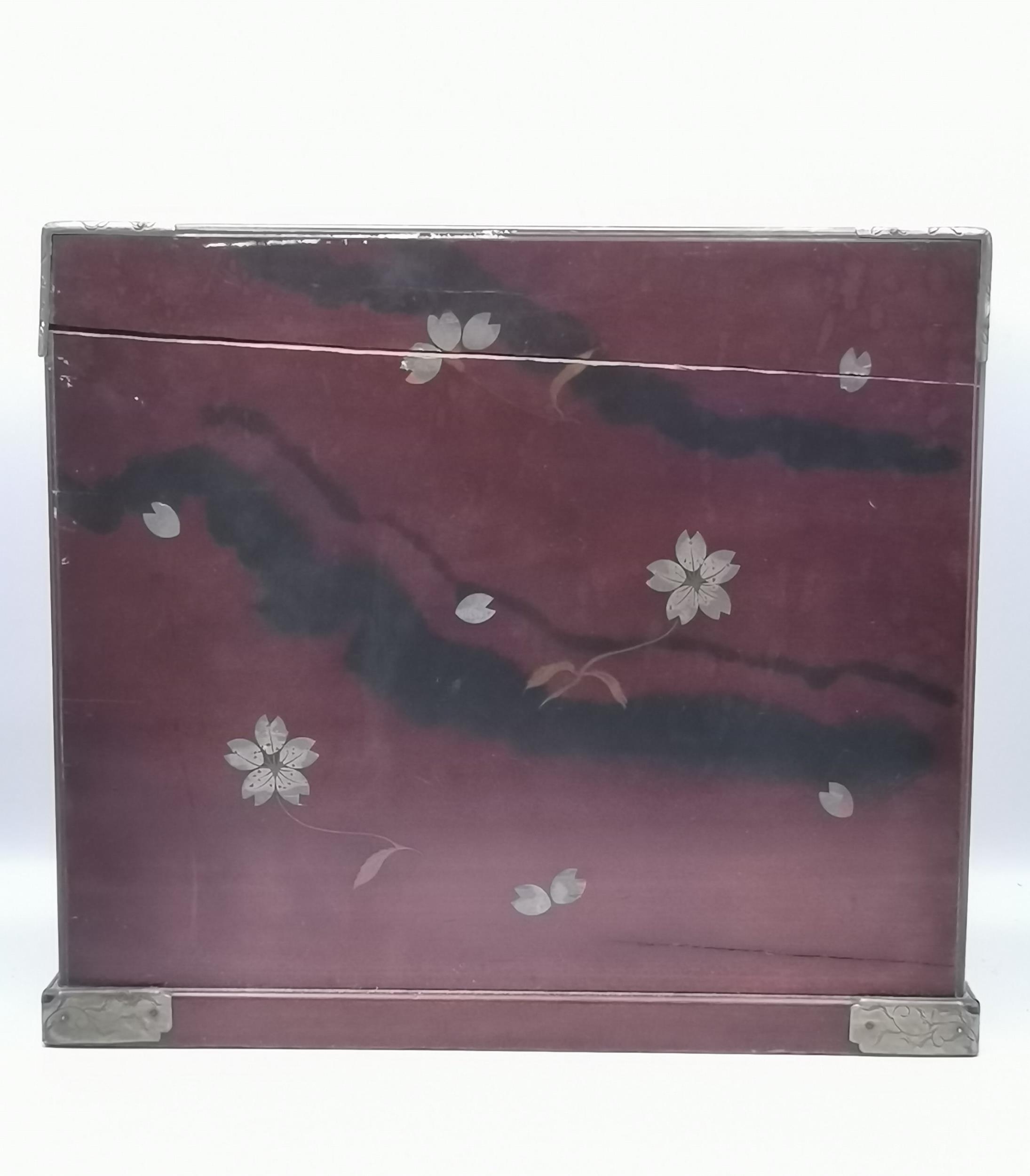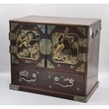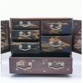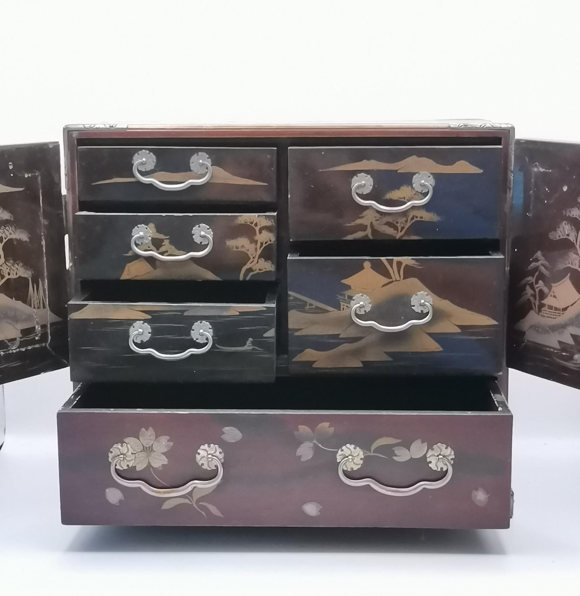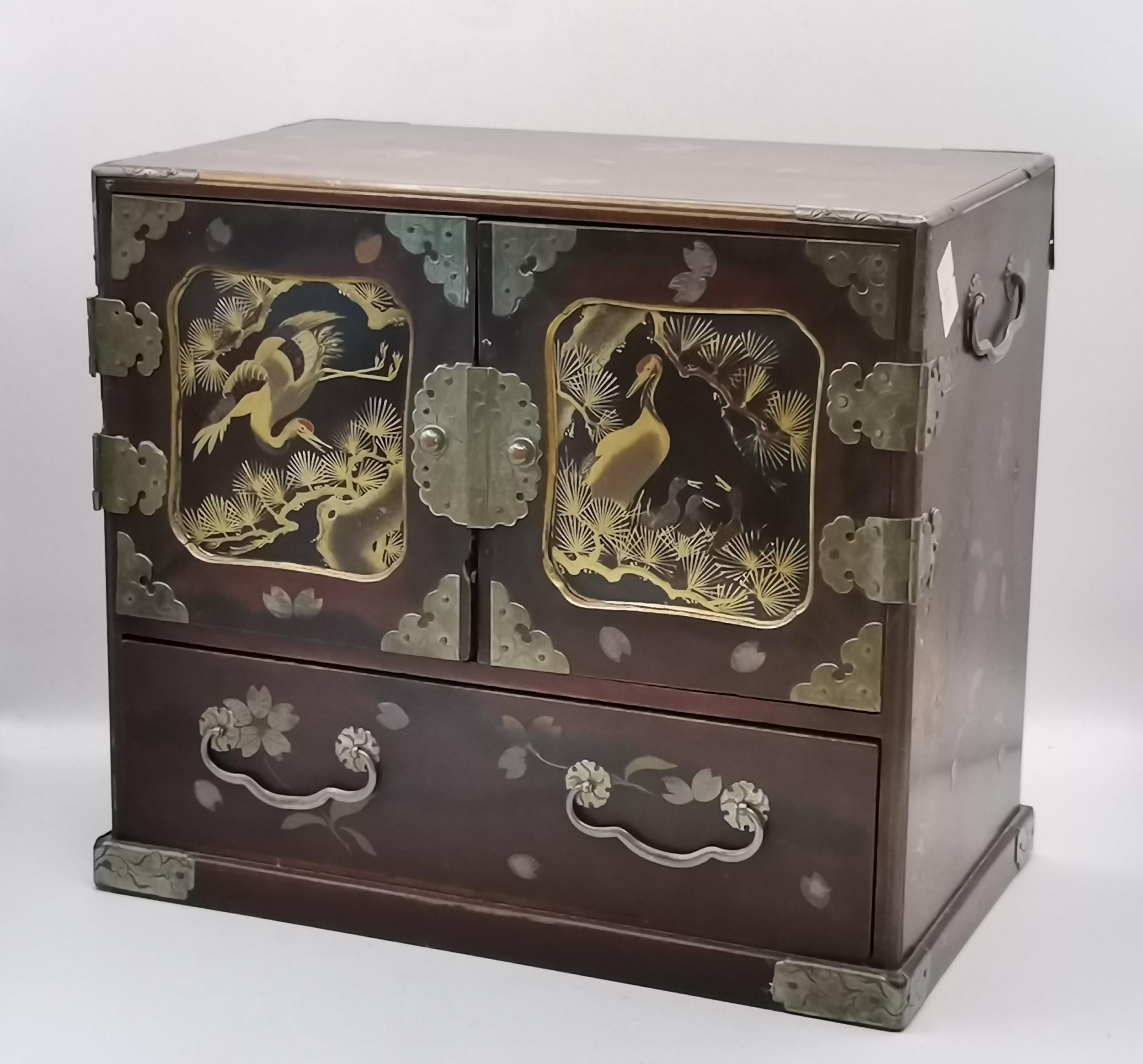 An Oriental lacquered tabletop cabinet, a pair of doors over a deep drawer, five small drawers to the interior with gilt decoration of mountainous landscapes with trees and clouds, the exterior decorated with cranes and flowers, with white metal fittings and handles. 21cm high, 24cm wide, 14.5cm deep