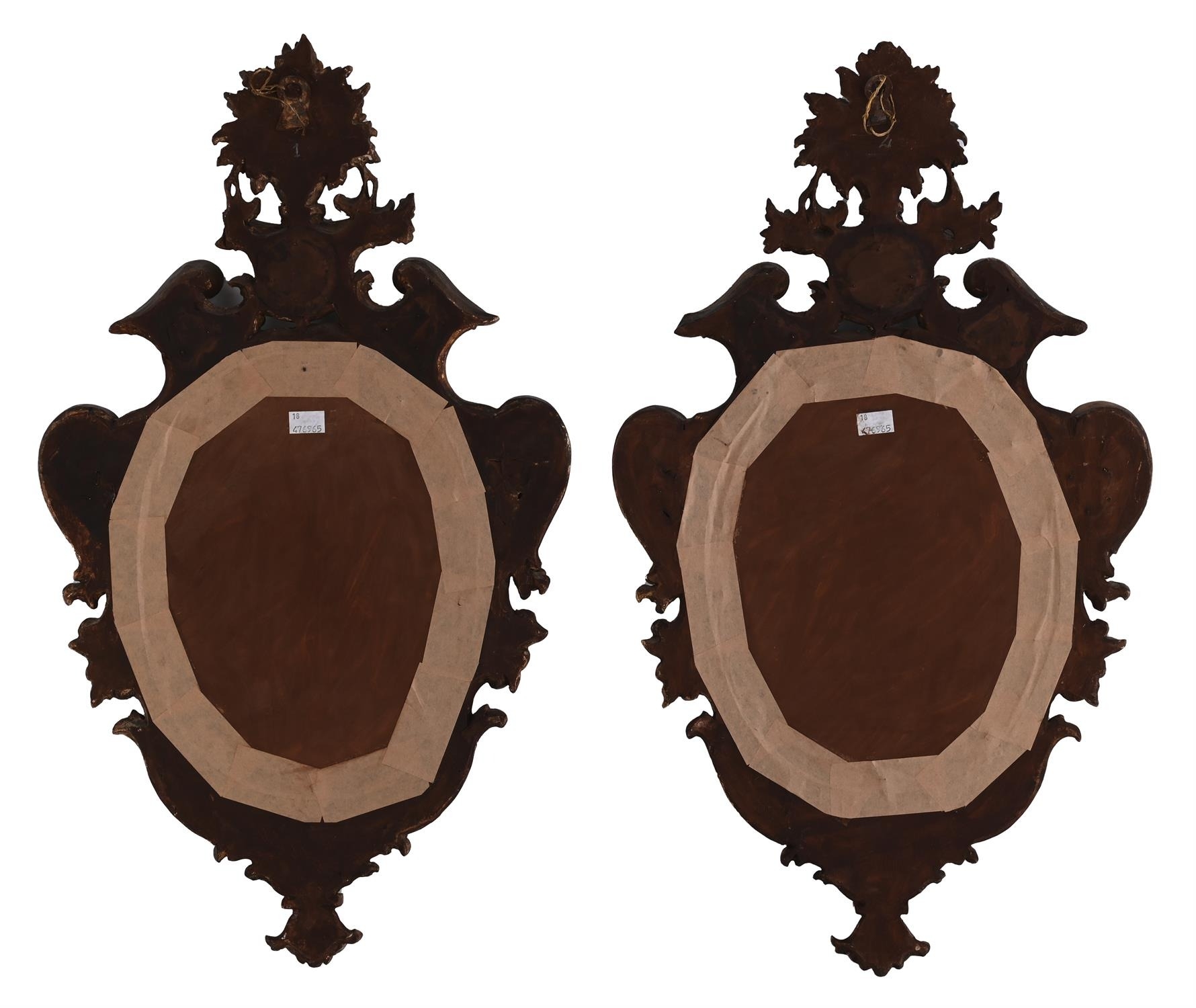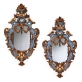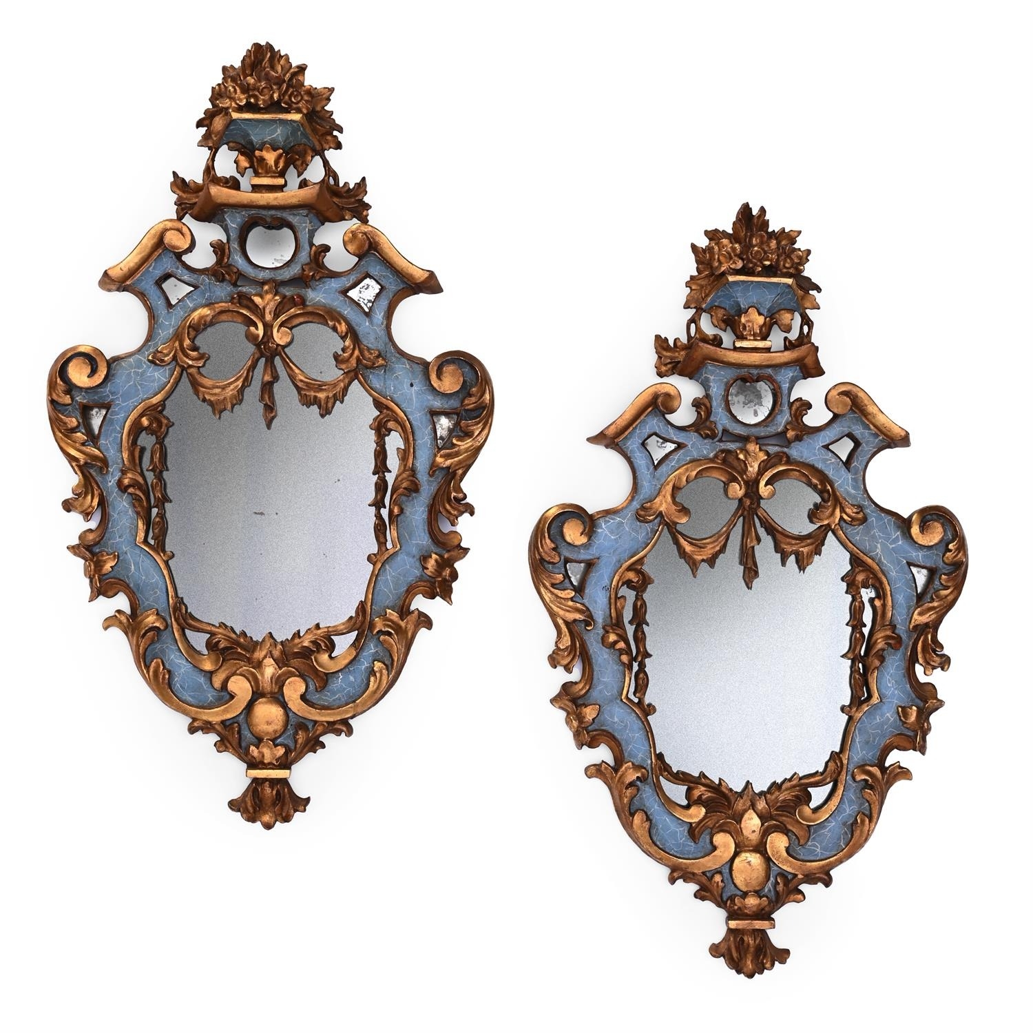 A PAIR OF ITALIAN CARVED GILTWOOD AND BLUE PAINTED WALL MIRRORSFIRST HALF 20TH CENTURY, IN BAROQUE STYLEThe frames painted to simulate craquelure or marble68.5cm high, 39cm wide, 4cm deep Ex Dreweatts, 23rd January 2019, lot 208, (£550 hammer).PLEASE NOTE: ALL LOTS ARE LOCATED AT SACKVILLE WEST STORAGE IN ANDOVER (SP10 3SA) AND ARE NOT AVAILABLE TO VIEW.
