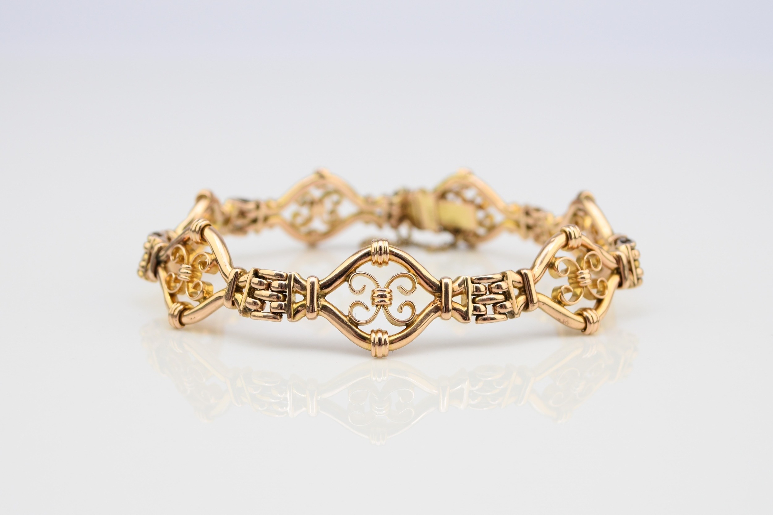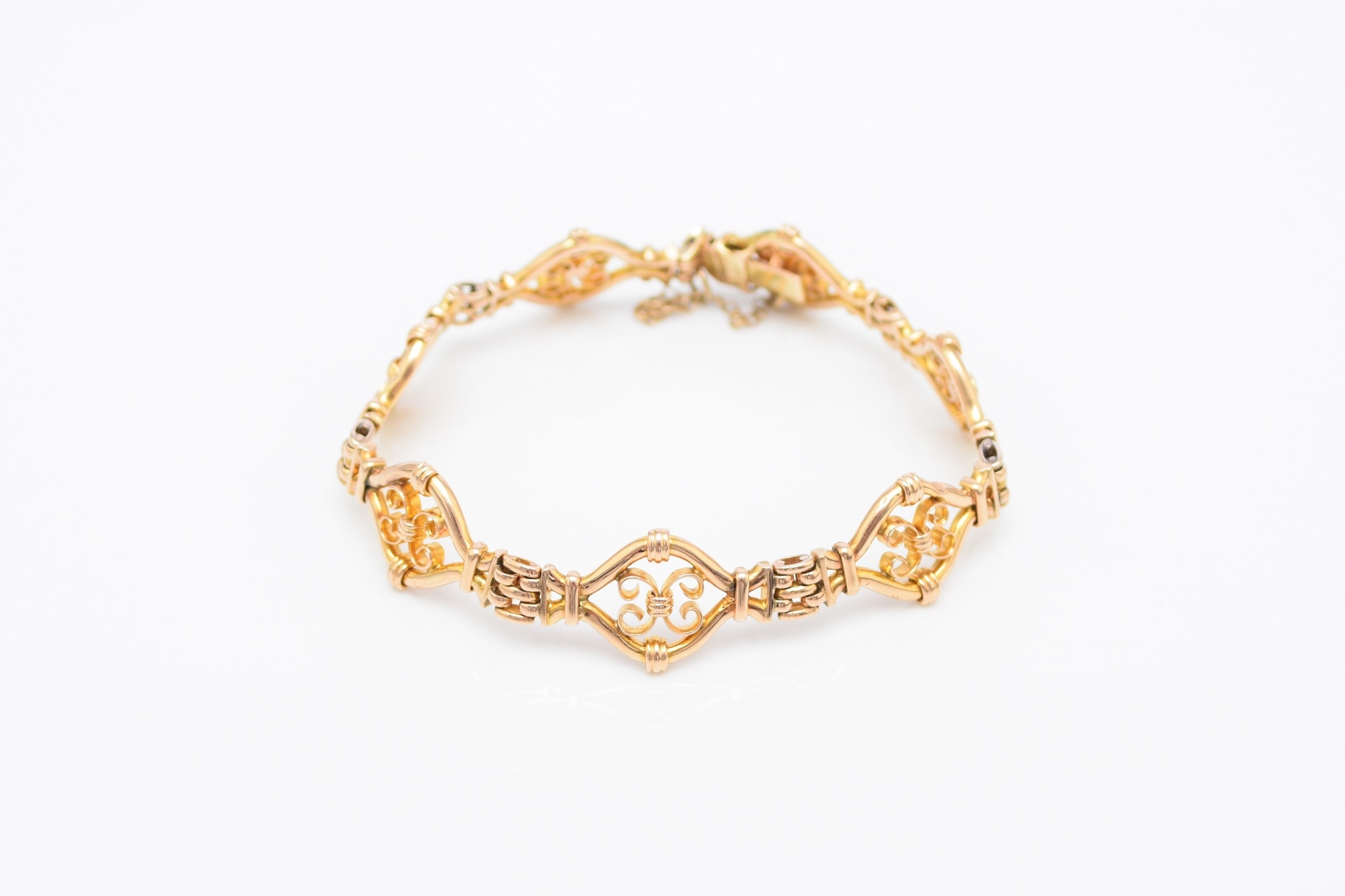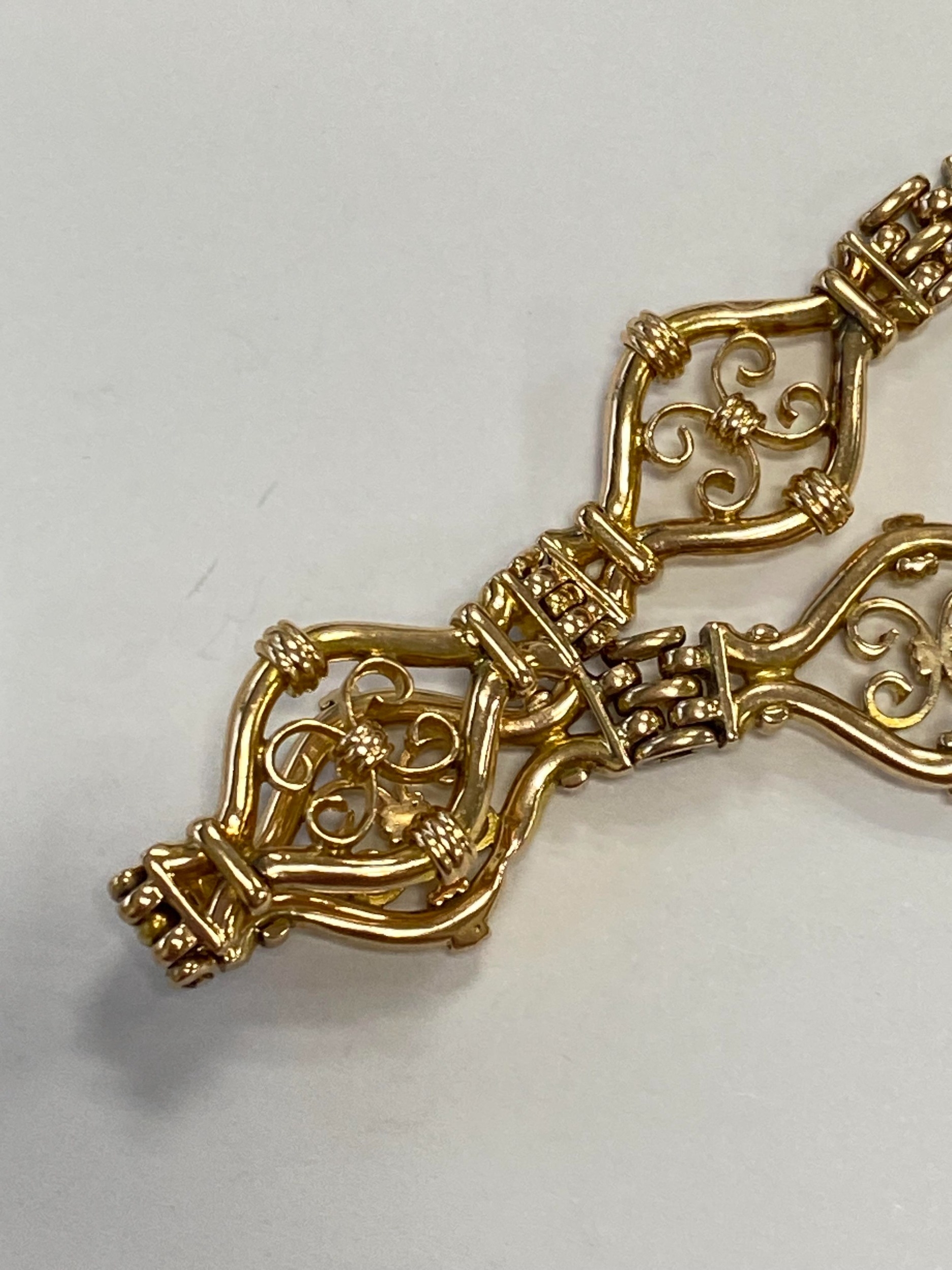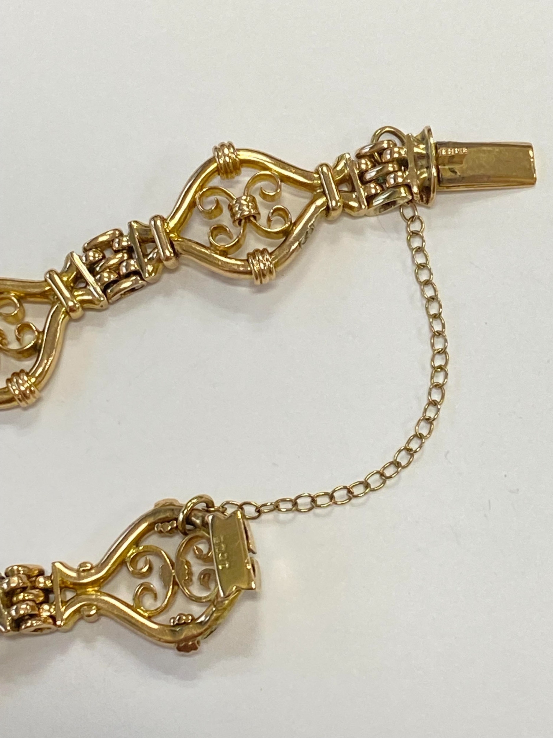 A yellow metal decorative link bracelet, designed as seven openwork scroll links each interspersed with a row of three brick links, the push clasp stamped '15ct', with attached safety chain, weight approx 17.2g Condition:A couple of the openwork hollow scroll links with some small dings/dents, general wear commensurate with age but no significant visible damage, clasp in good working order and appears secure, general wear, refer to images
