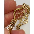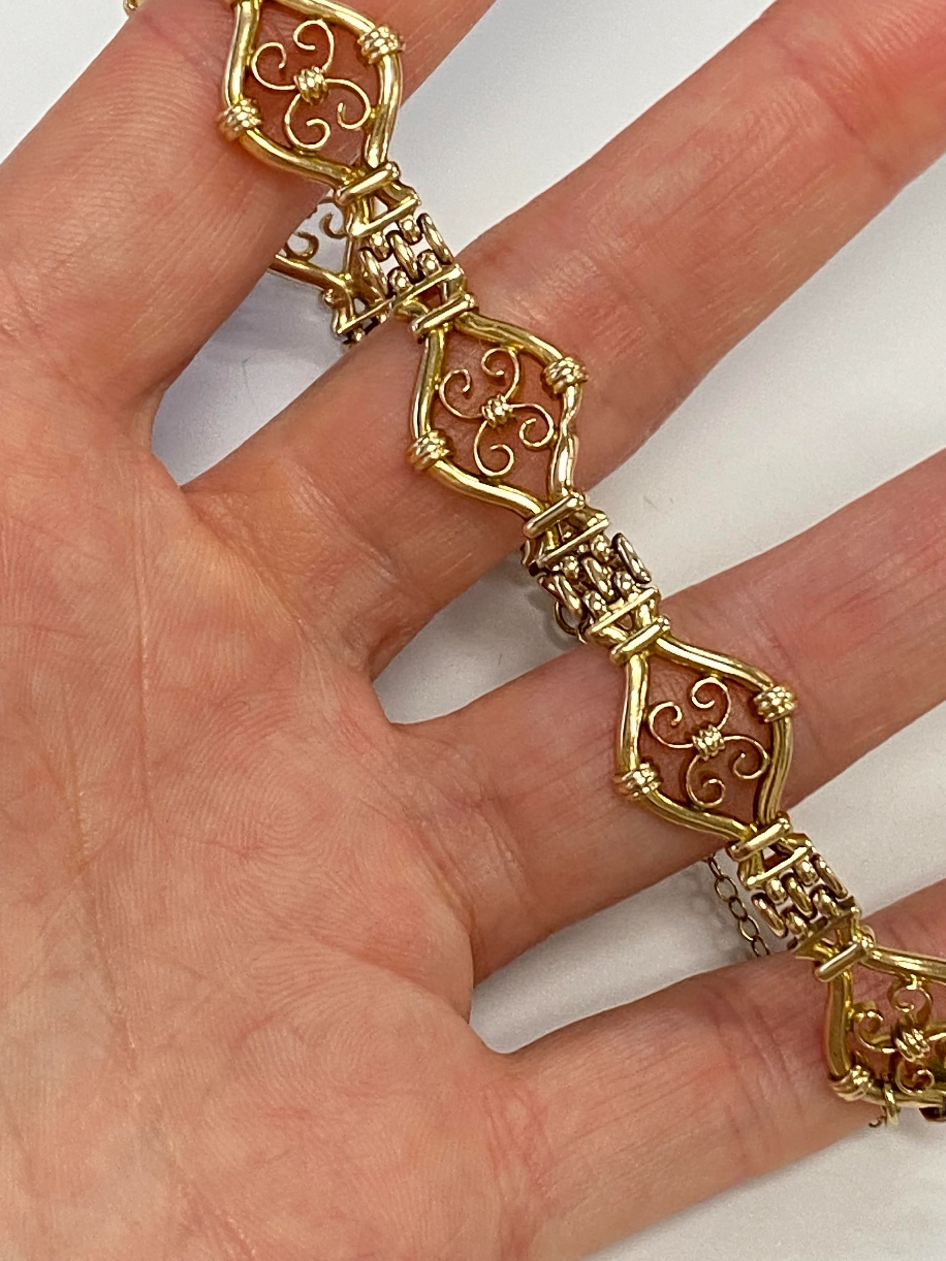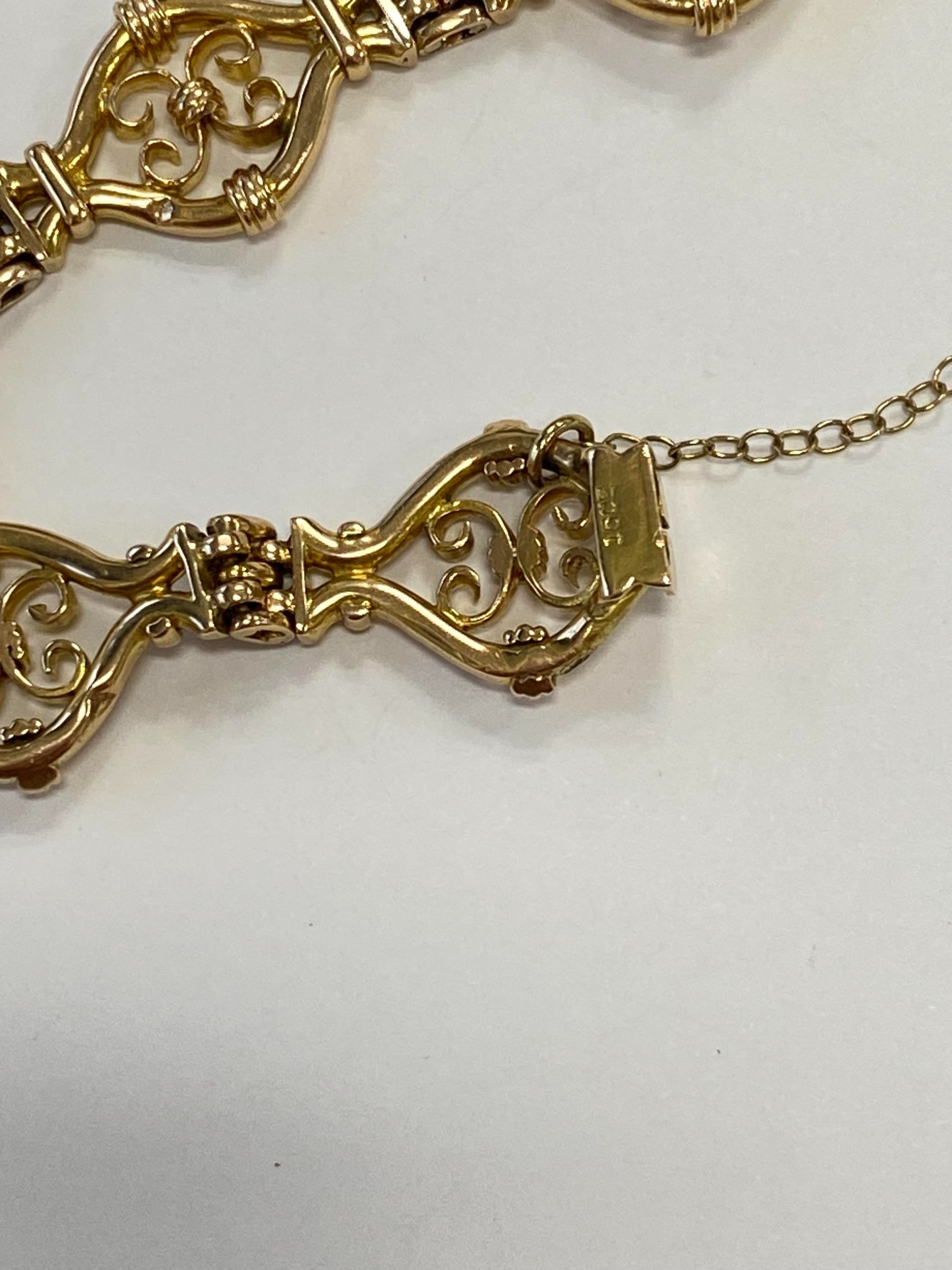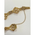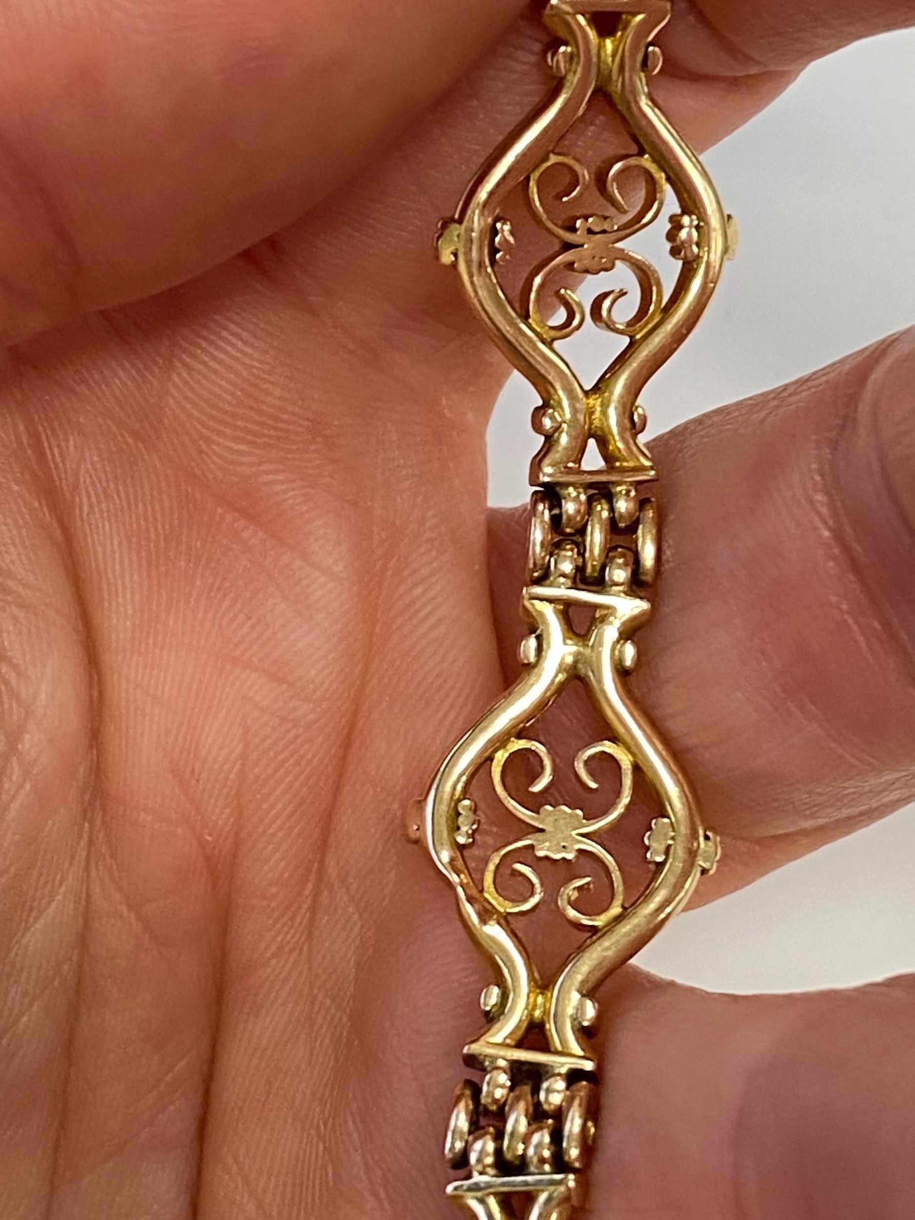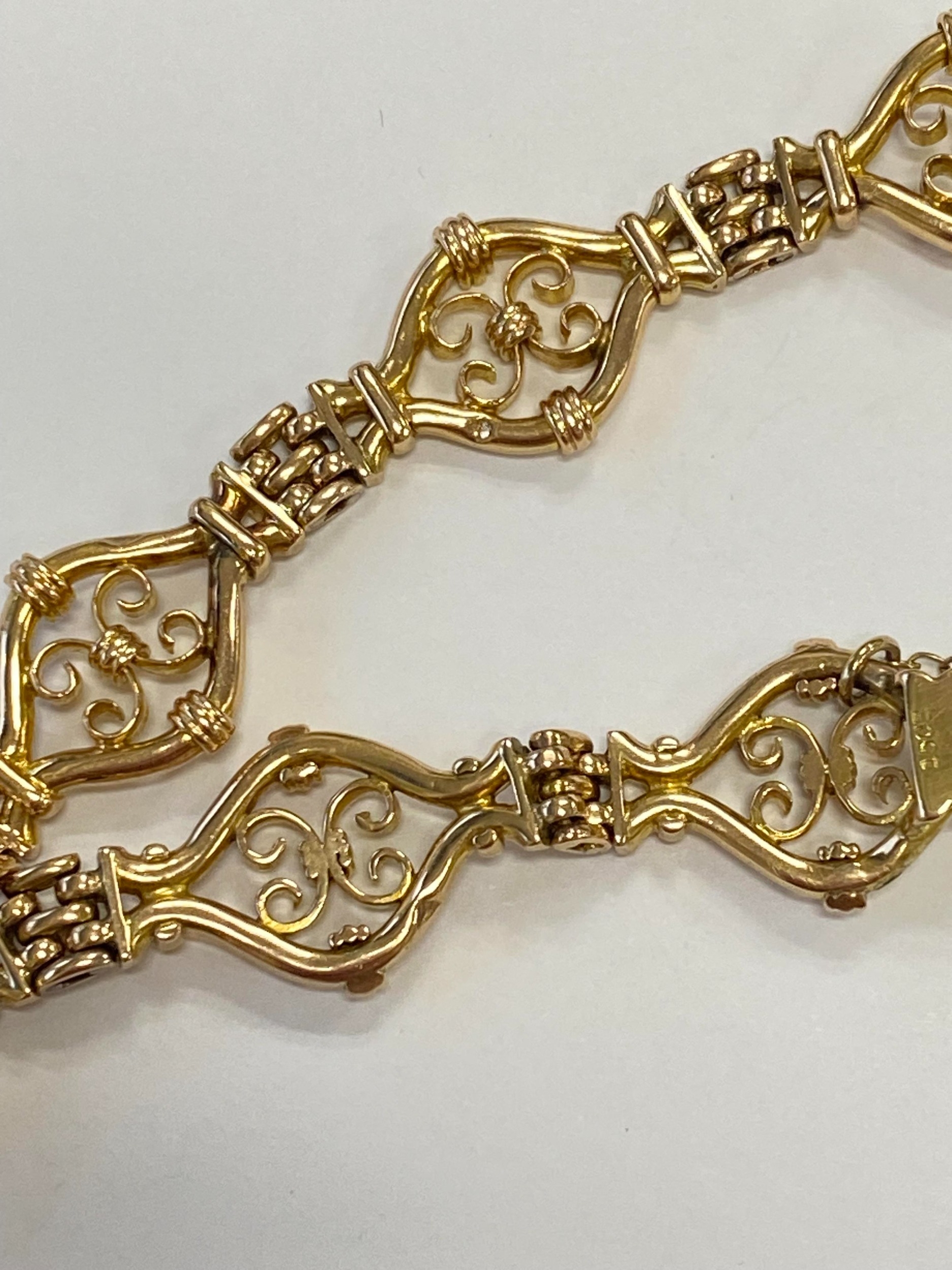 A yellow metal decorative link bracelet, designed as seven openwork scroll links each interspersed with a row of three brick links, the push clasp stamped '15ct', with attached safety chain, weight approx 17.2g Condition:A couple of the openwork hollow scroll links with some small dings/dents, general wear commensurate with age but no significant visible damage, clasp in good working order and appears secure, general wear, refer to images