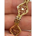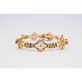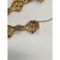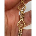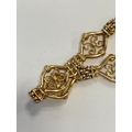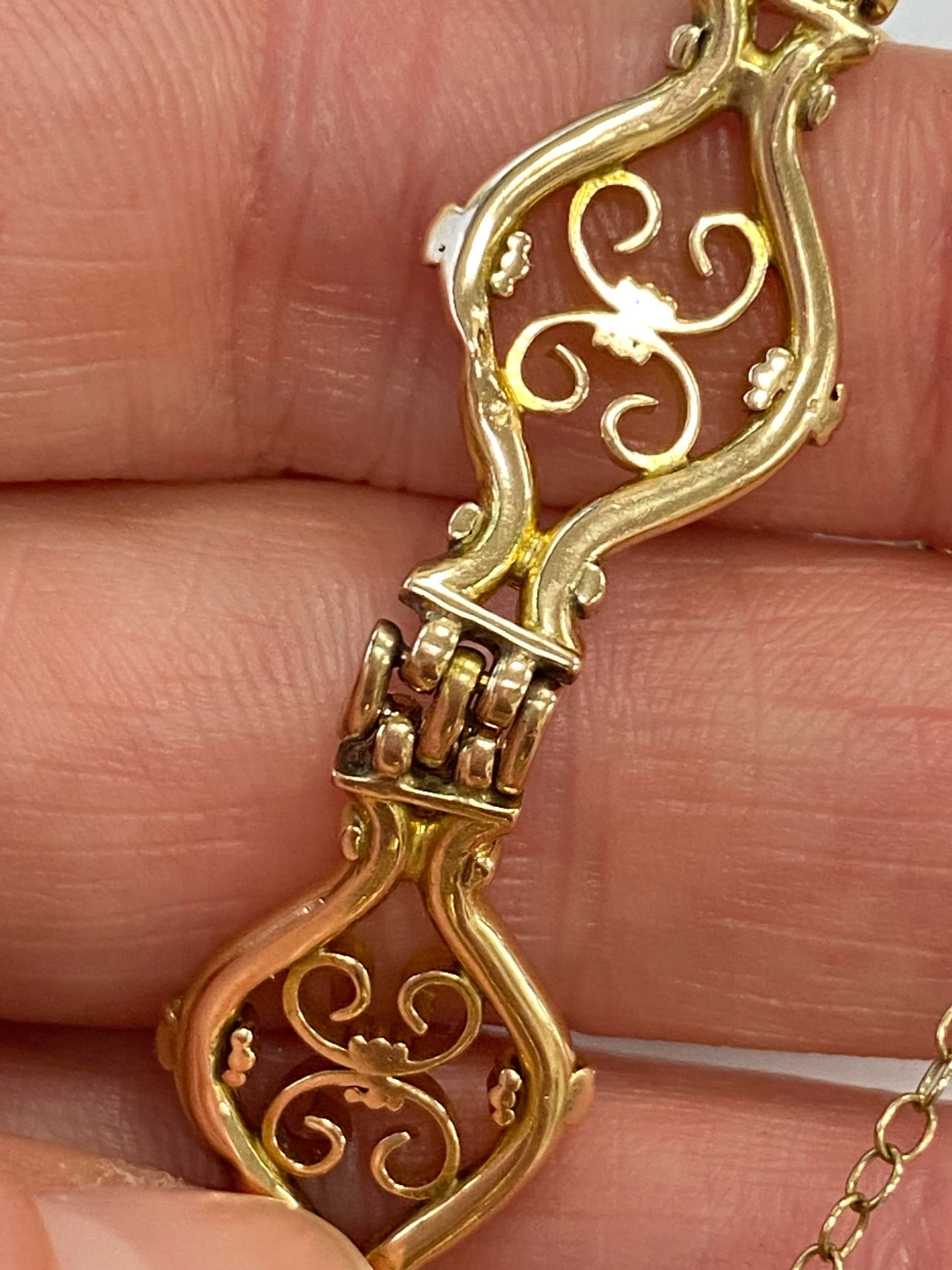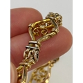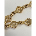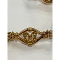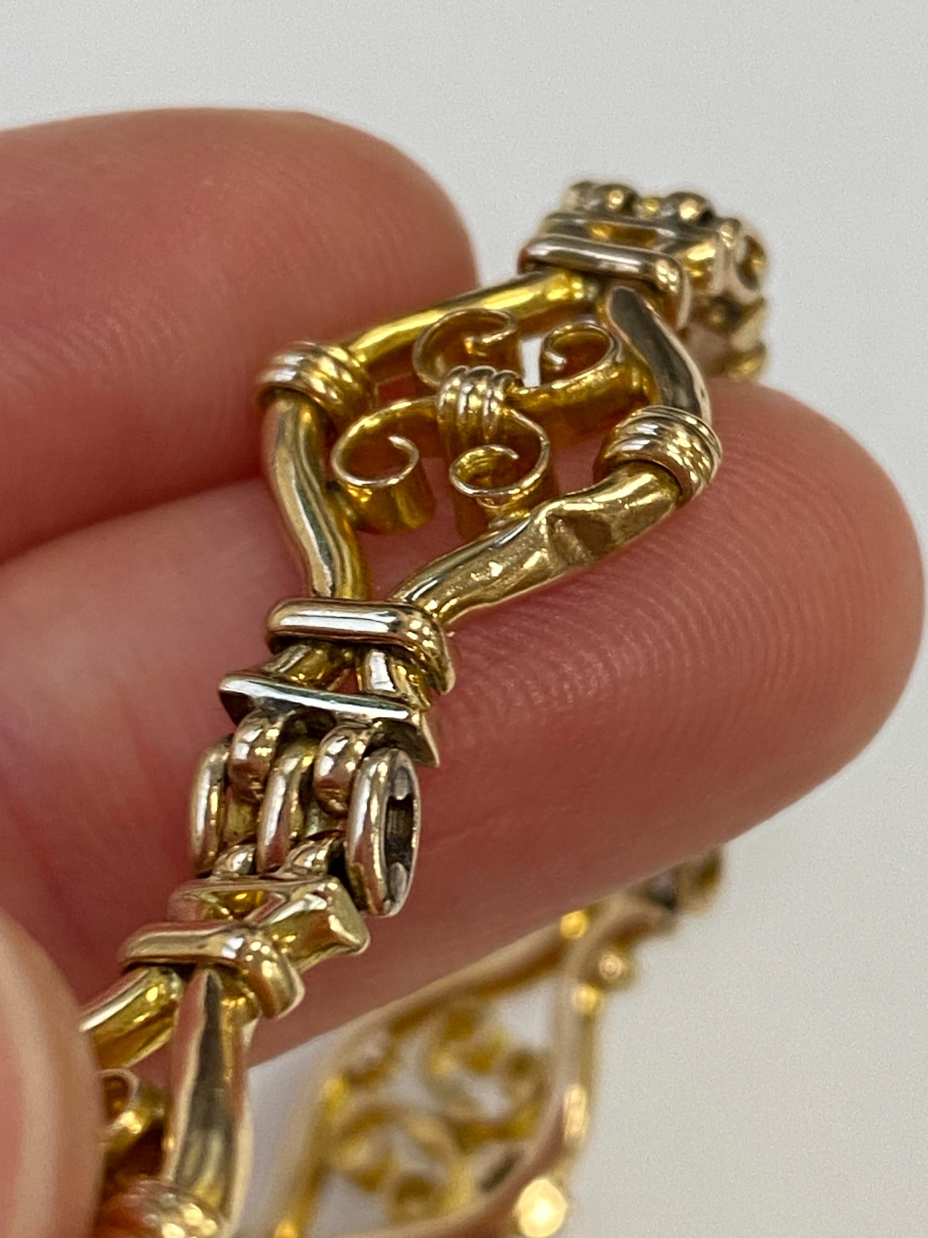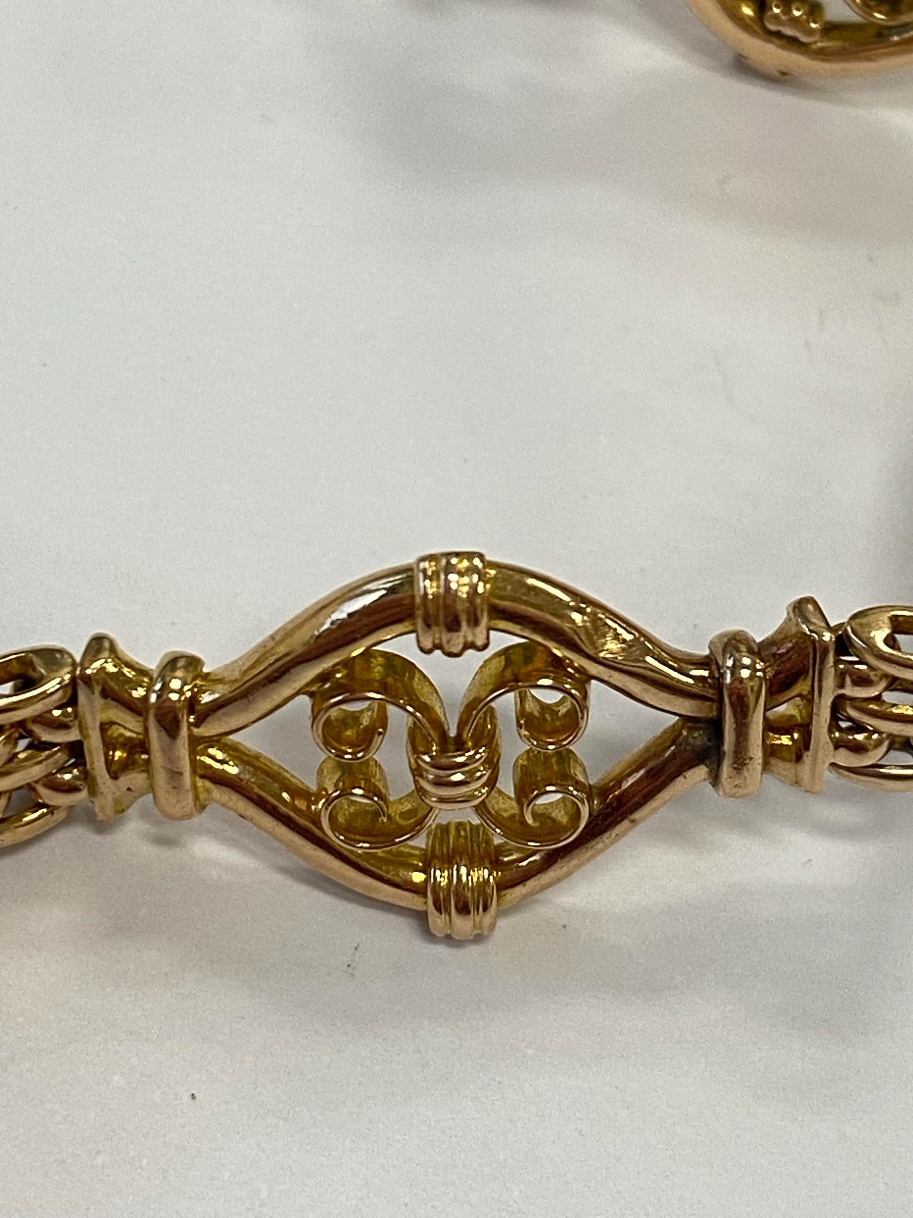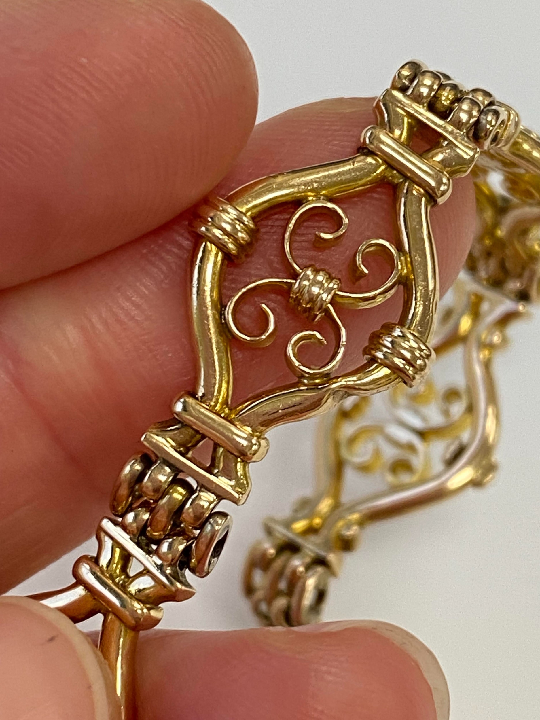 A yellow metal decorative link bracelet, designed as seven openwork scroll links each interspersed with a row of three brick links, the push clasp stamped '15ct', with attached safety chain, weight approx 17.2g Condition:A couple of the openwork hollow scroll links with some small dings/dents, general wear commensurate with age but no significant visible damage, clasp in good working order and appears secure, general wear, refer to images