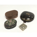 A leather coin purse, two small boxes and a metal pill box (4). Shipping category B.