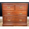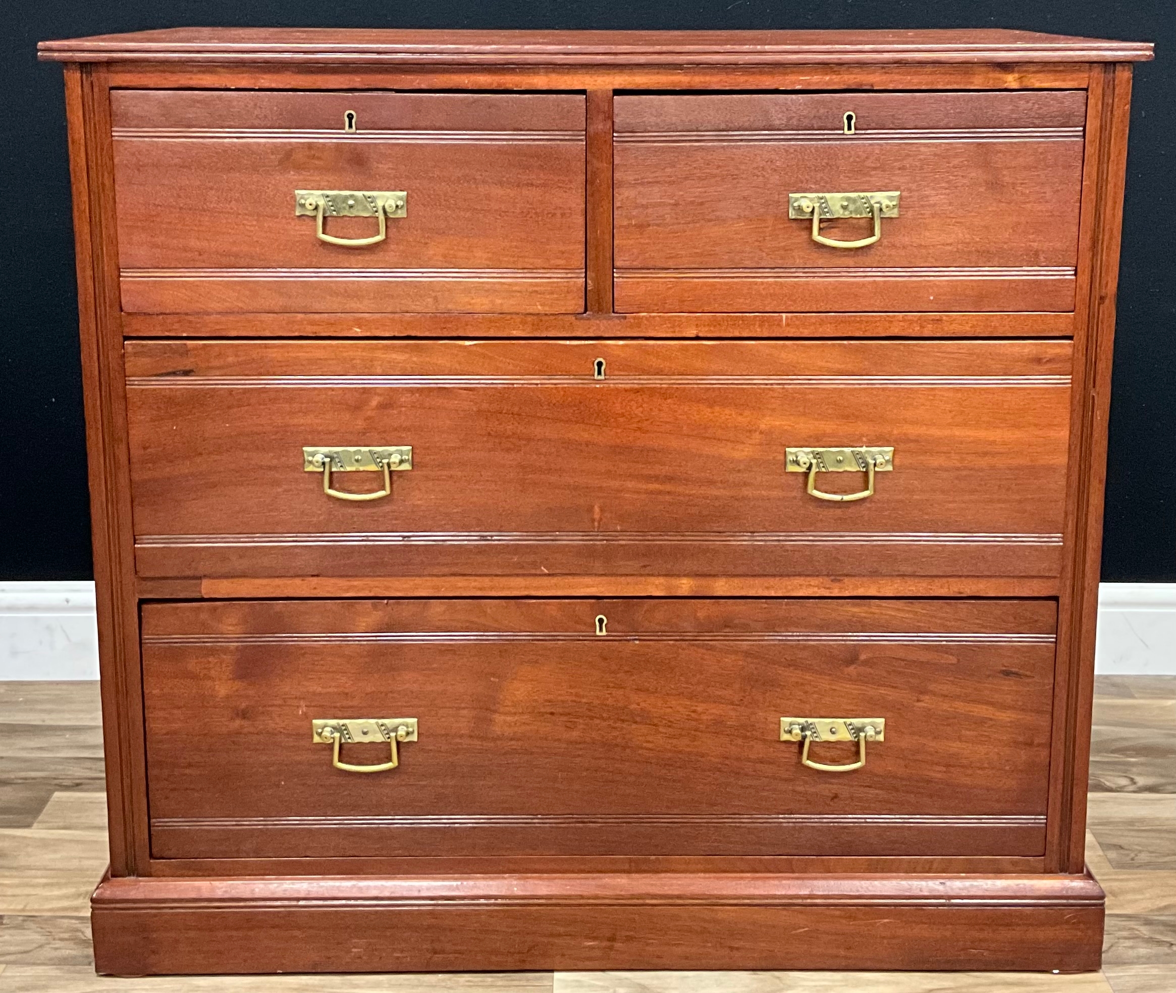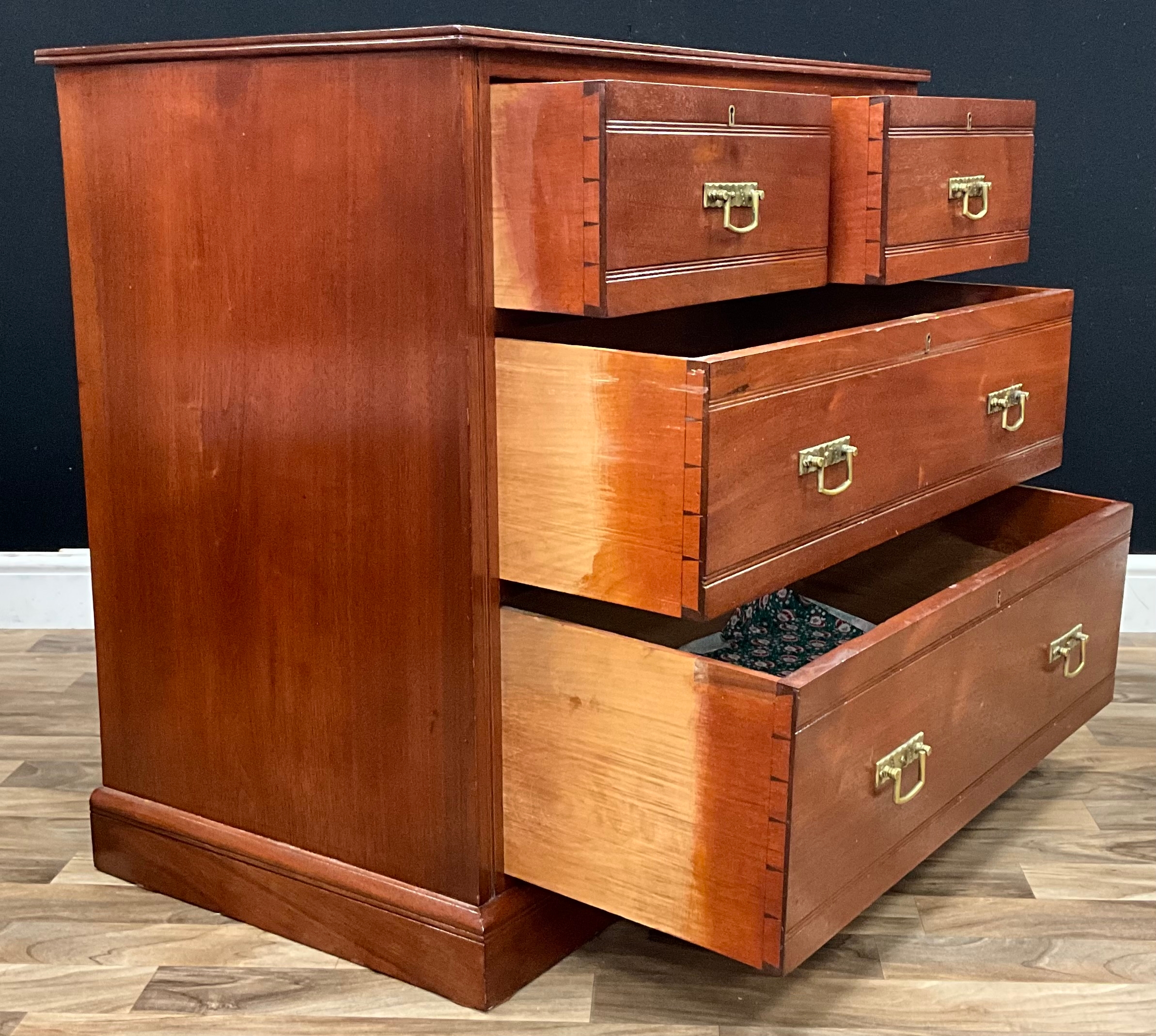 A late 20th century campaign chest of drawer, slight oversailing top above two short drawers and two long graduating drawers, brass handles, 83.5cm high, 91.5cm wide, 53cm depth
