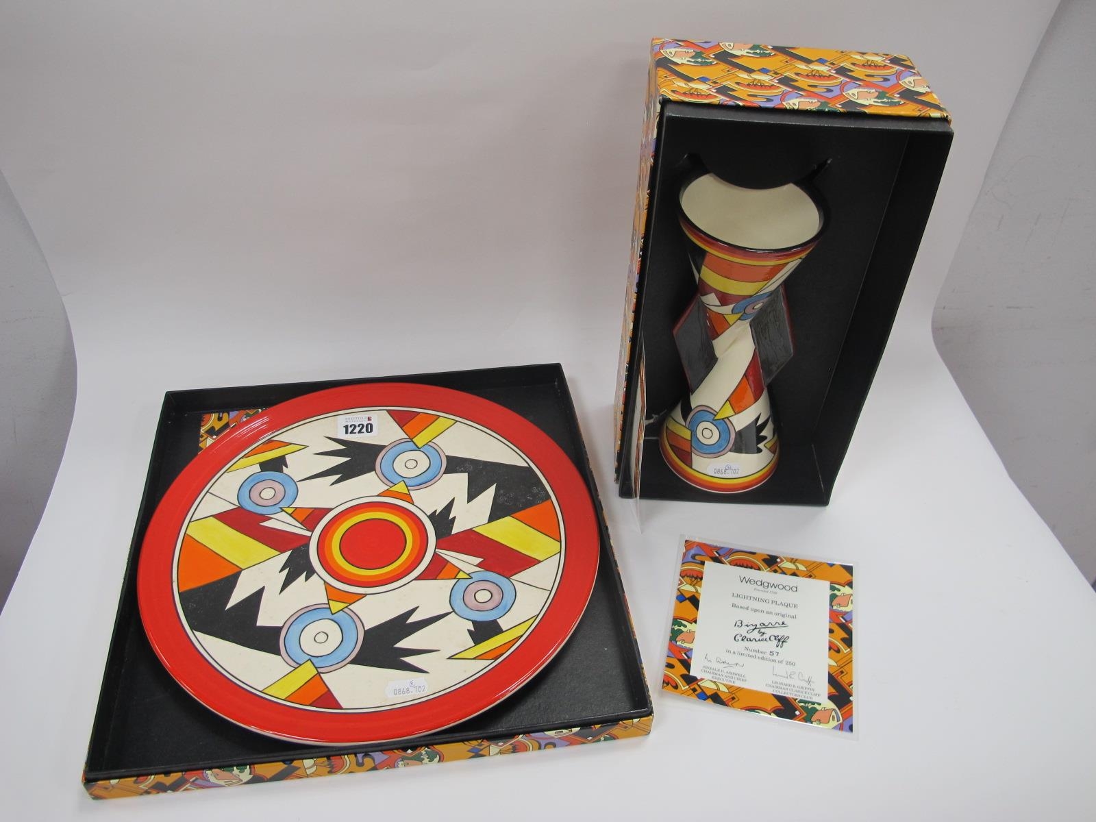 Wedgwood 'Lightning' Plaque Limited Edition of 250, based upon an original hand painted Bizarre by Clarice Cliff, 31cm diameter, a matching Yo Yo vase, 23cm high both boxed. (2).
