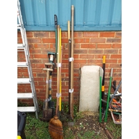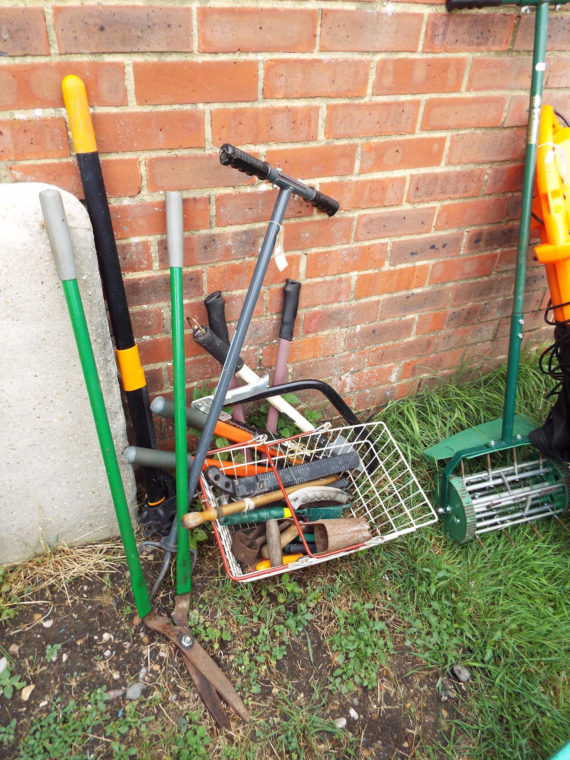 A basket of garden hand tools loppers, weeders, trowel etc