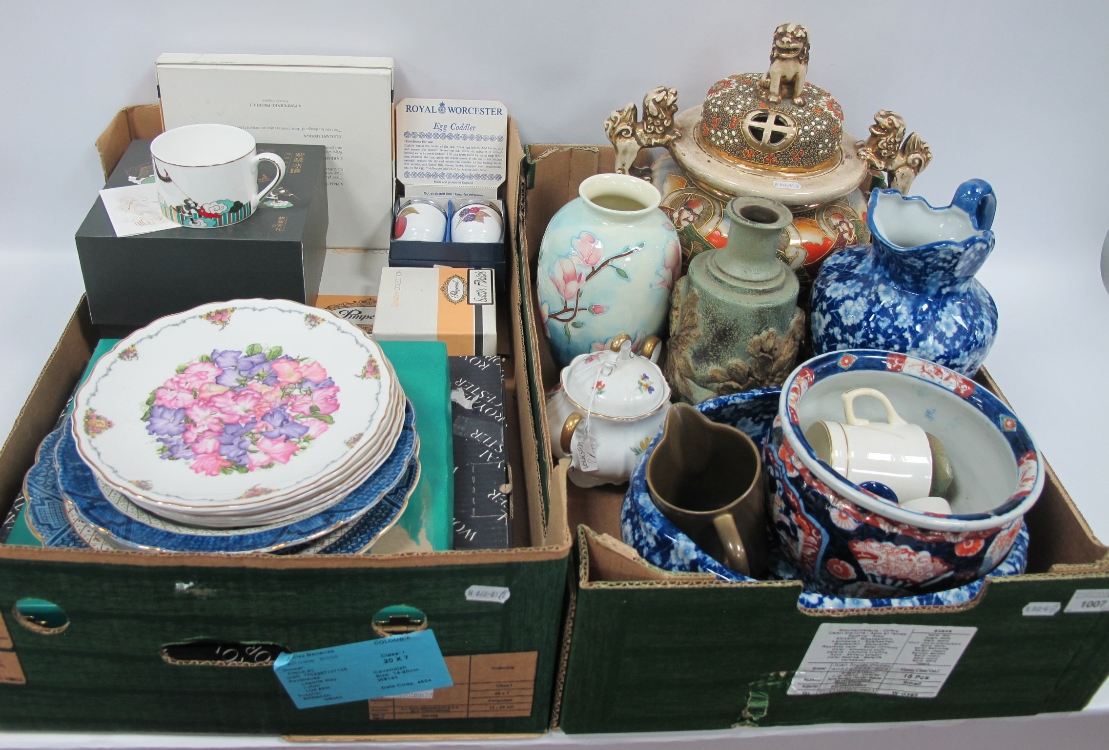 Ceramics, including boxed Royal Doulton limited edition “Pierrot” plate, large lidded Satsuma incense burner with Foo dog decoration (H35cm), Old Tupton Ware vase (H20cm), boxed Royal Worcester “Country Garden Crudité Dish” (D34cm), Pimpernel placemat sets, Victorian ironstone pitcher & bowl and oriental planter etc. Two boxes.