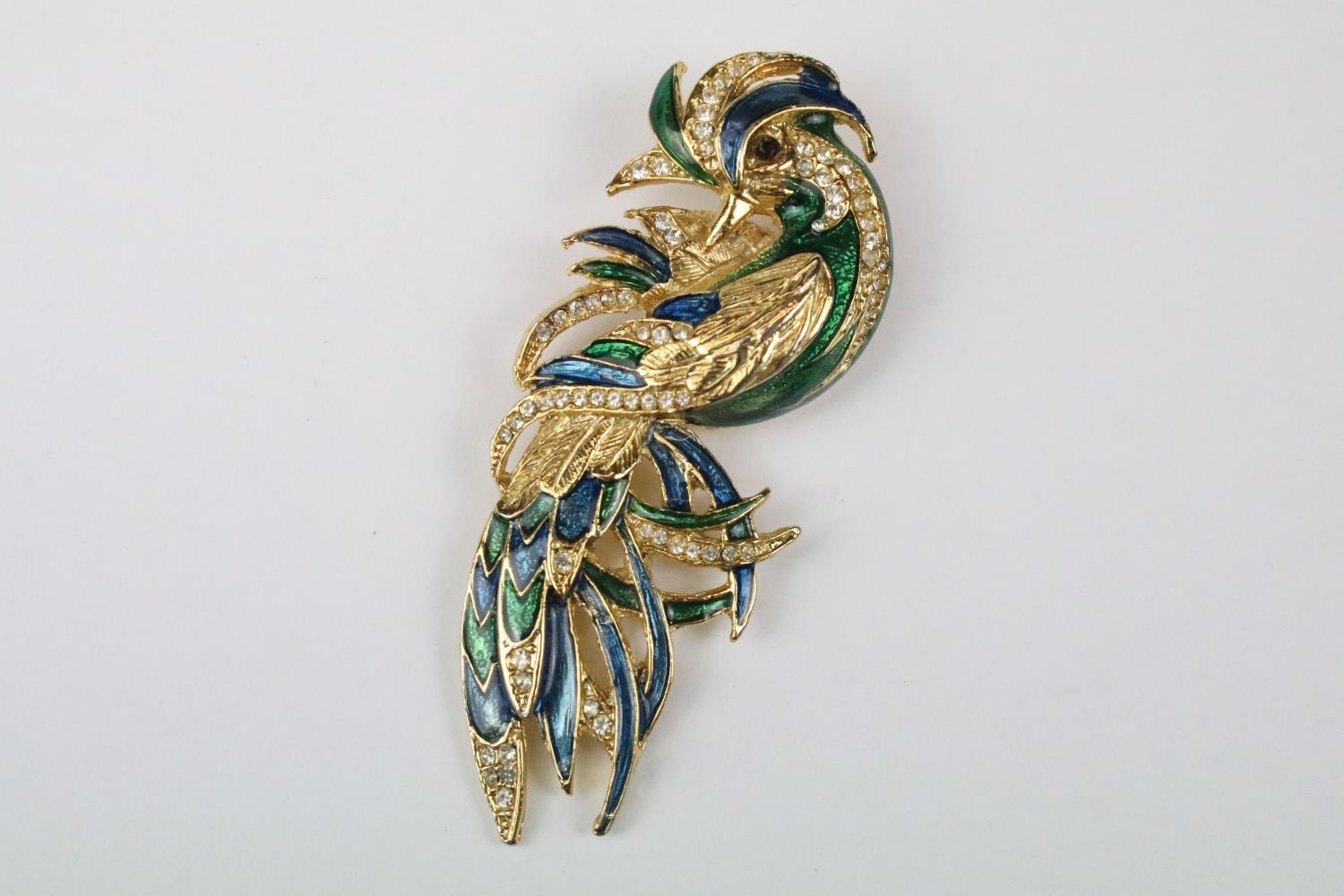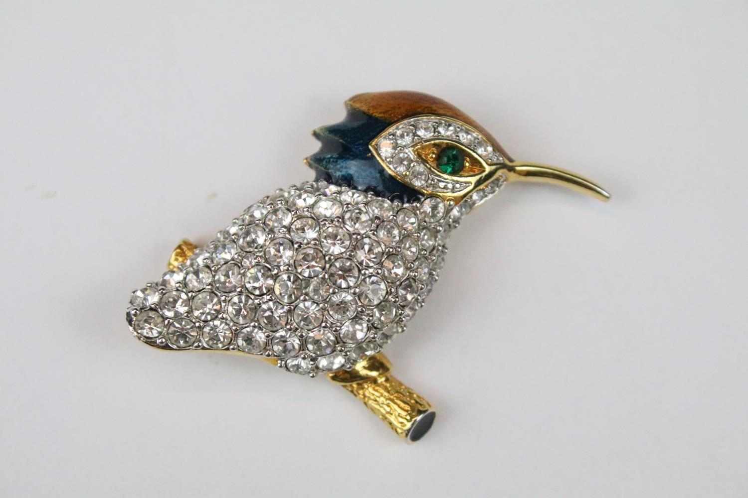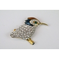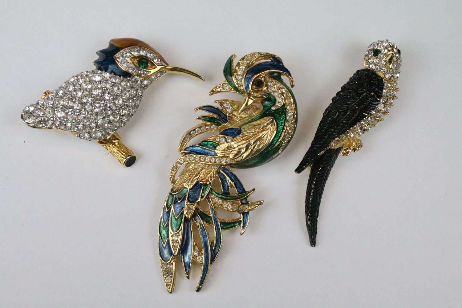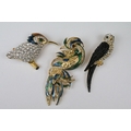 Three Large Costume Jewellery Bird Enamel and Crystal set Brooches in the form of a Parrot, Kingfisher and Exotic Bird, largest 8cm long
