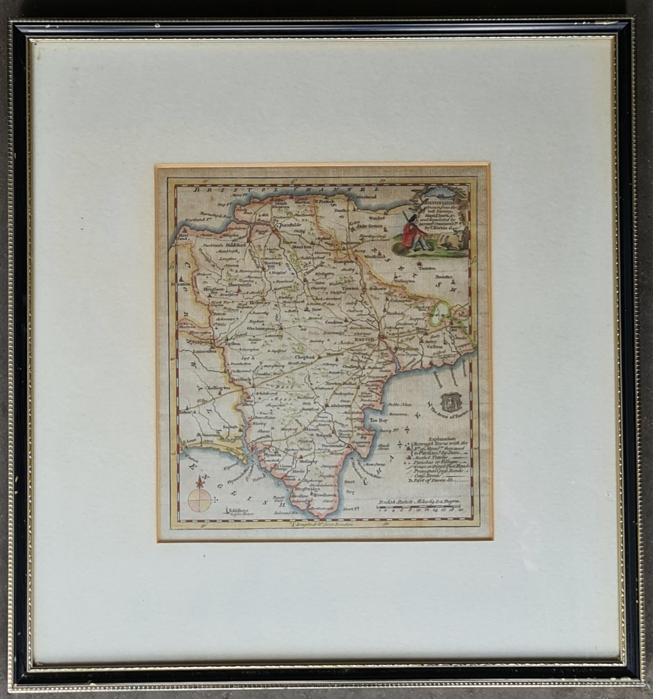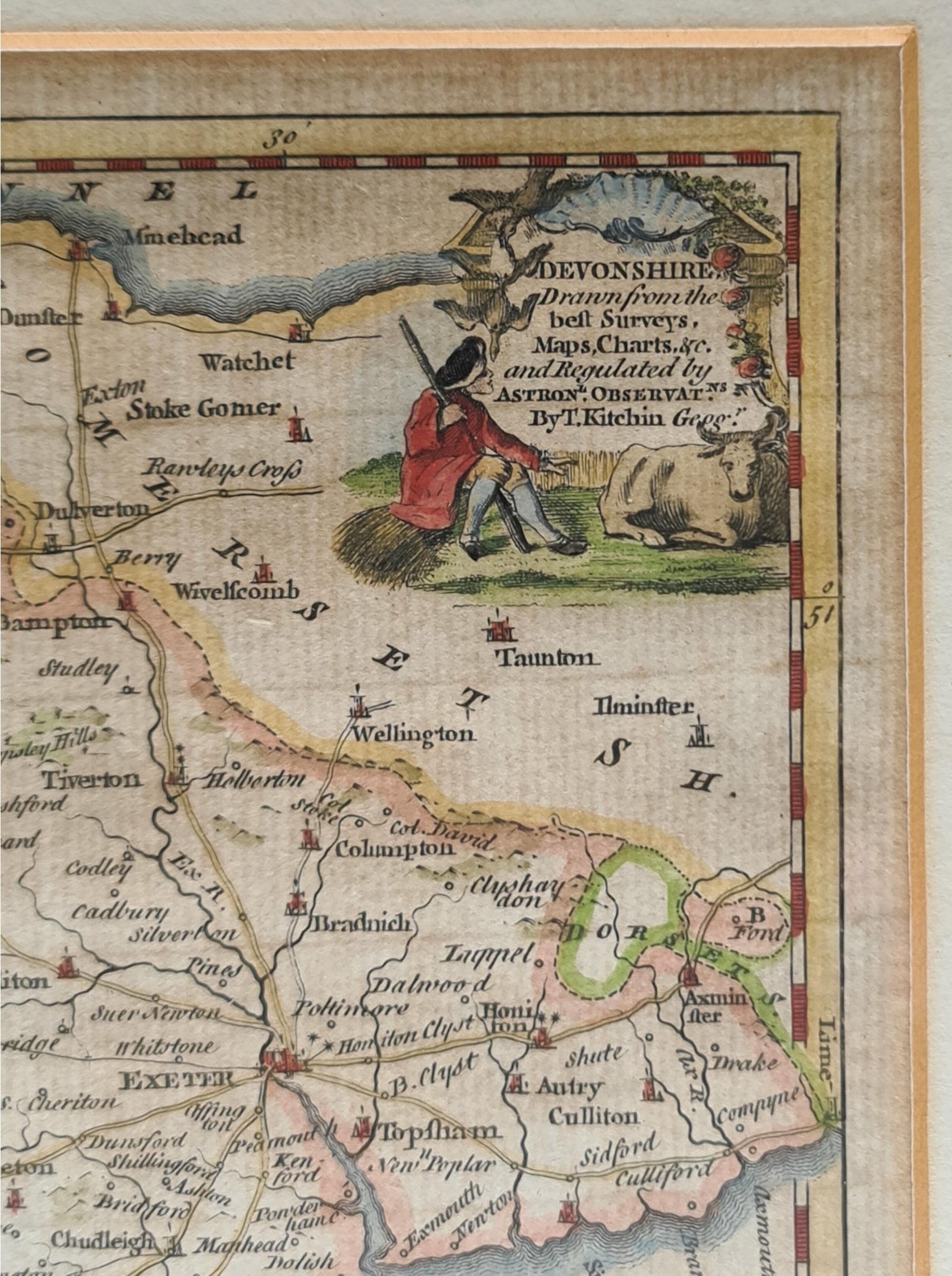 Antique Framed Engrave Printed and Coloured Map of Devonshire by Thomas Kitchen. Believed to be from late 1700's to very early 1800's. Overall Size 37cm by 39cm. Shipping is available. Please ask for a quote before bidding. Where possible we combine shipping costs. Remember, if you are the highest bidder above reserve on this Lot you have bought the item and are legally responsible for the item. Viewing is recommended in either person or via video link. Contact us to arrange.