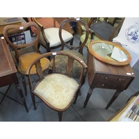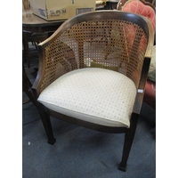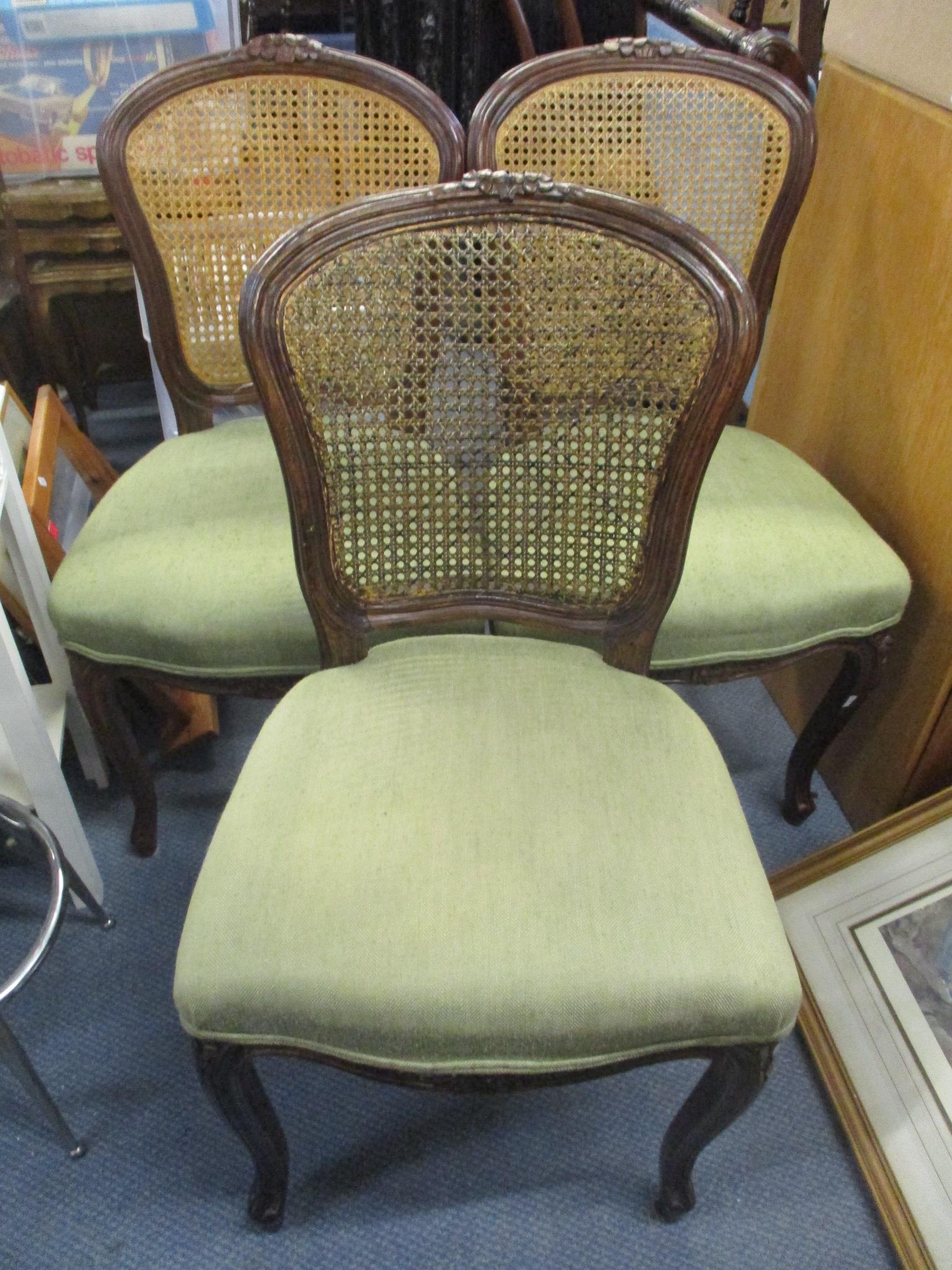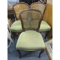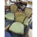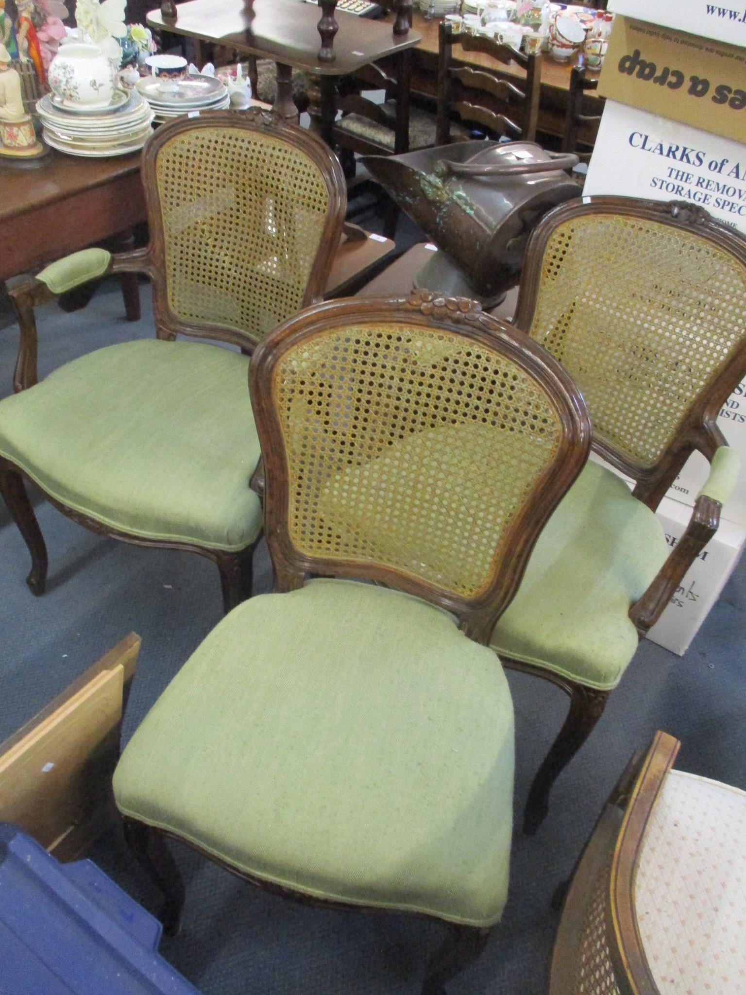 A set of six oak cane back dining chairs with carved floral top rails and on cabriole legs, two being carvers