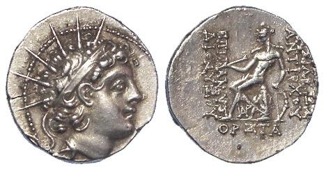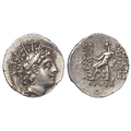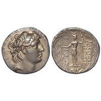 Ancient Greek: Seleucid Empire, Antiochos VI Dionysus (supported by general Diodotus Tryphon, nominal reign 145-142 BC, died aged 8 approx.) silver Drachm SE170 (143-2BC). Radiate and diademed head right. / Apollo seated left on omphalos, testing arrow and resting hand on bow; monogram between legs, OP (date) and ΣTA in exergue. 4.27g. EF, slightly off-centre.