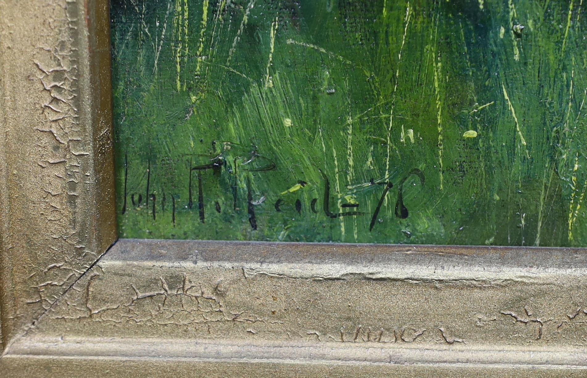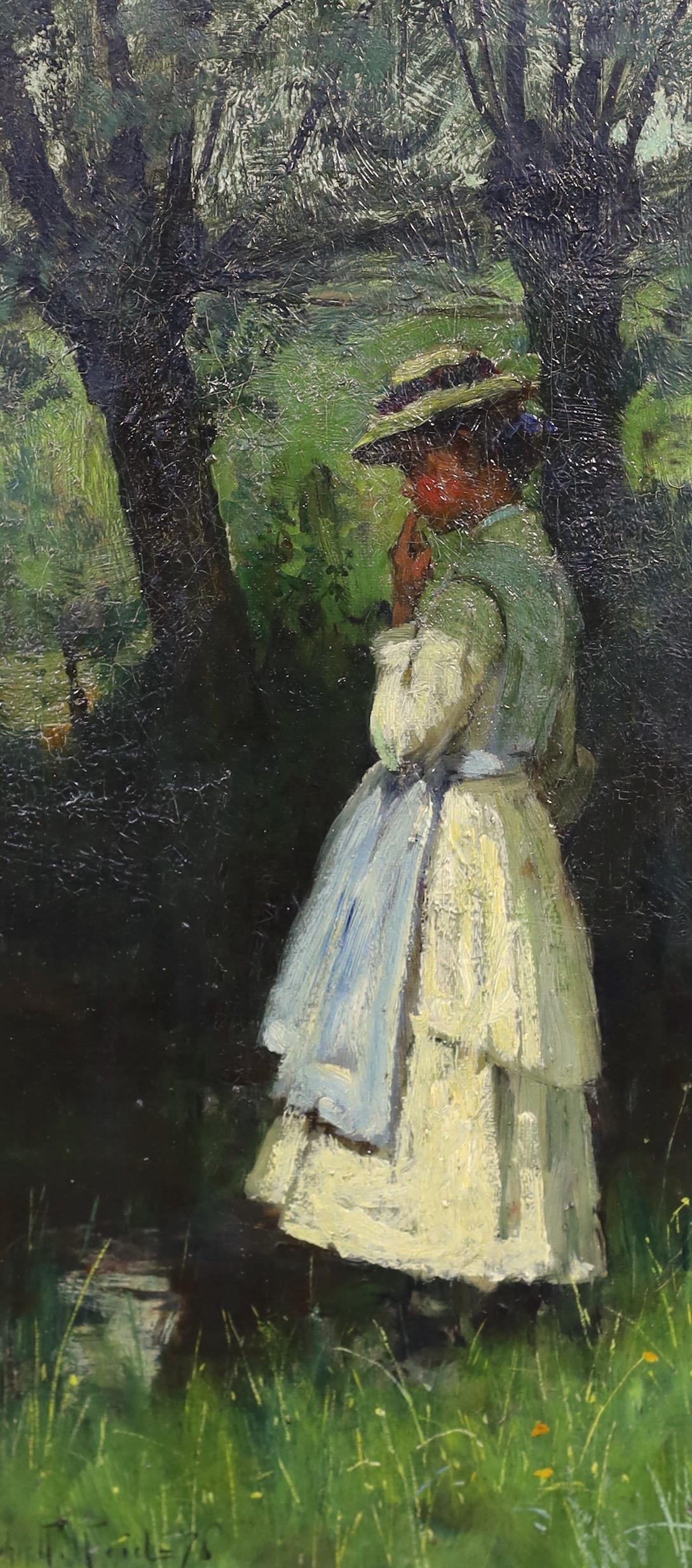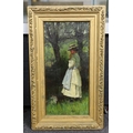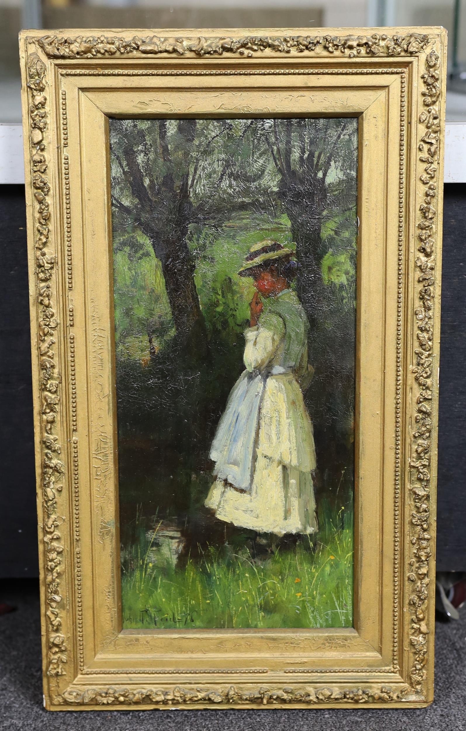 * * John Robertson Reid (Scottish 1851-1926), oil on canvas, Girl wearing a bonnet, in the shade of trees, signed and dated '76 36 x 17cm.