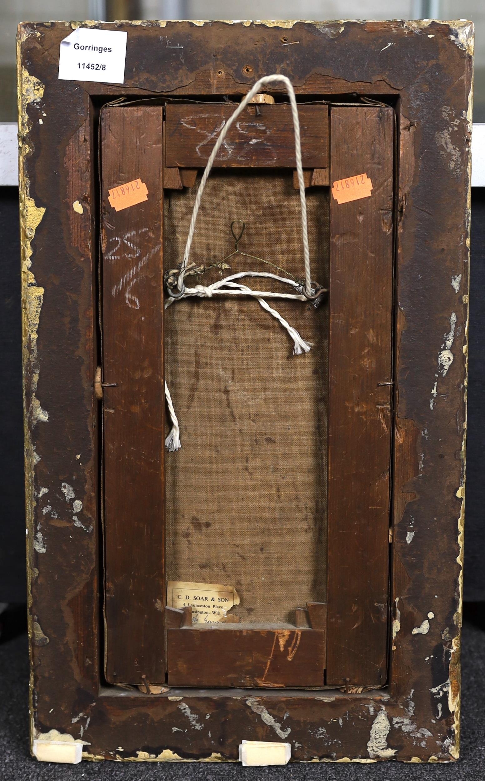 Oil on original canvas in good untouched condition, paint looks clean, a little slight fine craquelure running throughout, signed and dated lower left, housed in what looks to be the original gilt gesso frame which is now a little tatty and has been overpainted, possibly a tiny dent at the top of the trunk of the left hand tree, label for C.D. Soar & Son retained verso, inscribed Lady Goring.