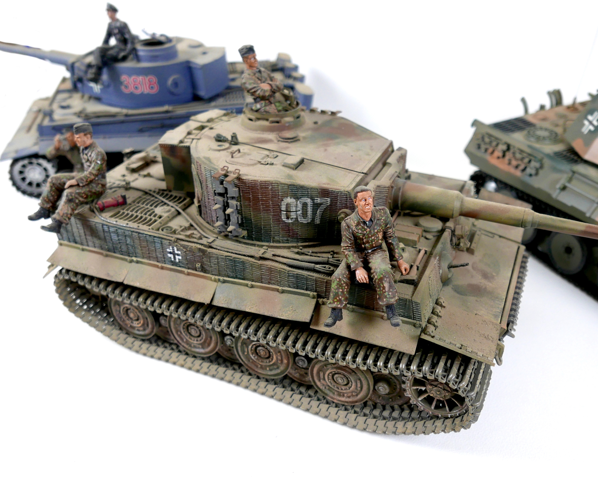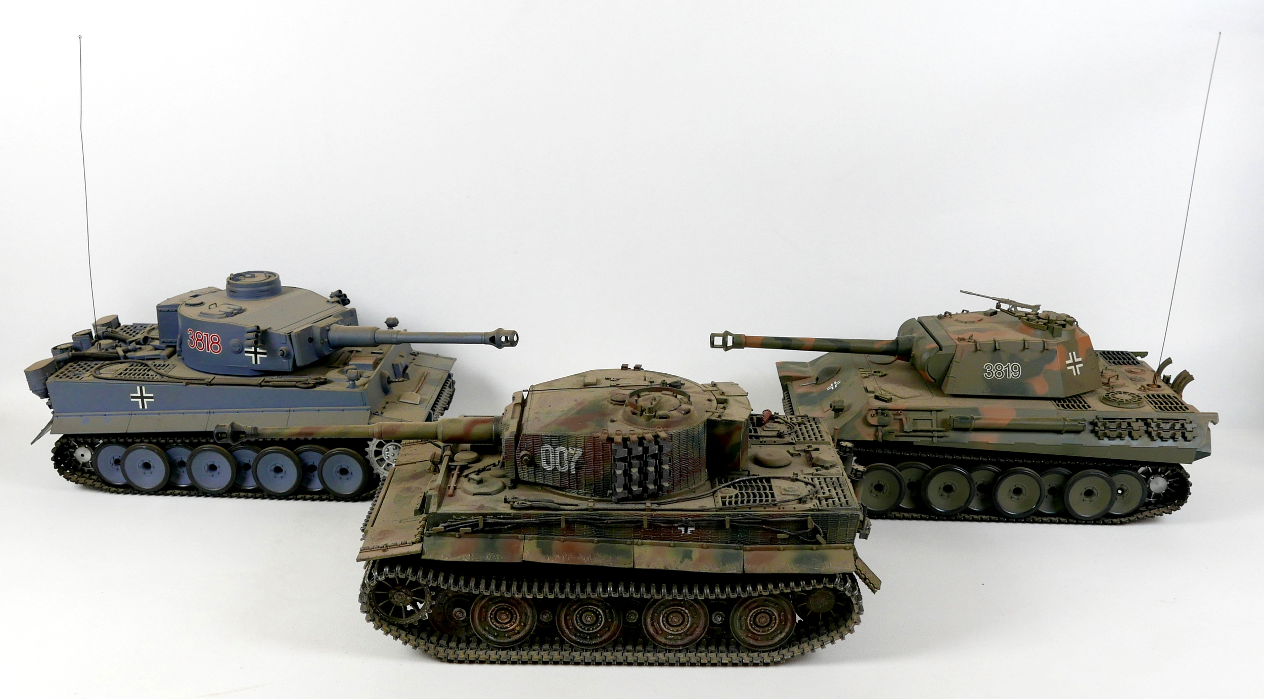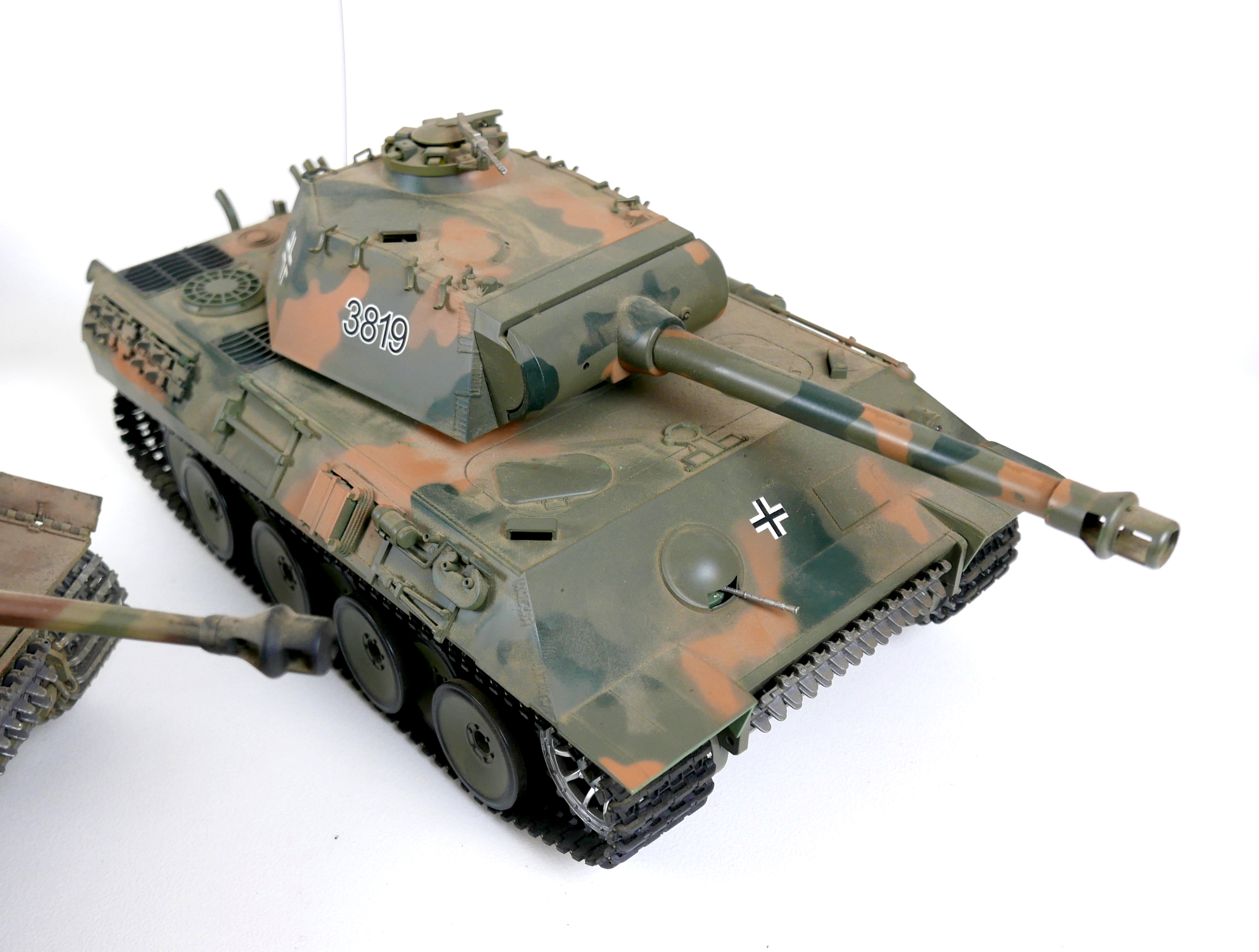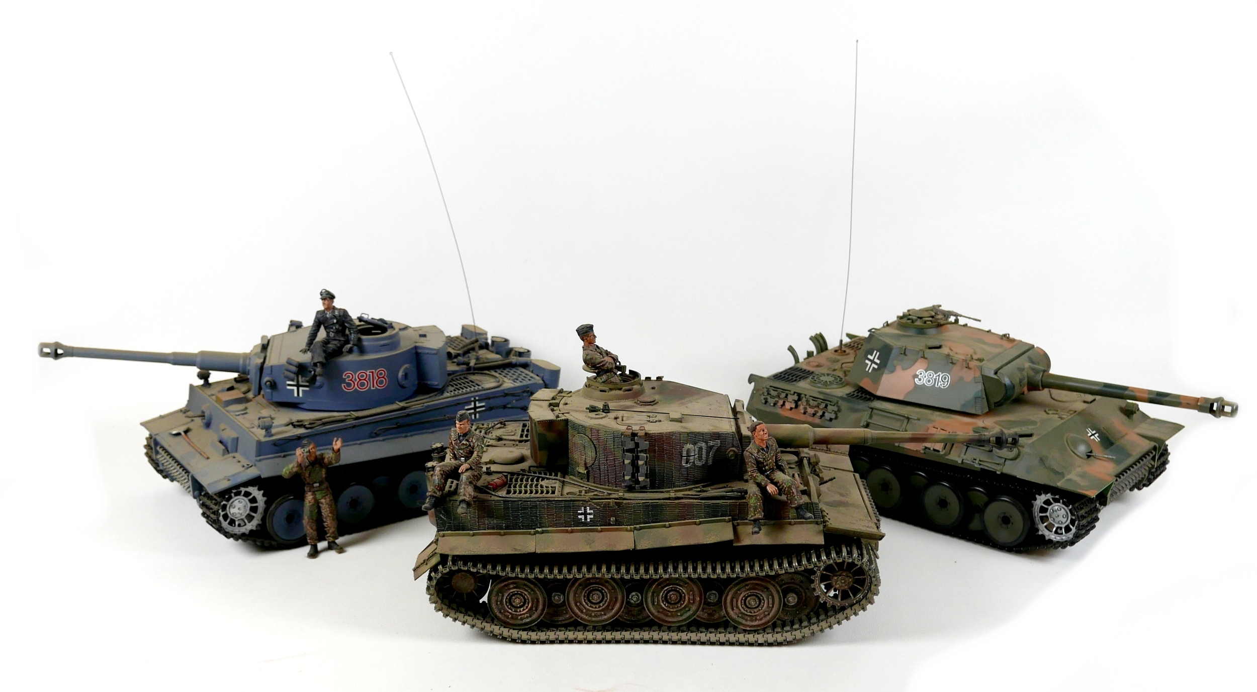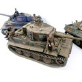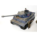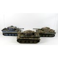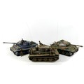 Three model WWII German tanks, two 1/16 scale HengLong radio controlled tanks, a/f missing controllers, and a third display model with accompanying figures. (3)
