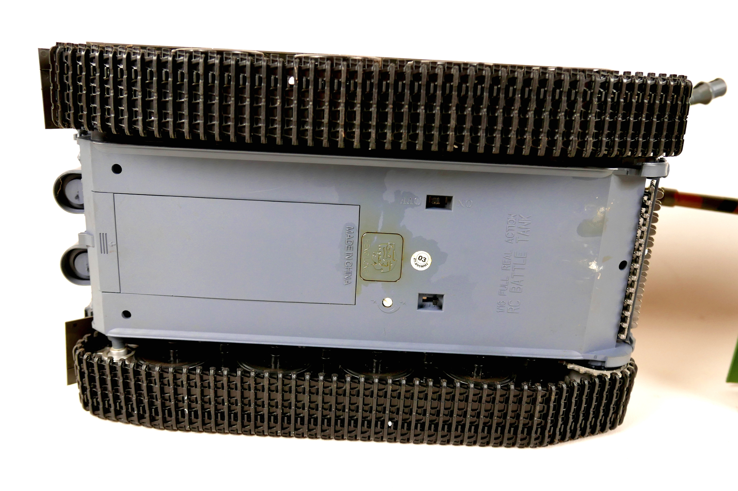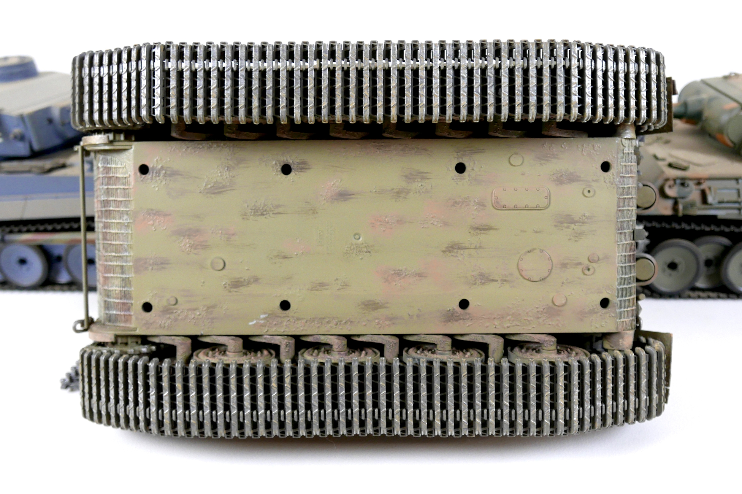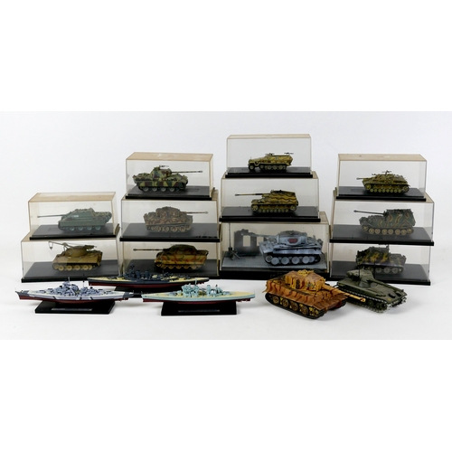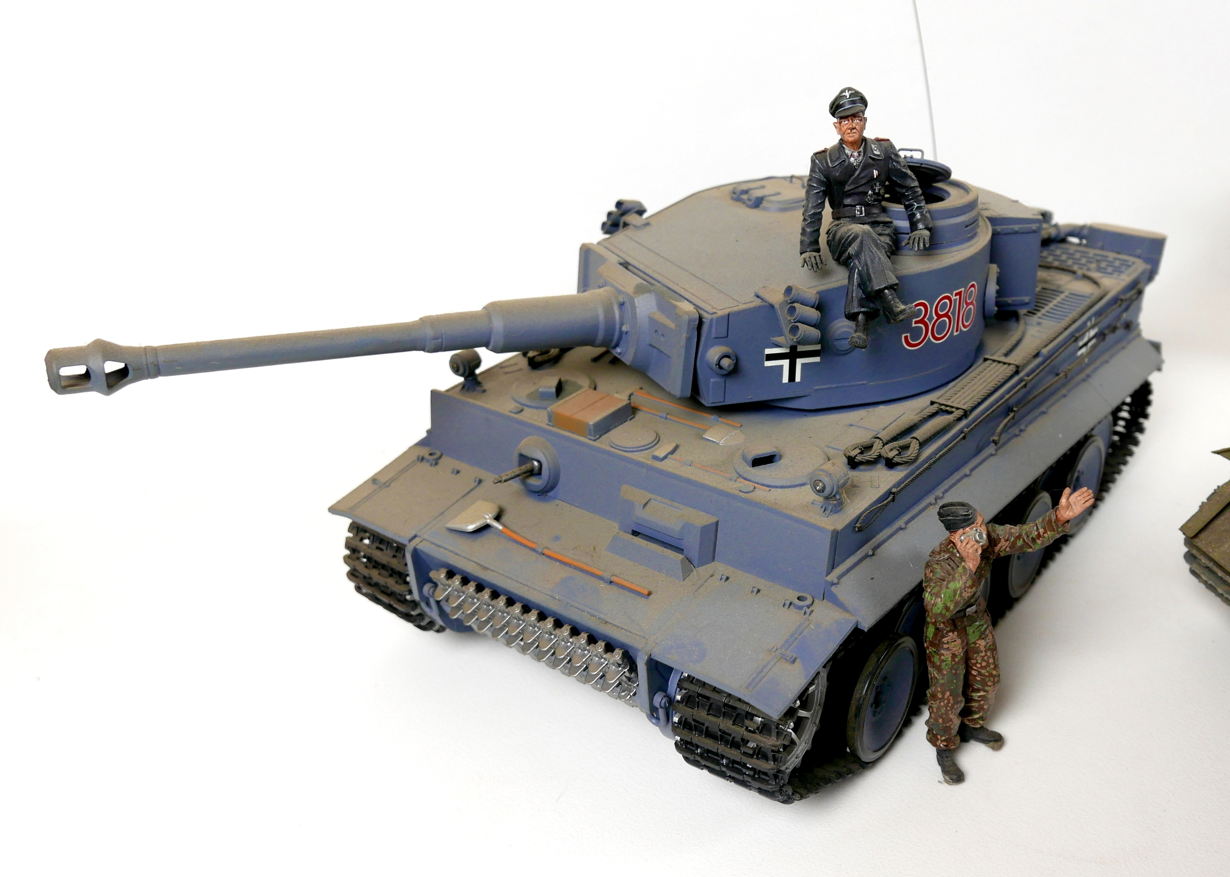 Three model WWII German tanks, two 1/16 scale HengLong radio controlled tanks, a/f missing controllers, and a third display model with accompanying figures. (3)
