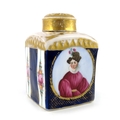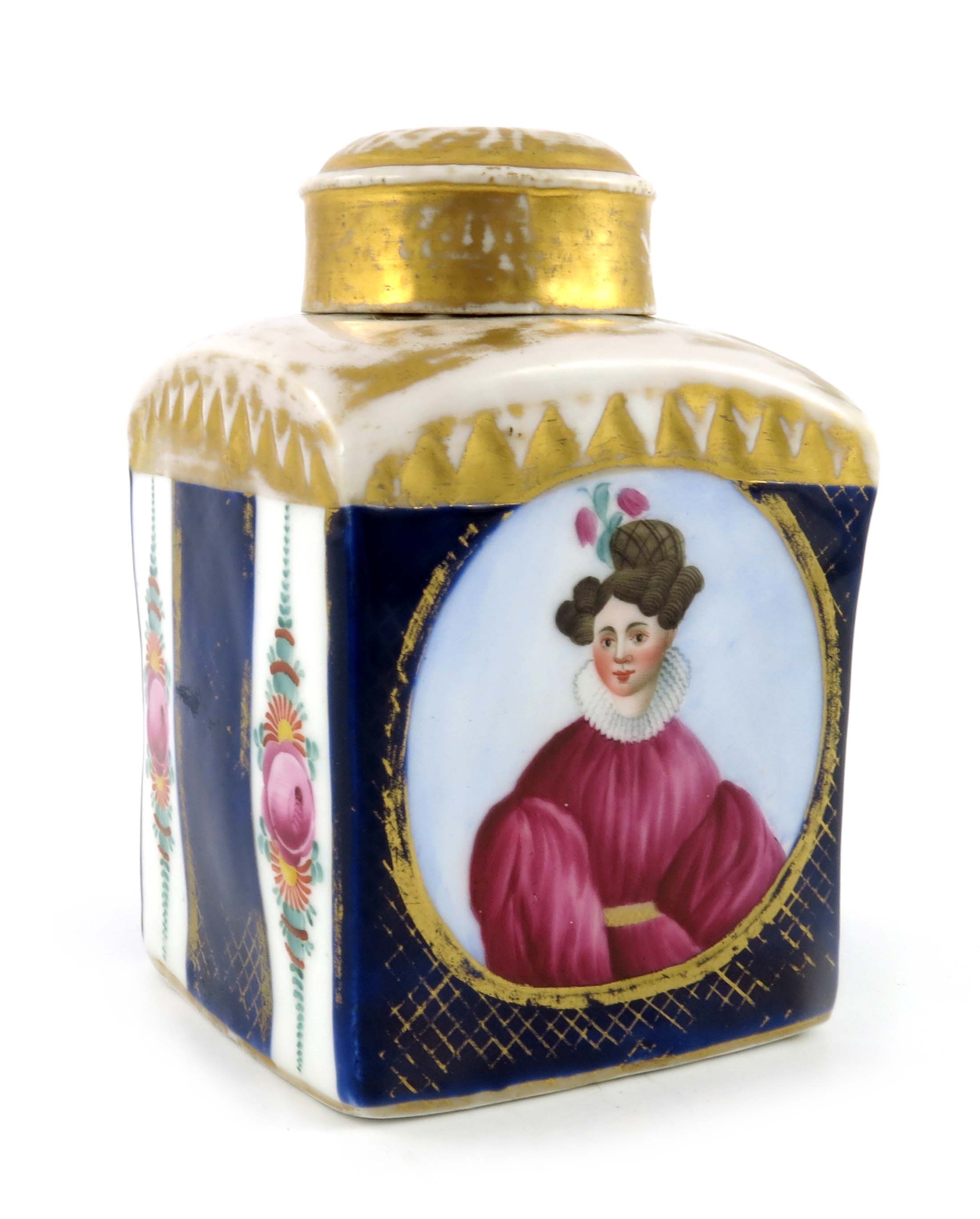 A mid 19th Century Russian hard paste tea canister and cover, of square section, painted with a circular portrait of a young lady wearing a pink dress and rough, on a cobalt blue reserve ground, gilt detailing, H mark, height 13.5cm