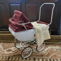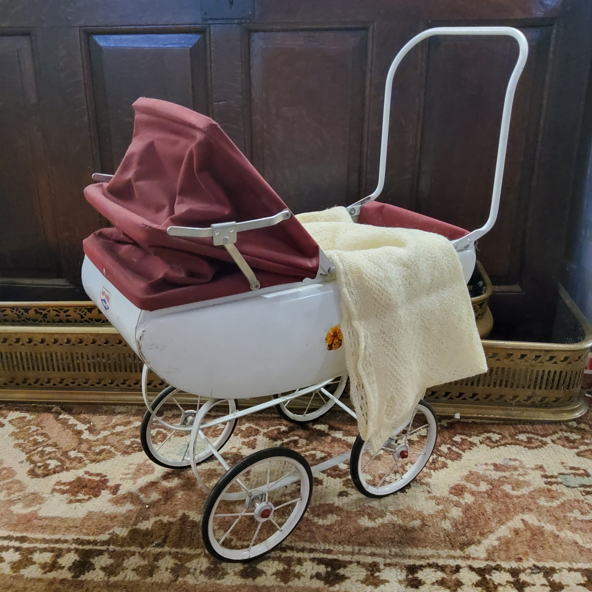 A Tri-ang childs sprung pram, white with burgandy cover c.1950s