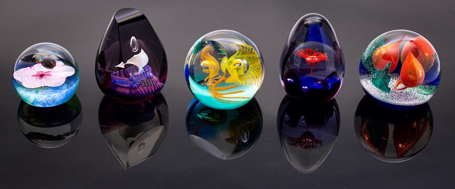 Five Caithness paperweights comprising, a Dragon Fly Weight, numbered 115/500; Accord, numbered 306/750; Fire Birds, numbered 157/500; Jack in the Box, numbered 1218; and Ascension.