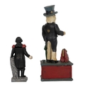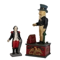 Two novelty money boxes. Uncle Sam, cast metal with polychrome finish, mechanical, upon pressing the button hand lowers, mouth moves and bag opens. H 29cm; Also a small figure of General Washington. Cast metal with polychrome finish, slot in back for money, H 16cm. (2)