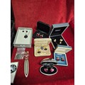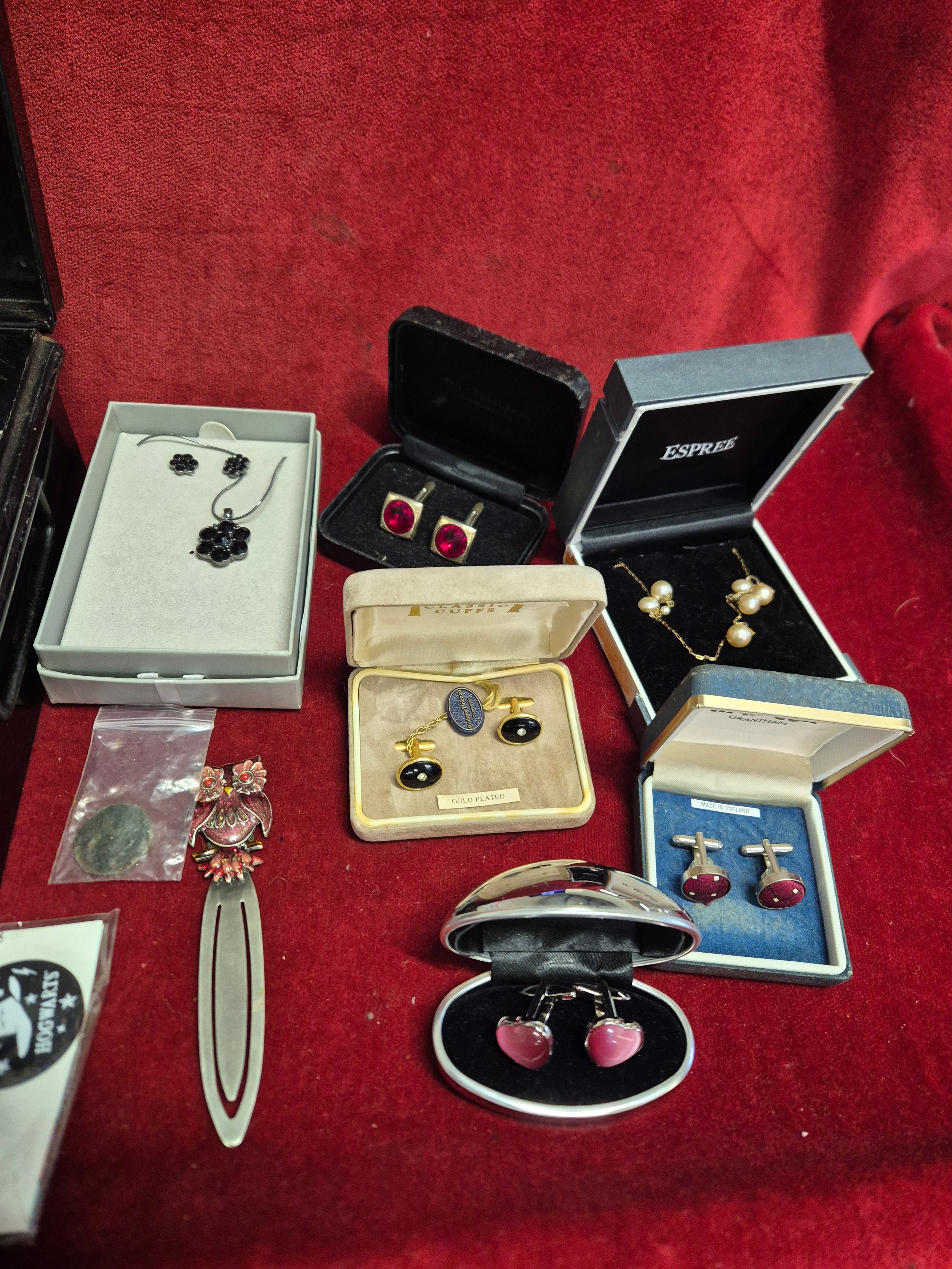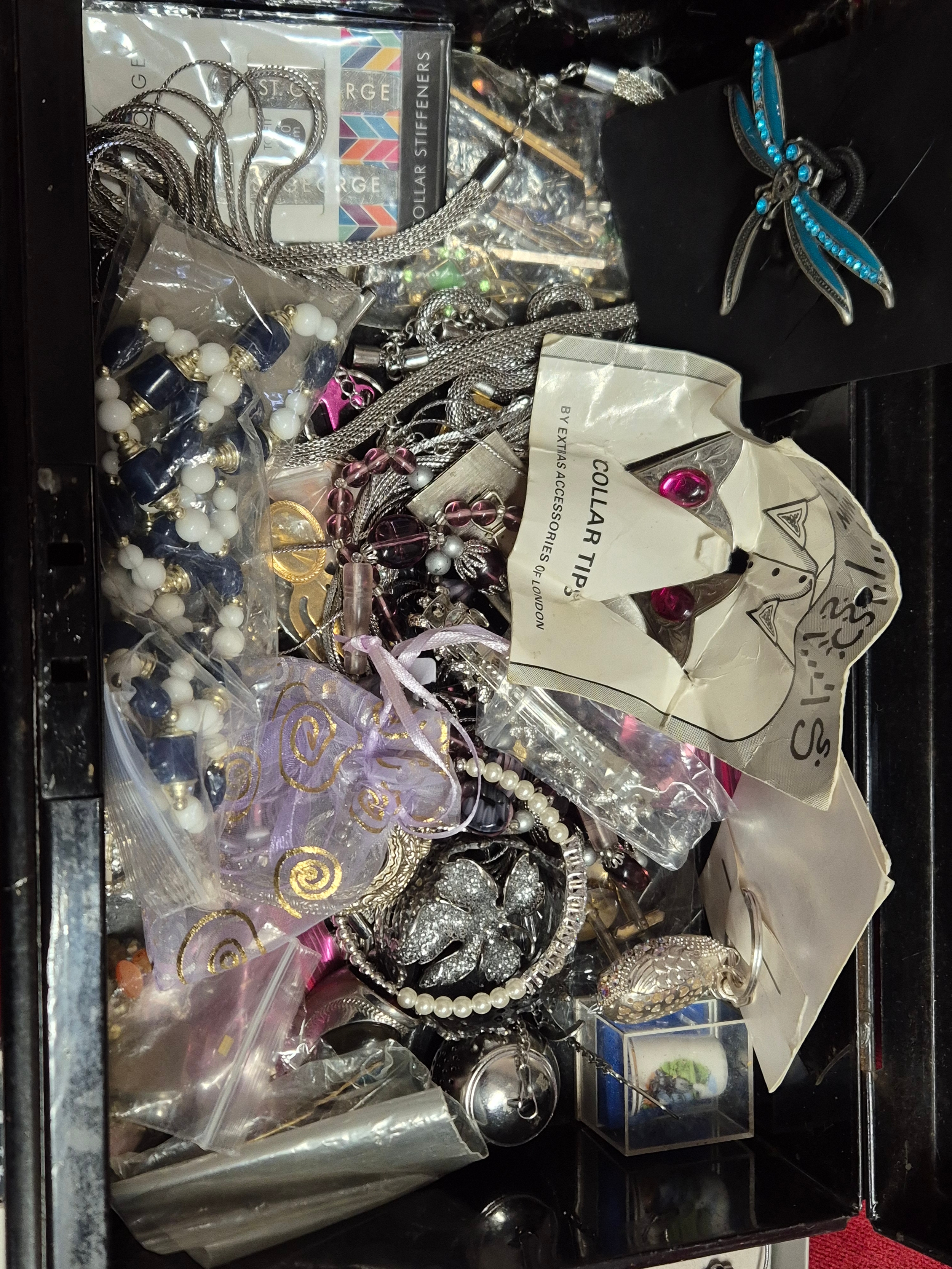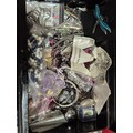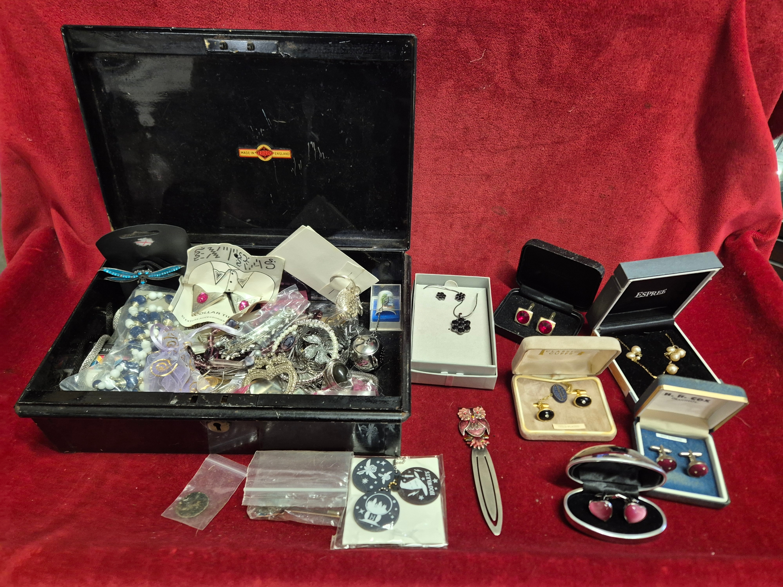 Vintage metal cash tin with contents of mixed costume jewellery
