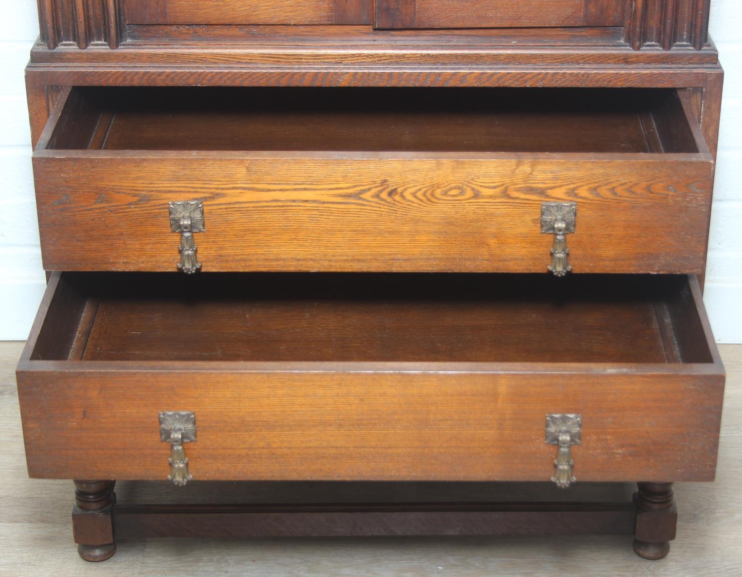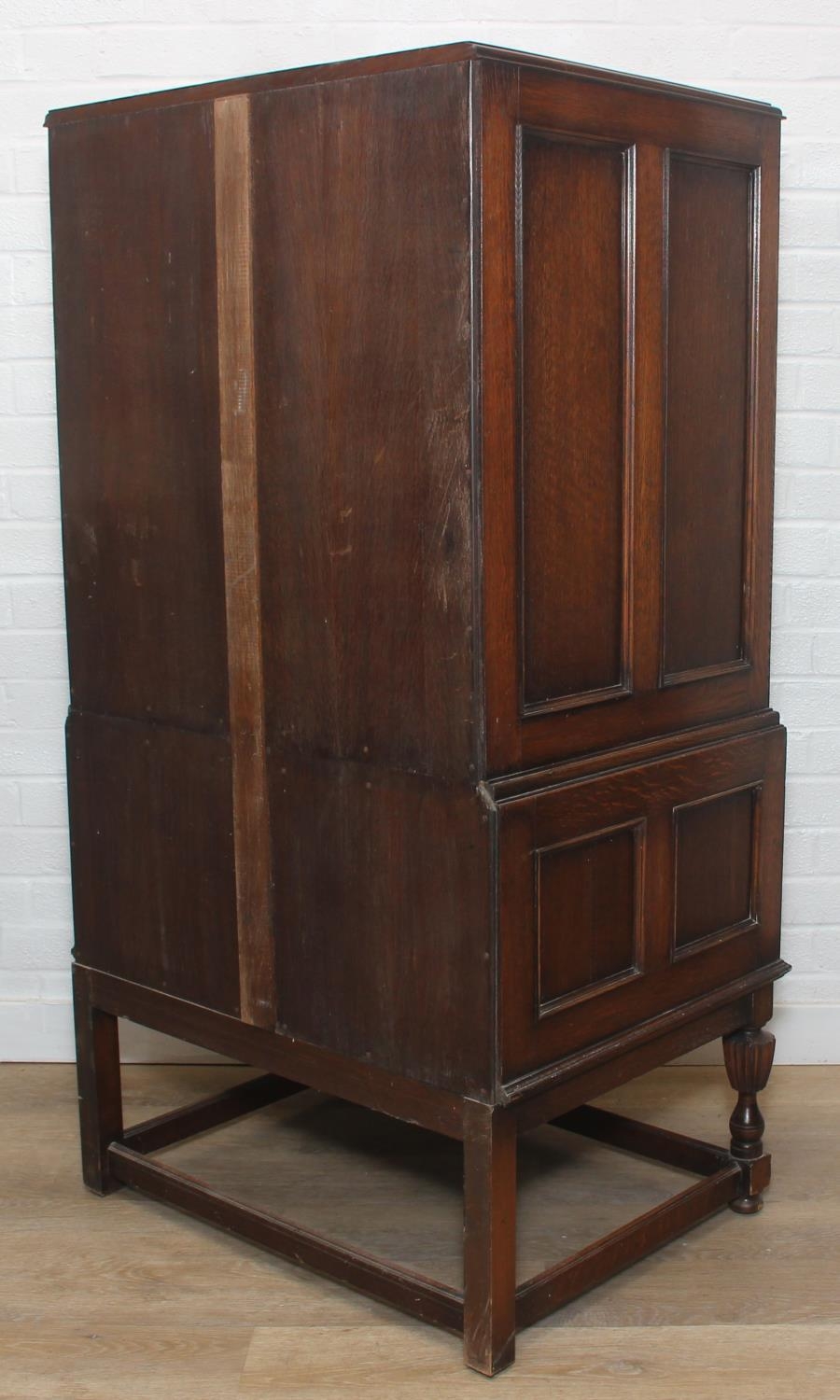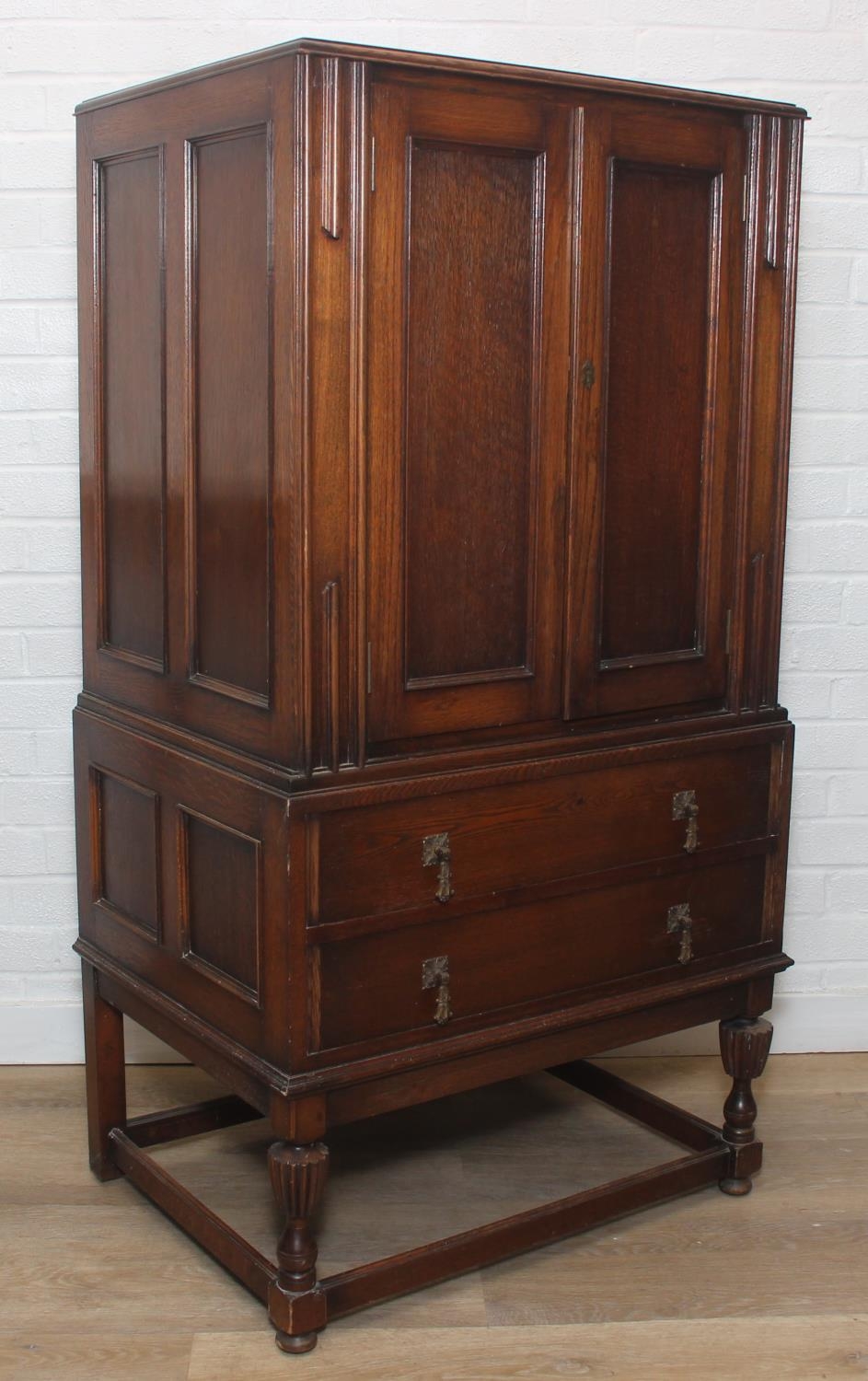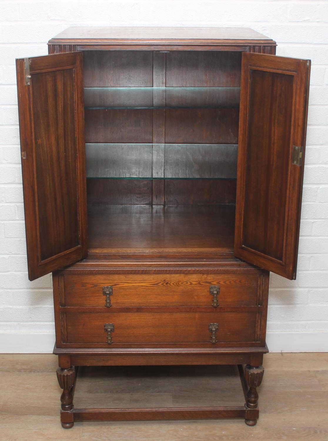 Vintage oak tallboy compromising cupboard with two glass shelves over two drawers, 68cm x 44cm x 34cm