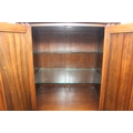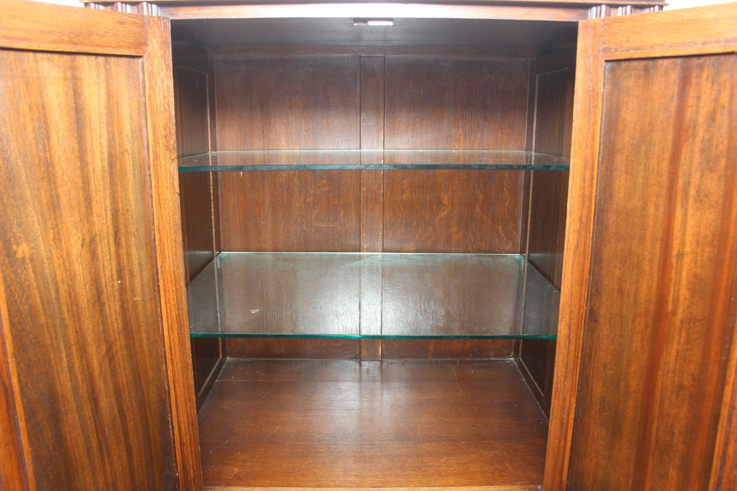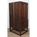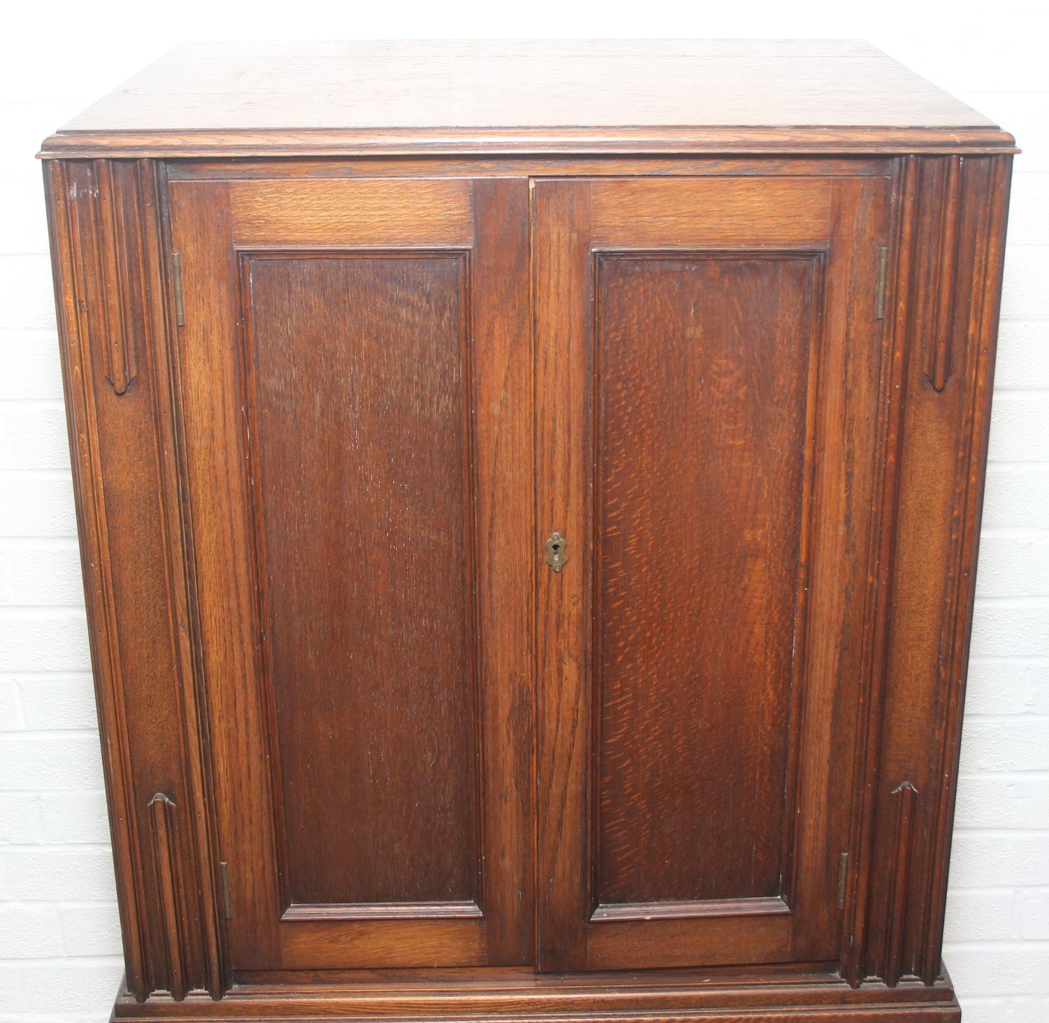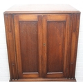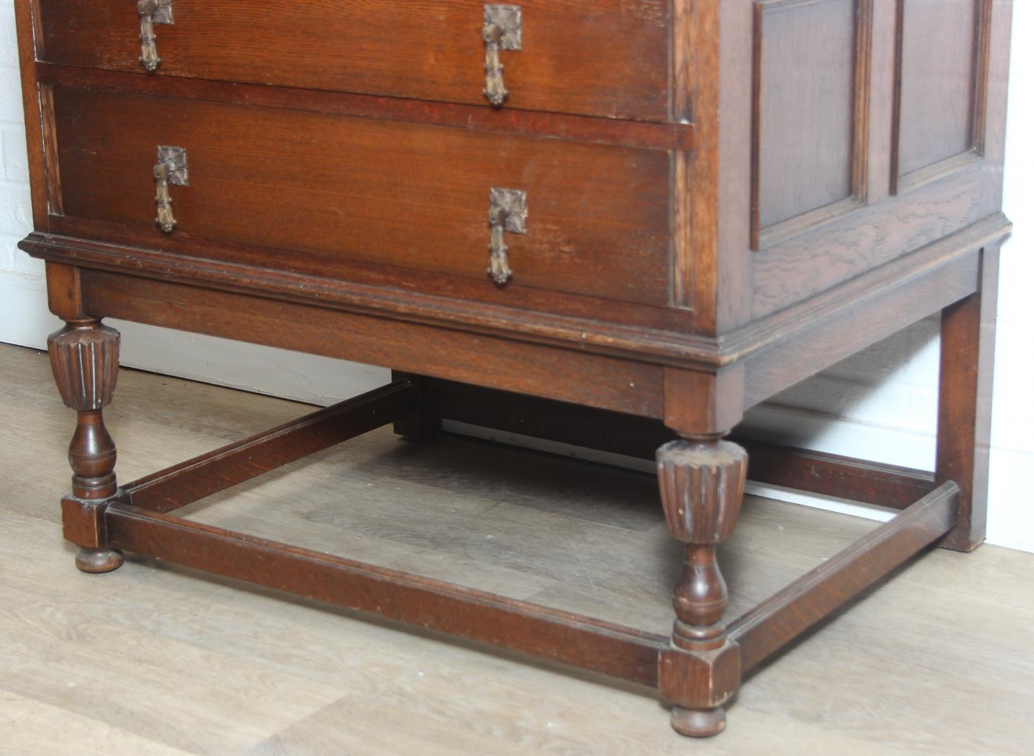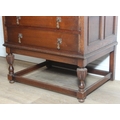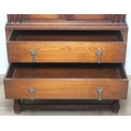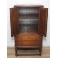 Vintage oak tallboy compromising cupboard with two glass shelves over two drawers, 68cm x 44cm x 34cm