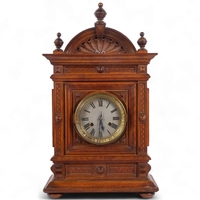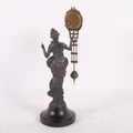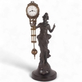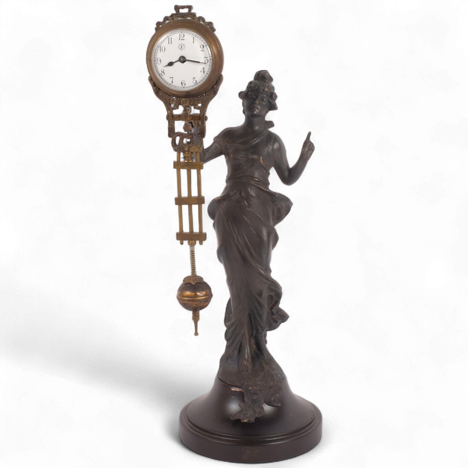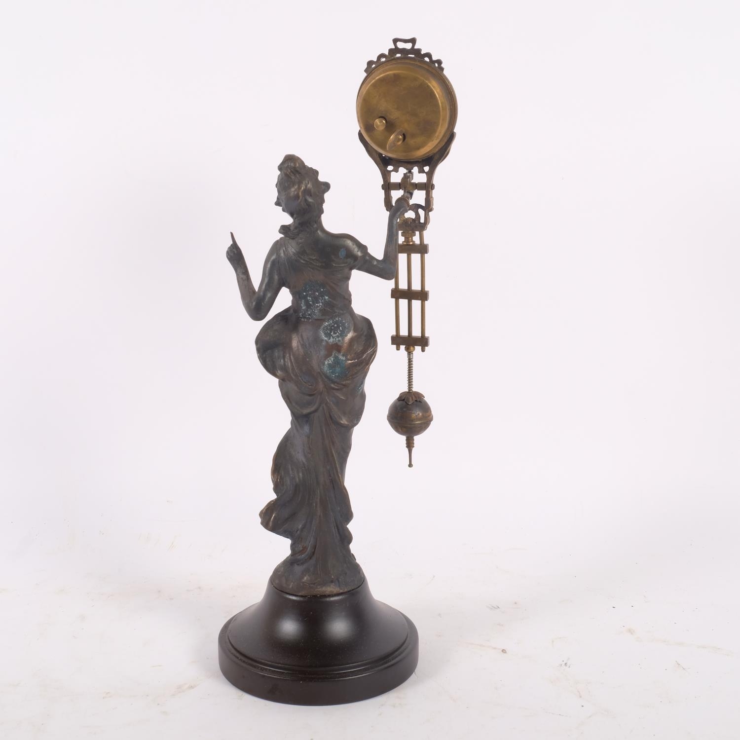 A reproduction bronze Art Nouveau style lady mystery clock, on turned wood plinth, height overall 33cm
