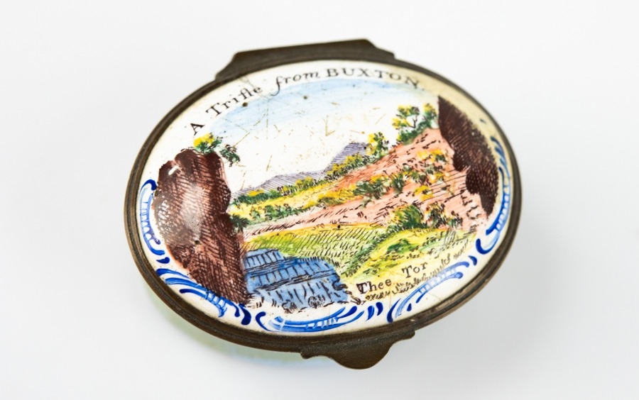 18TH CENTURY OVAL ENAMEL PATCH BOX painted in colours with a craggy landscape and inscribed "A Trifle from Buxton", some surface marks/scratches, pale blue base some discolouration, mirror fair, 1⅞" wide (4.8cm)