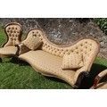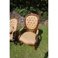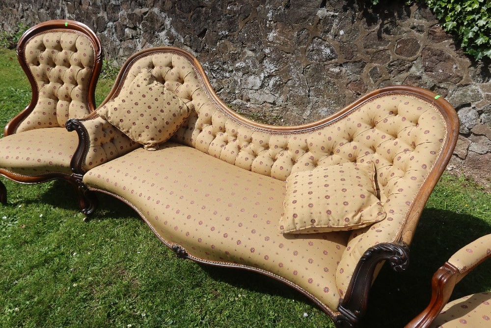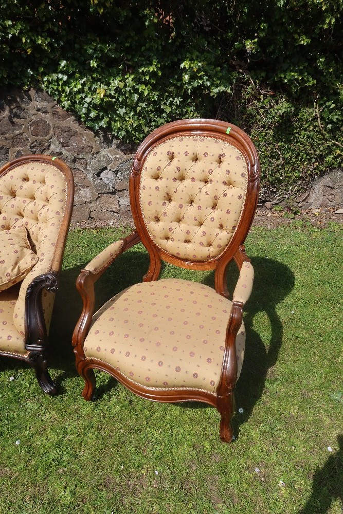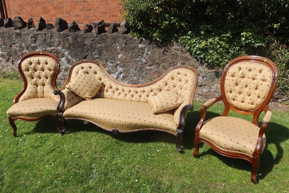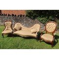 A Victorian Saloon suite comprising spoon back settee open arm chair and easy chair