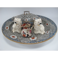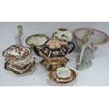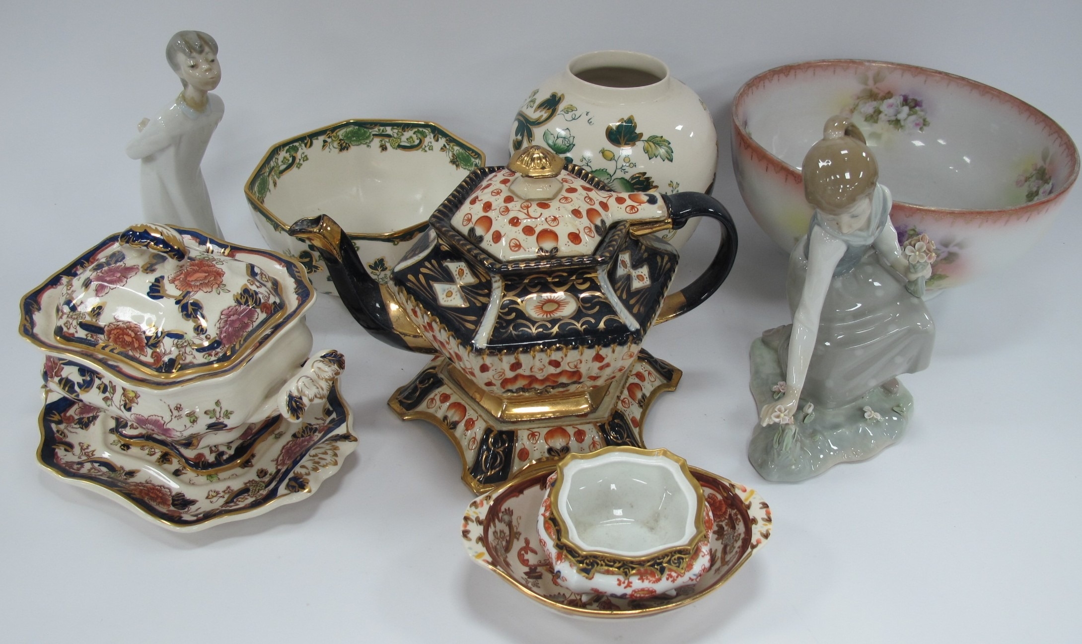 Lladro Figurine of a Girl Picking Flowers, Masons Mandalay tureen on stand, XIX Century Imari pattern teapot on stand, etc:- One Tray.